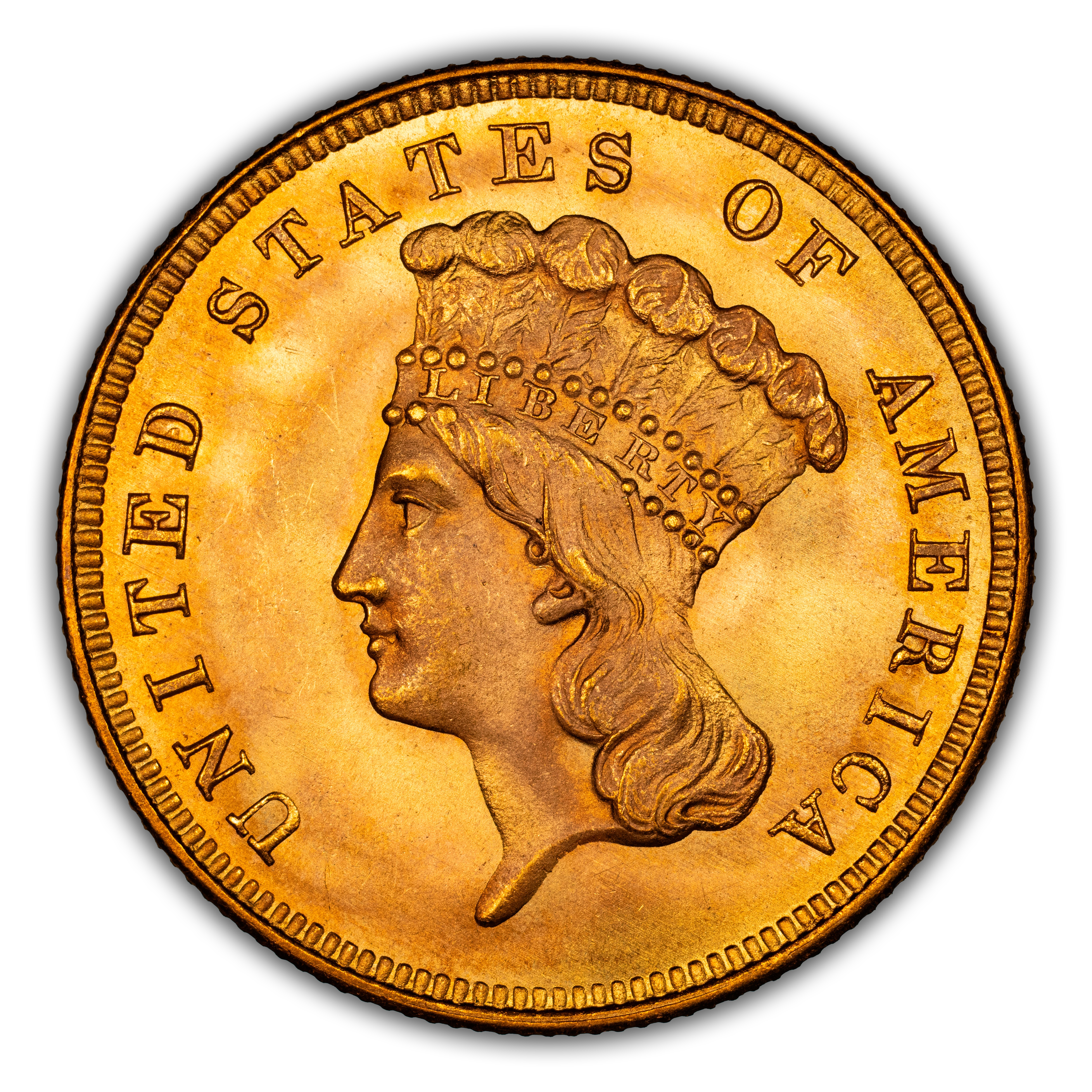 Reverse: "3 DOLLARS" is centered with date below, surrounded by a large wreath tied in a bow at the bottom.