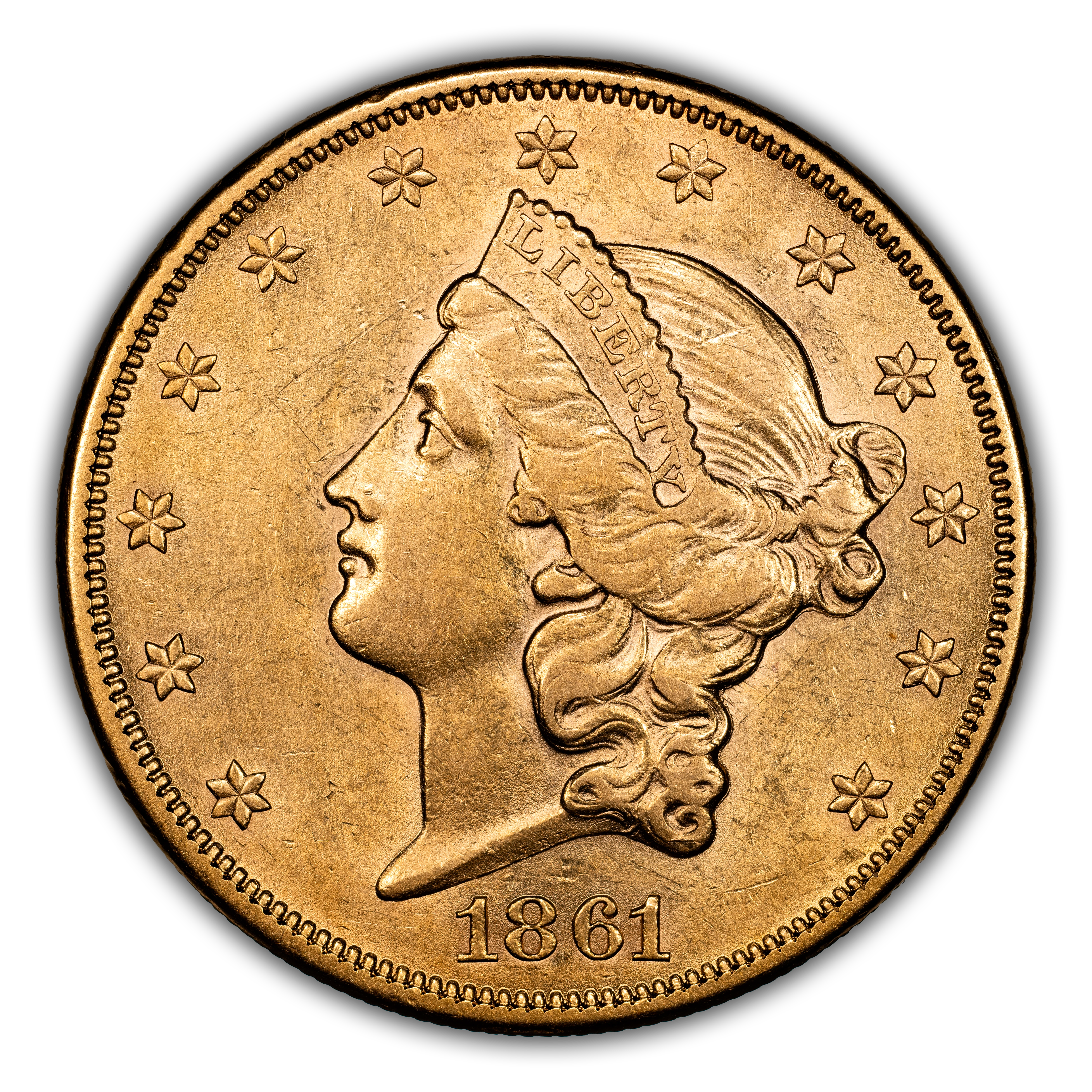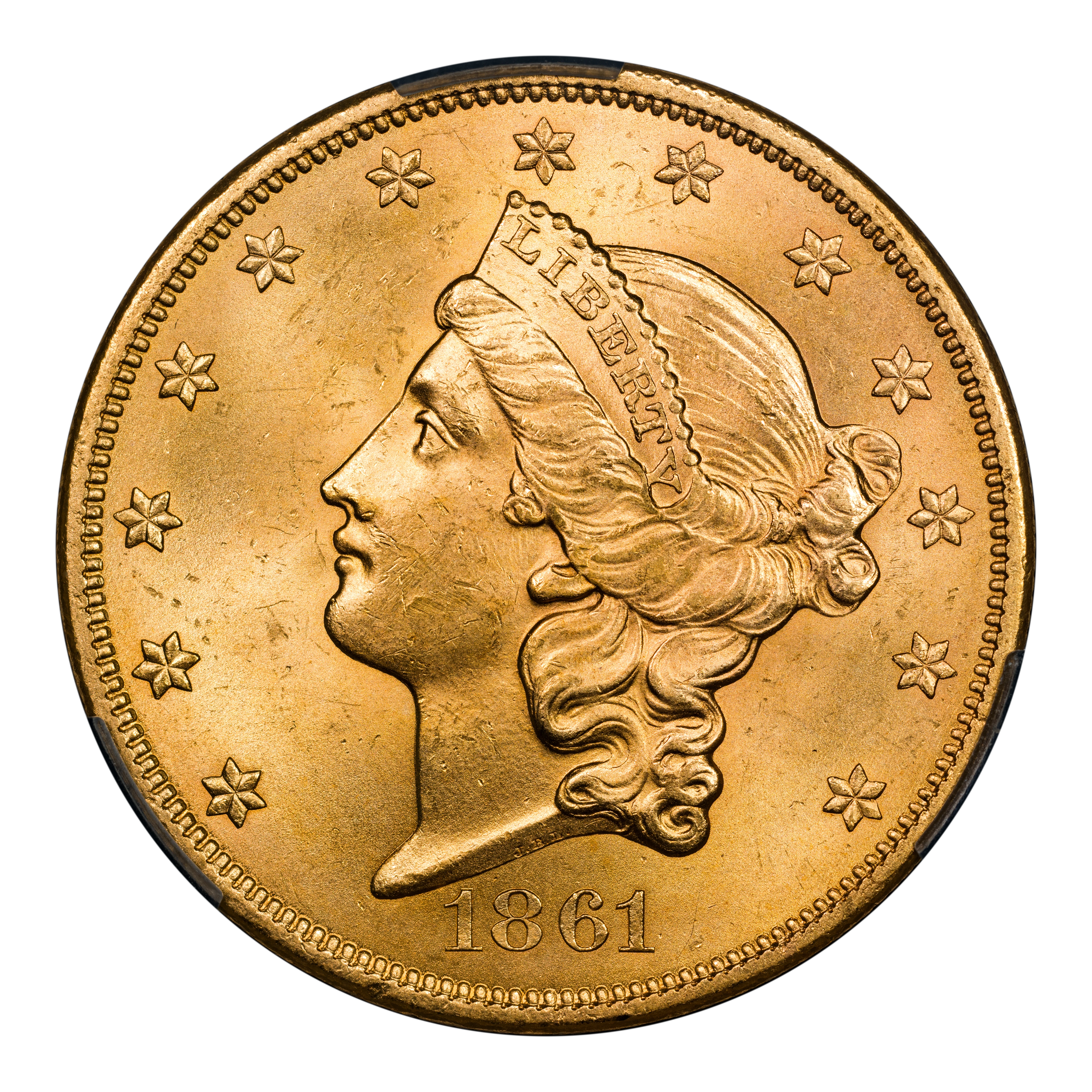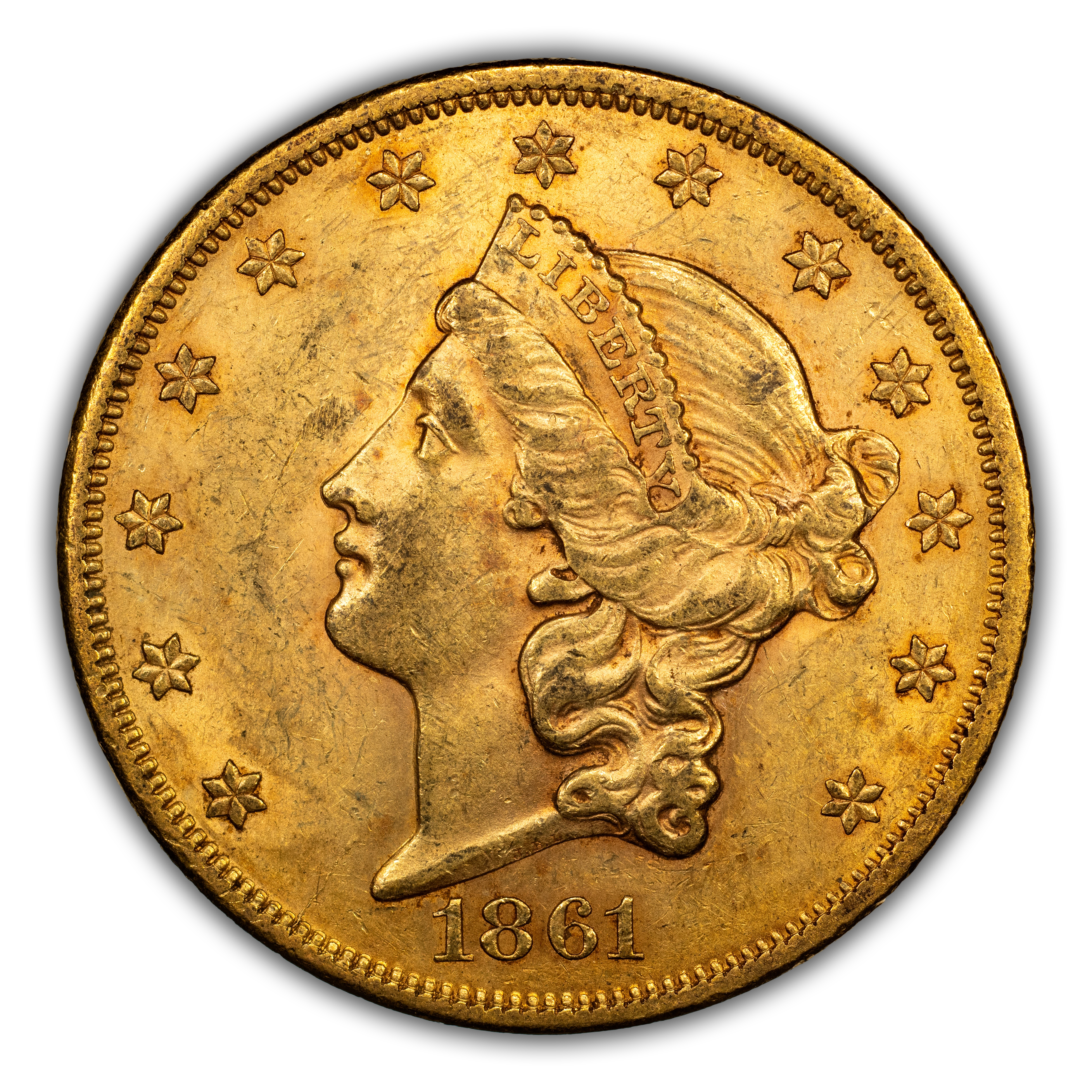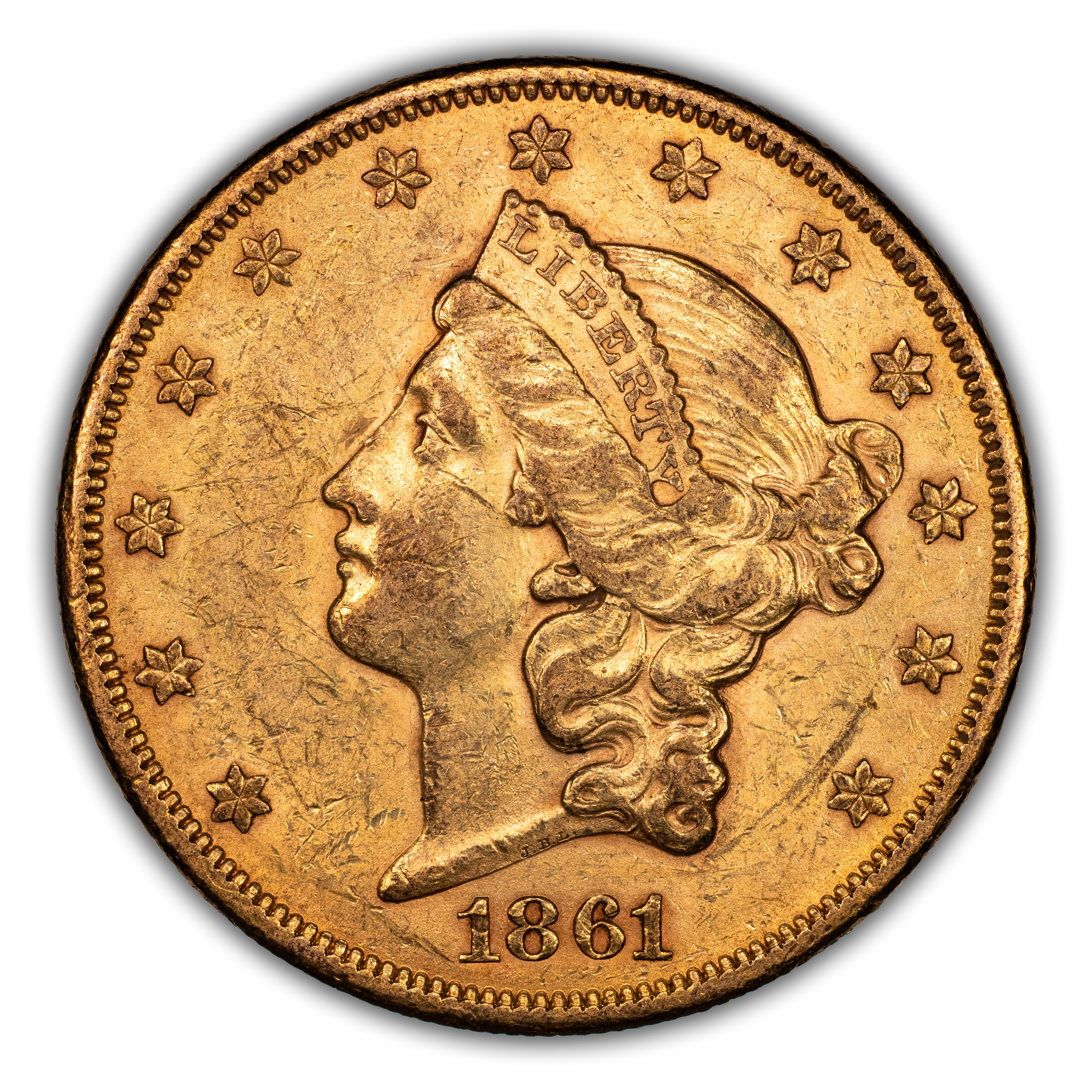 Reverse: Shielded eagle with wings outstretched holding arrows and olive branches. The words UNITED STATES OF AMERICA * TWENTY D. appear around the periphery. Mint mark, if any, appears below the eagle's tail, above the N in TWENTY.