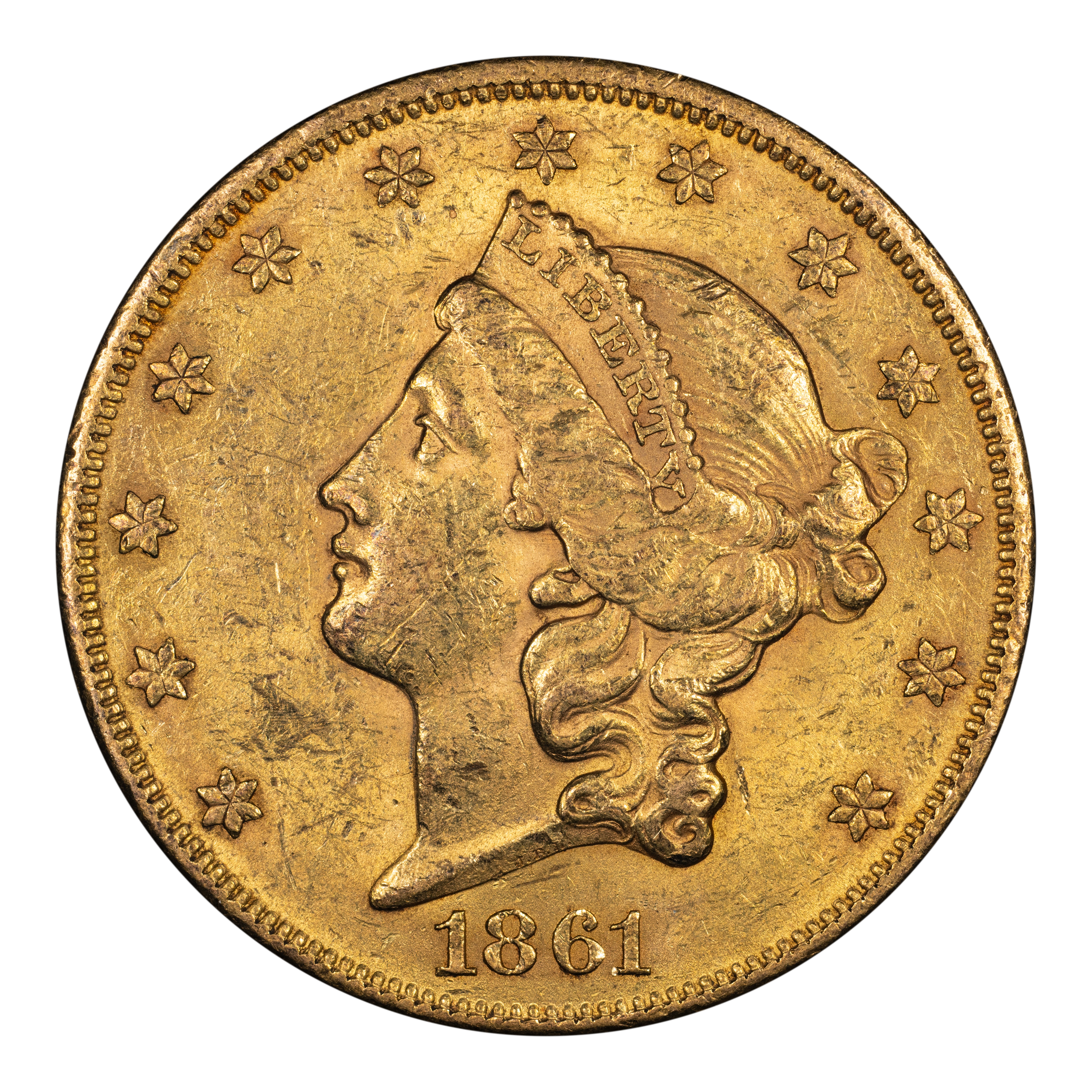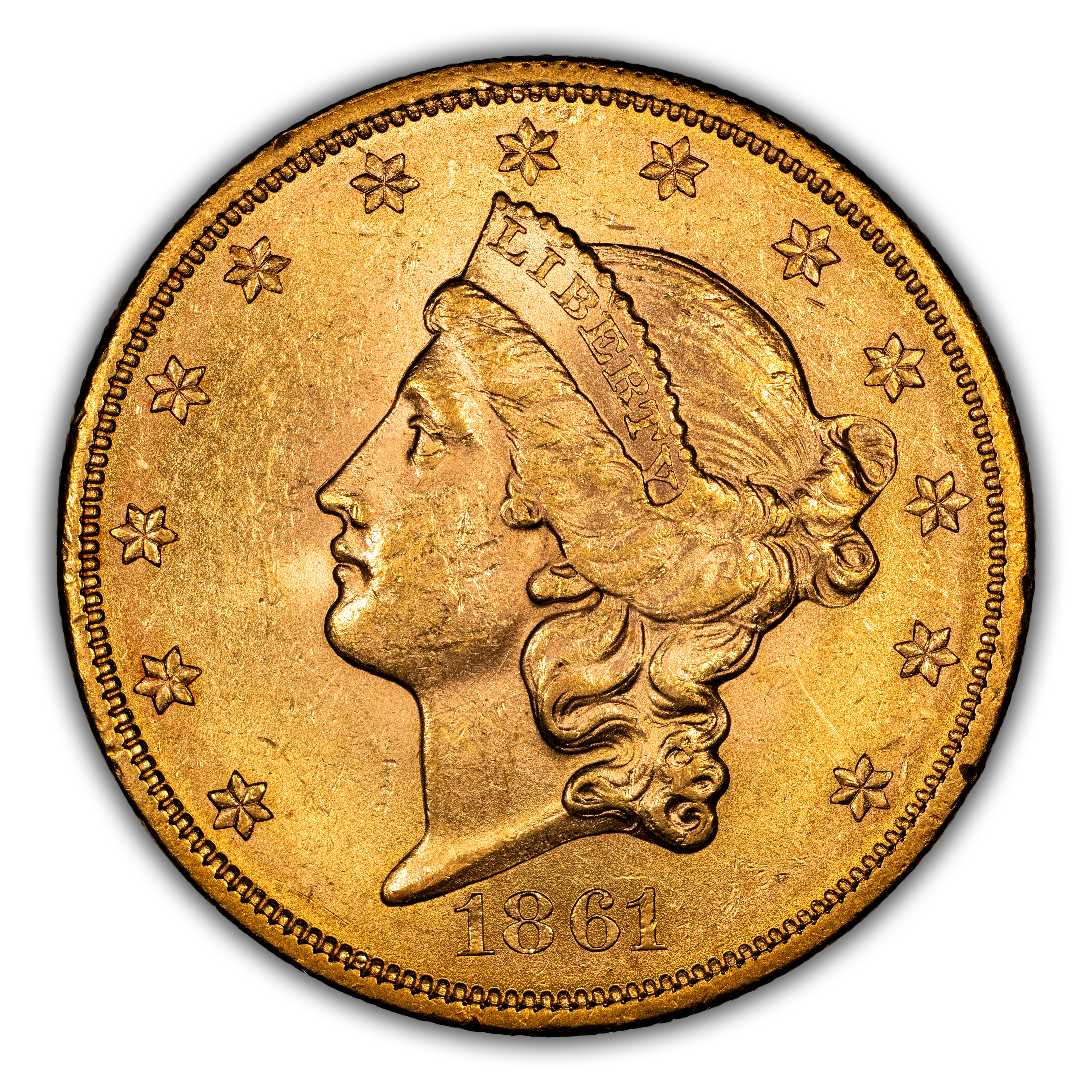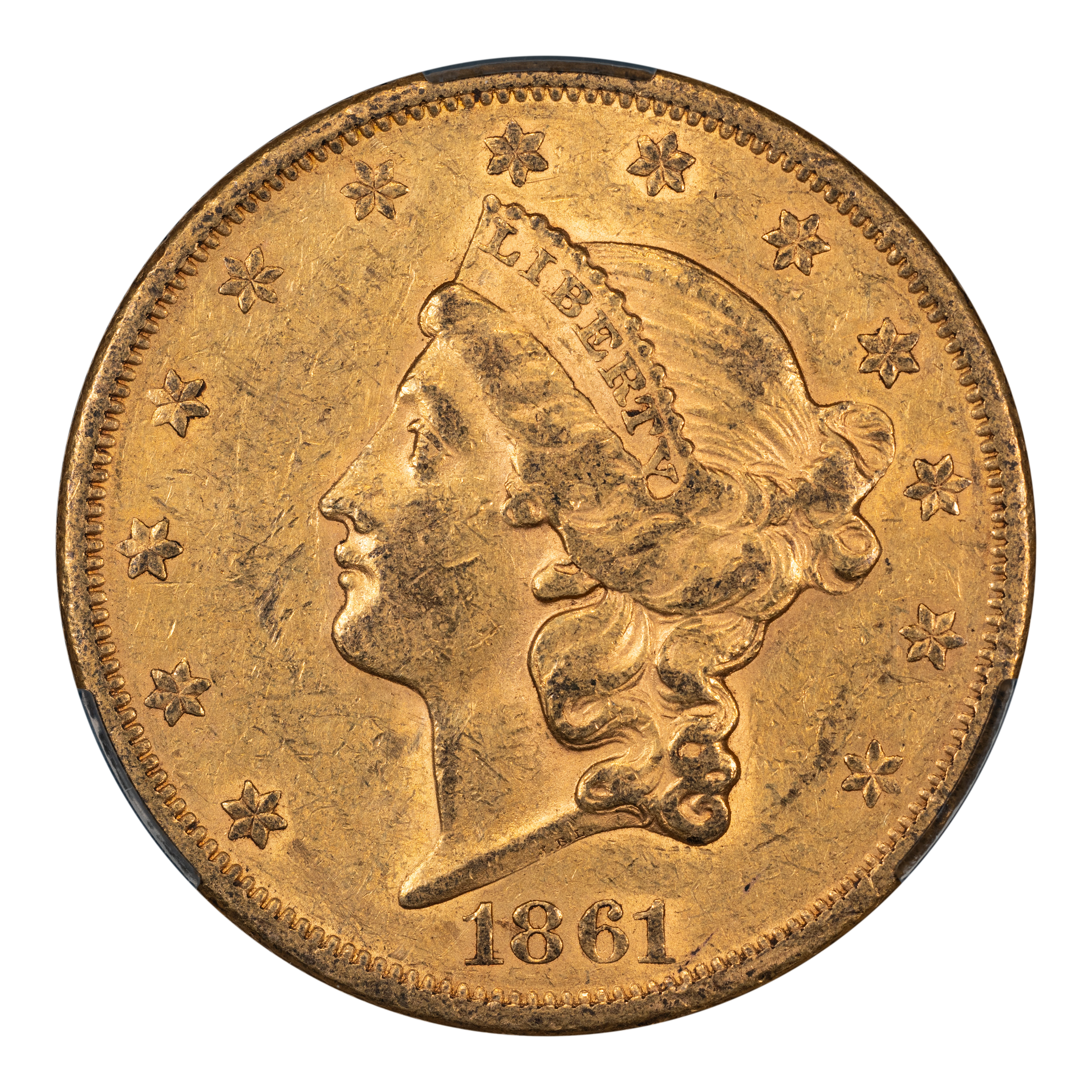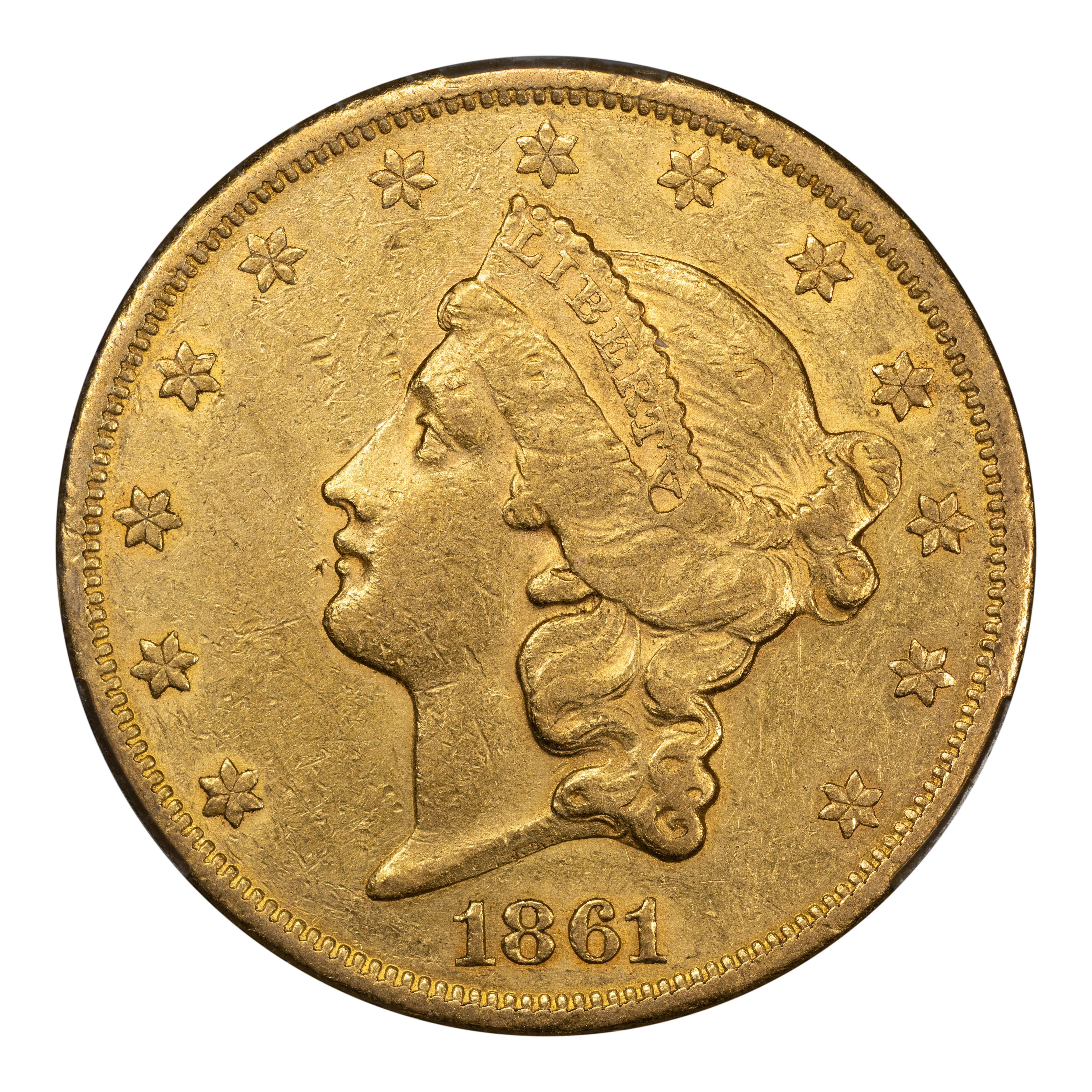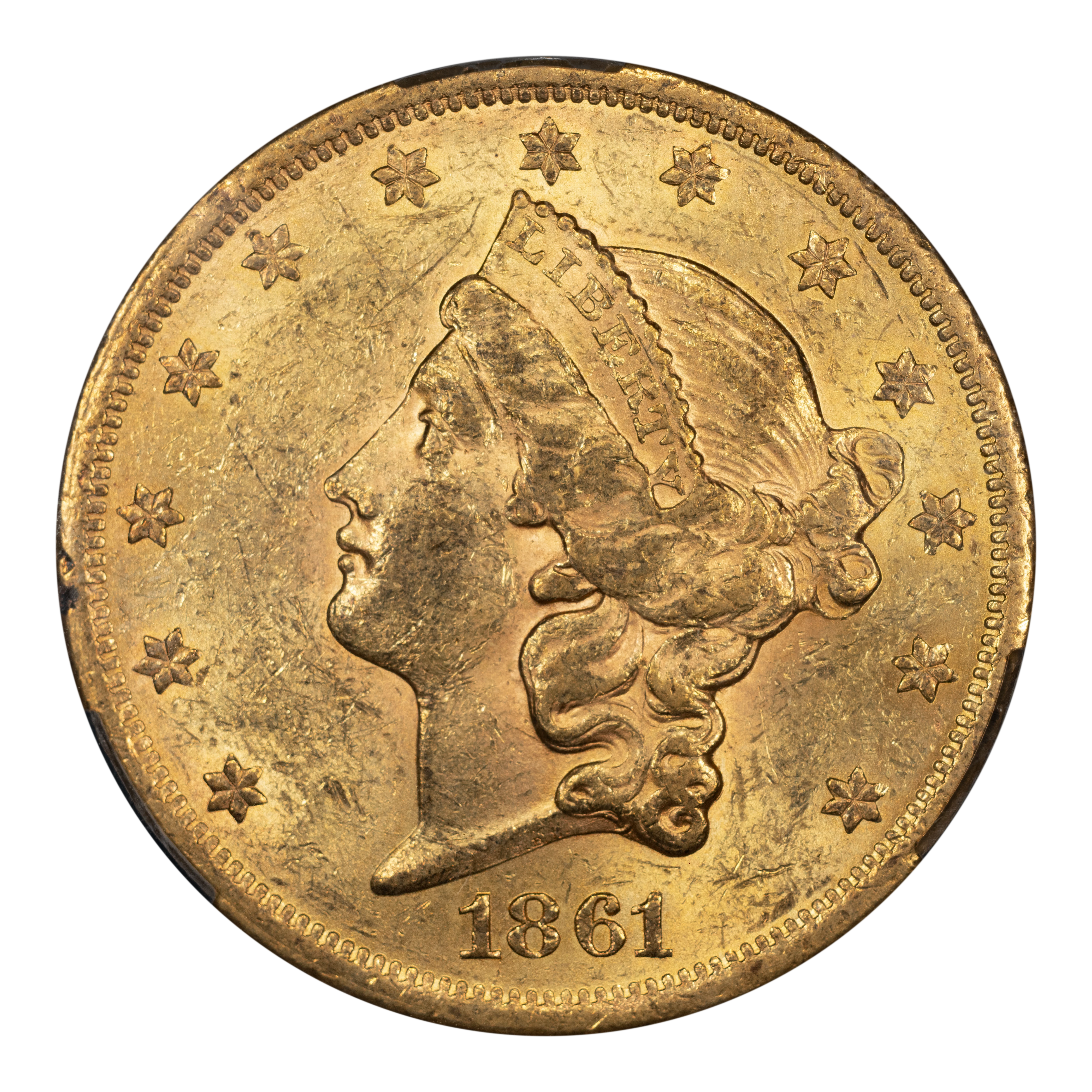 Reverse: Shielded eagle with wings outstretched holding arrows and olive branches. The words UNITED STATES OF AMERICA * TWENTY D. appear around the periphery. Mint mark, if any, appears below the eagle's tail, above the N in TWENTY.