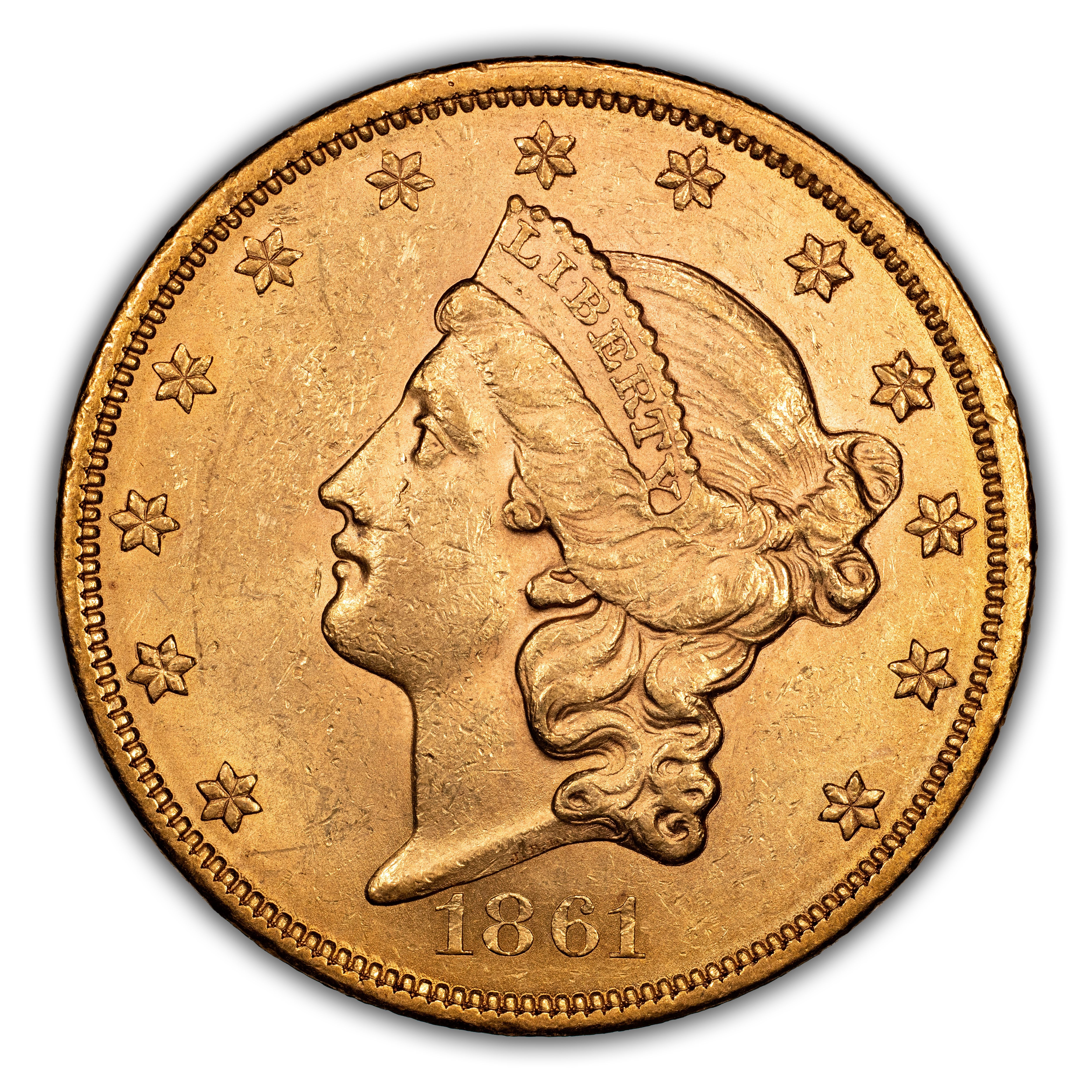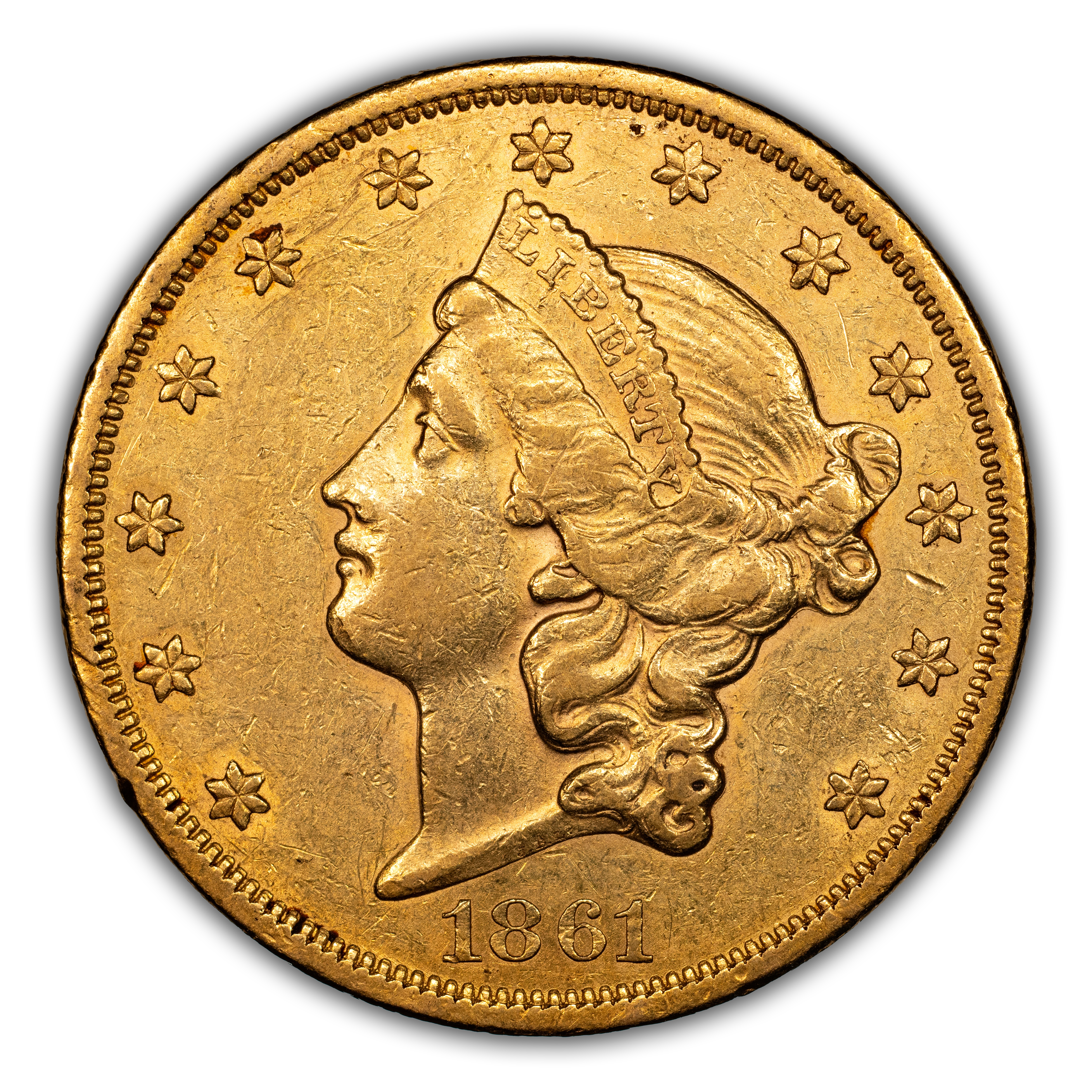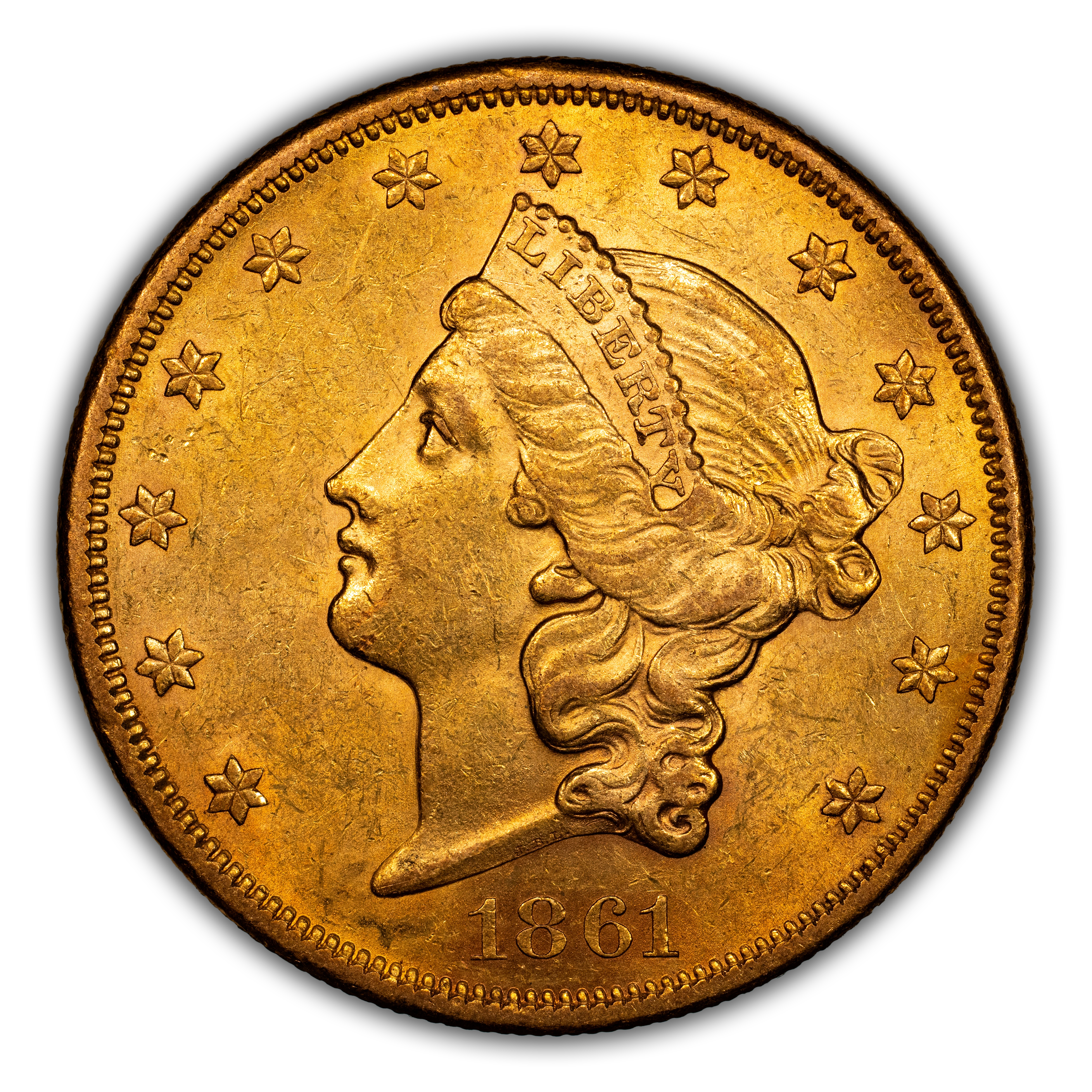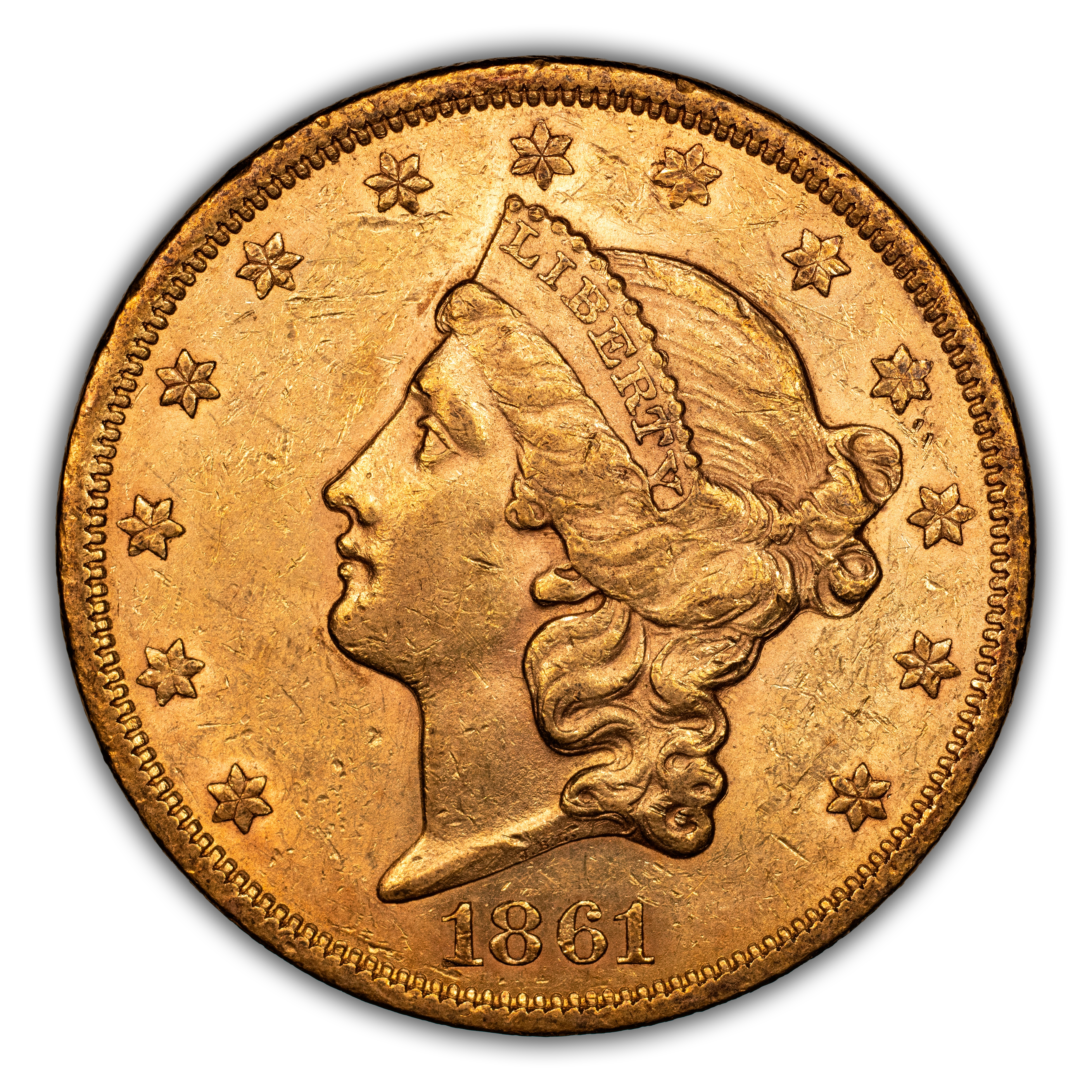 Reverse: Shielded eagle with wings outstretched holding arrows and olive branches. The words UNITED STATES OF AMERICA * TWENTY D. appear around the periphery. Mint mark, if any, appears below the eagle's tail, above the N in TWENTY.