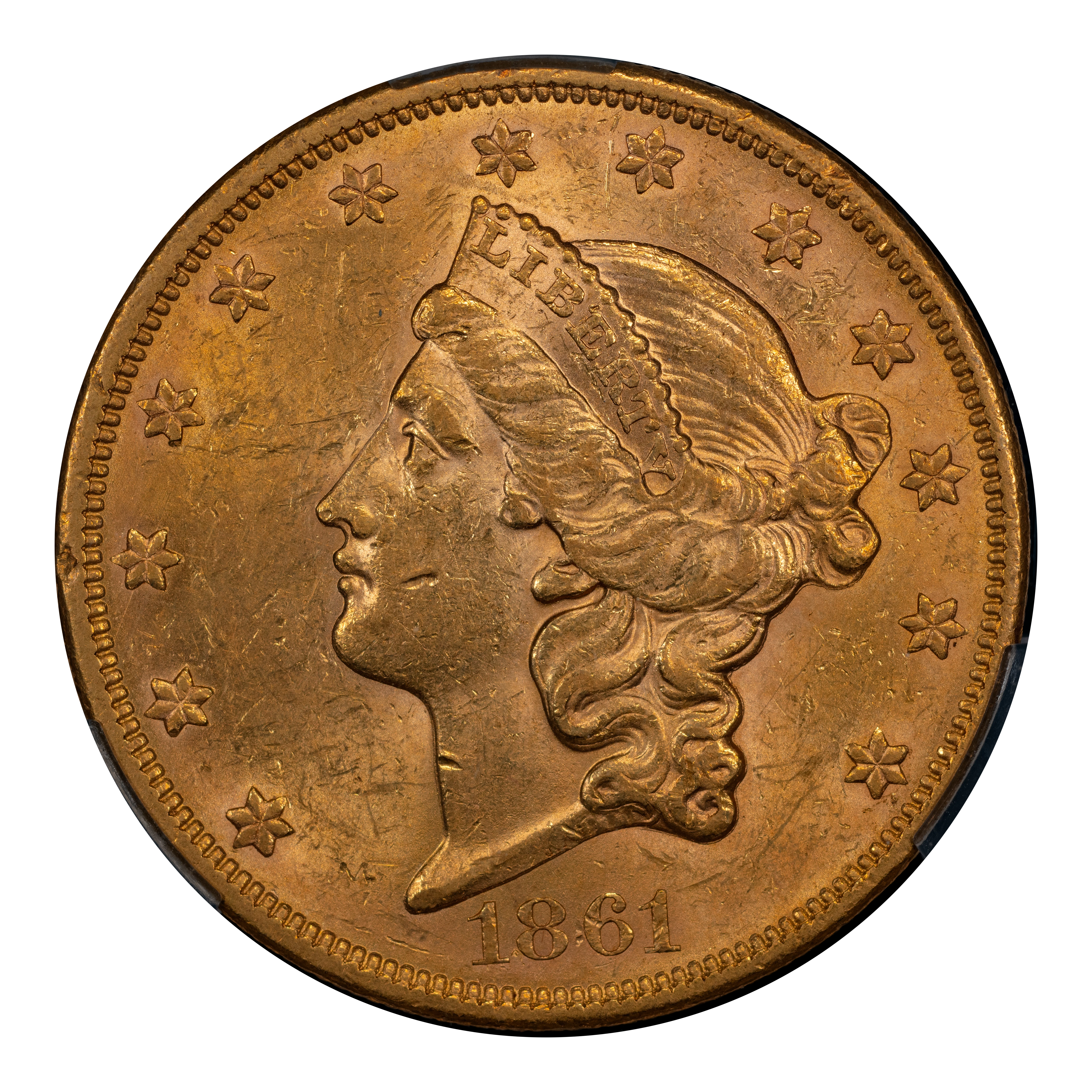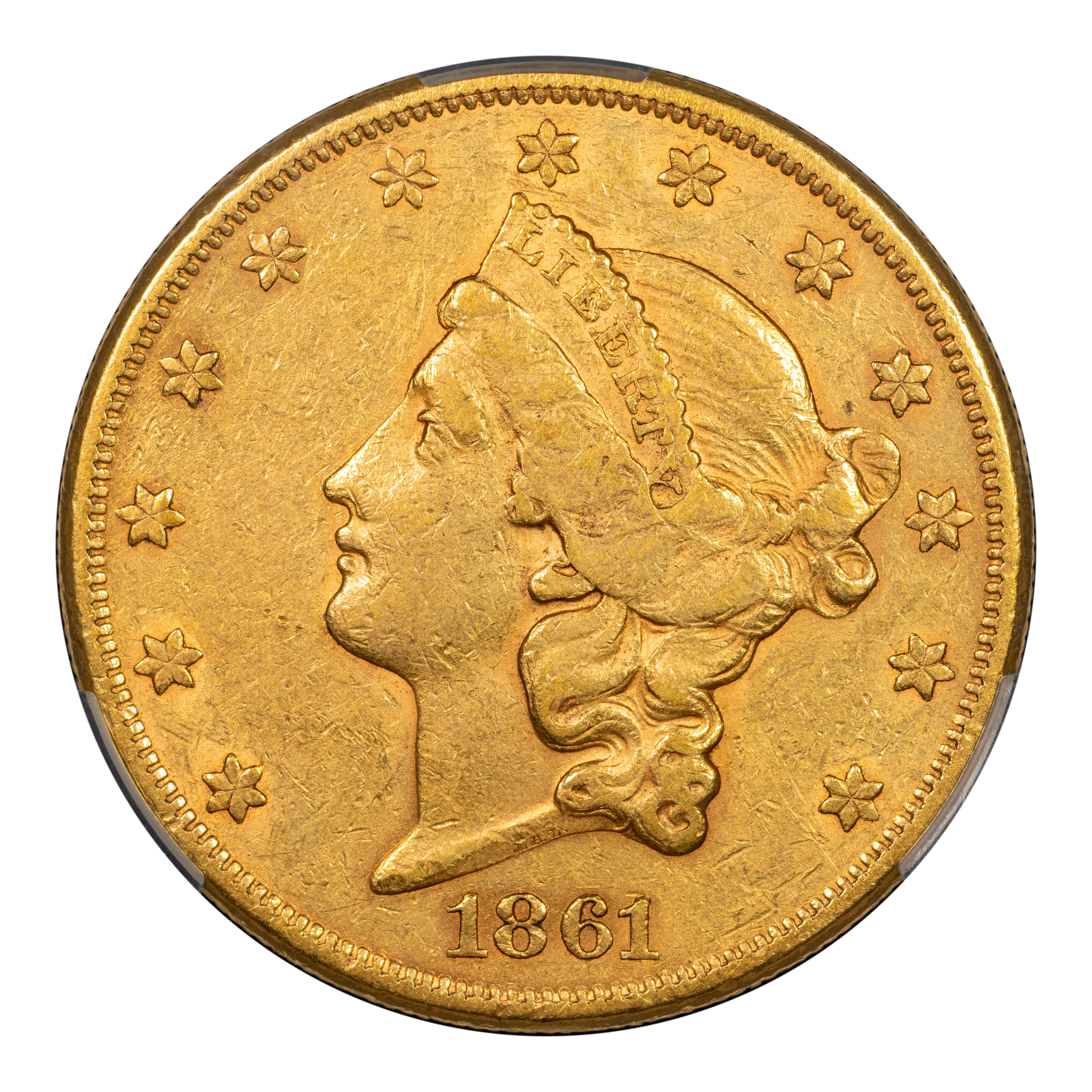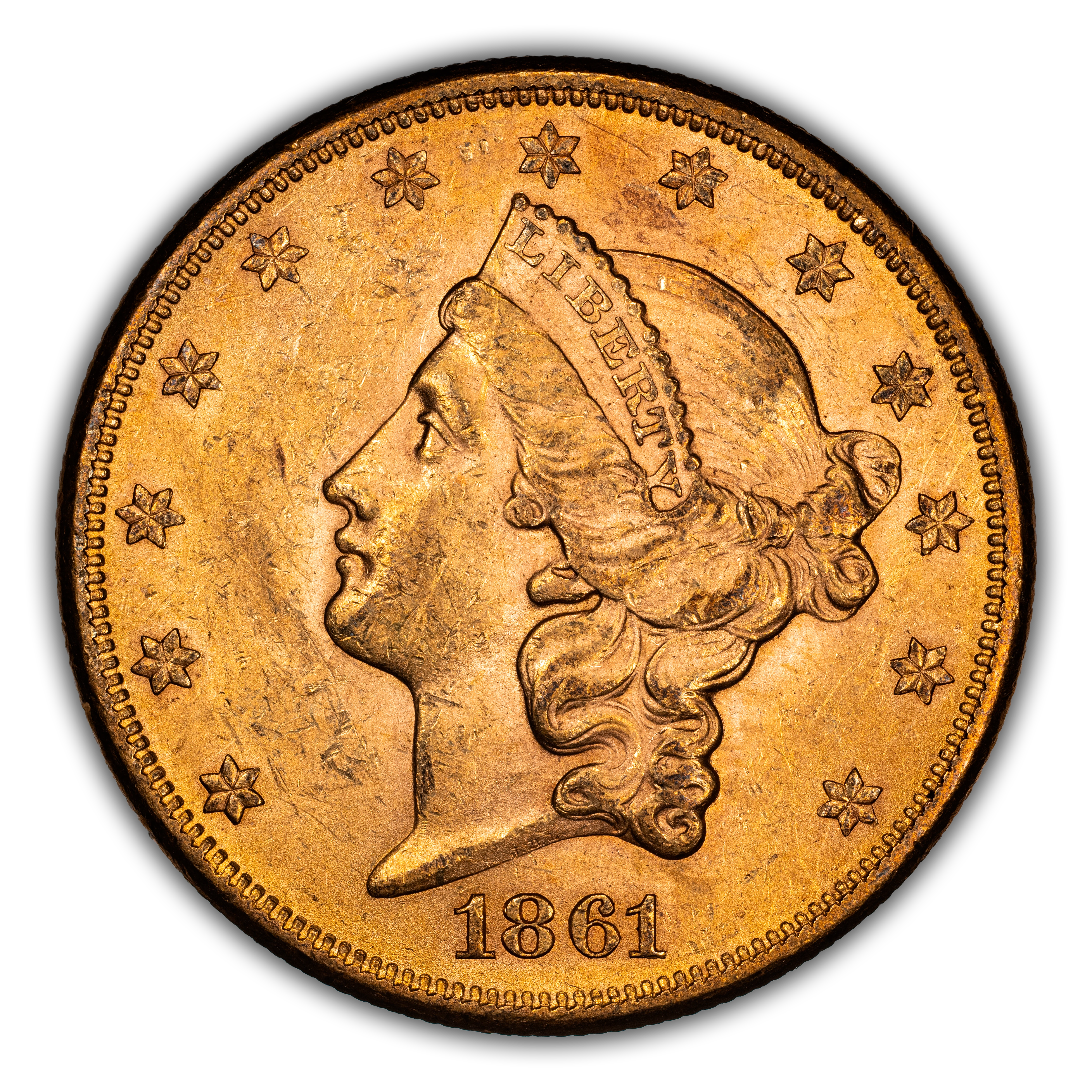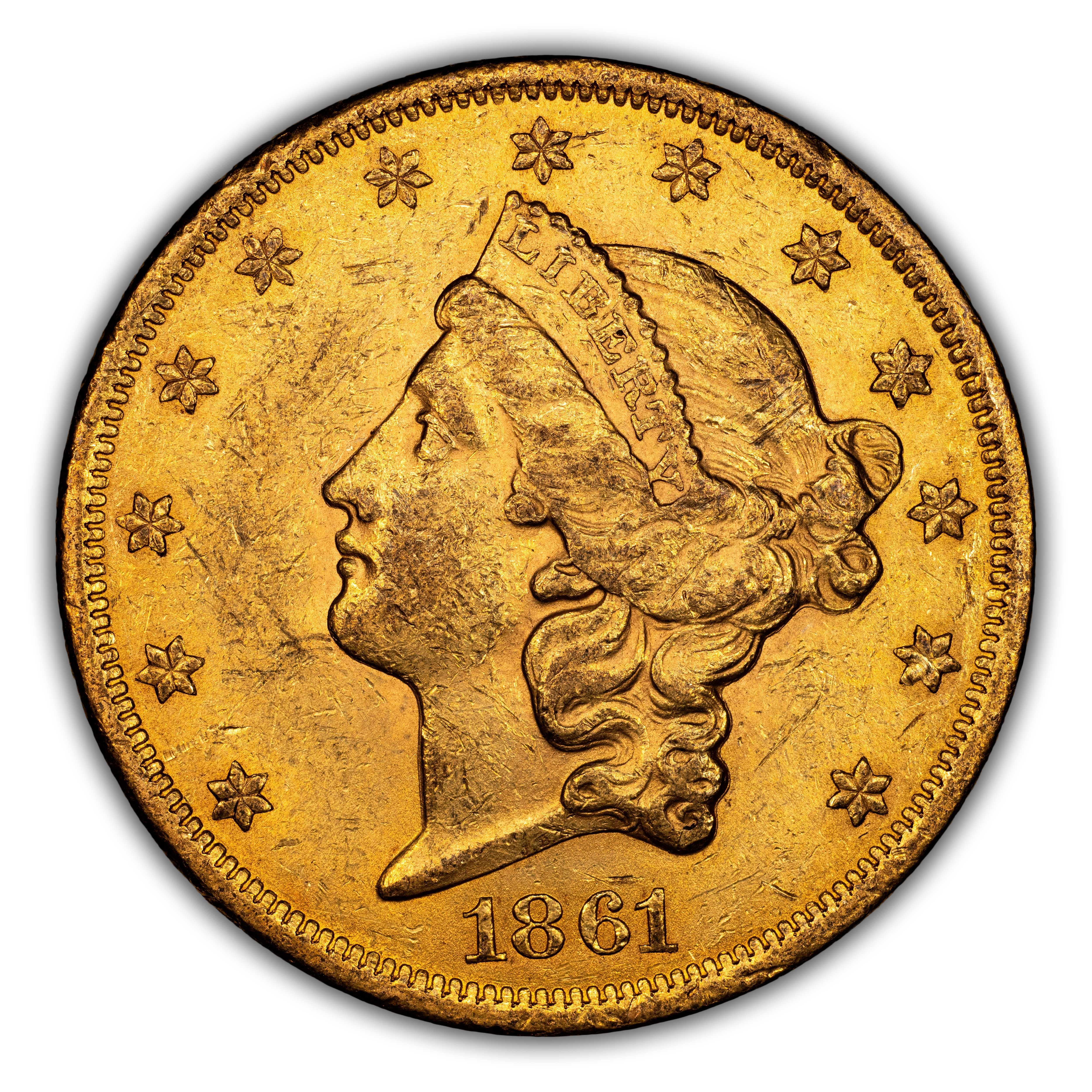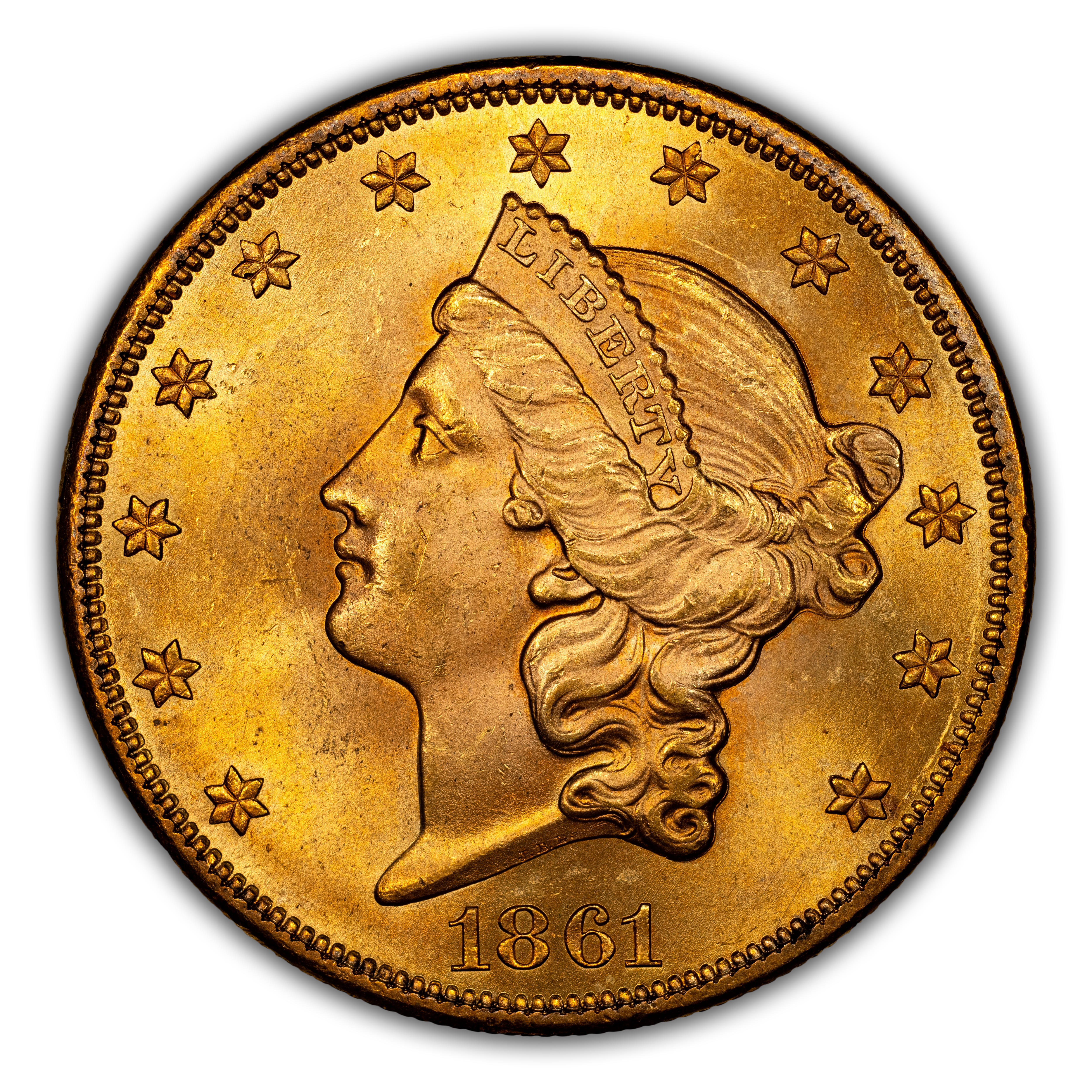 Reverse: Shielded eagle with wings outstretched holding arrows and olive branches. The words UNITED STATES OF AMERICA * TWENTY D. appear around the periphery. Mint mark, if any, appears below the eagle's tail, above the N in TWENTY.