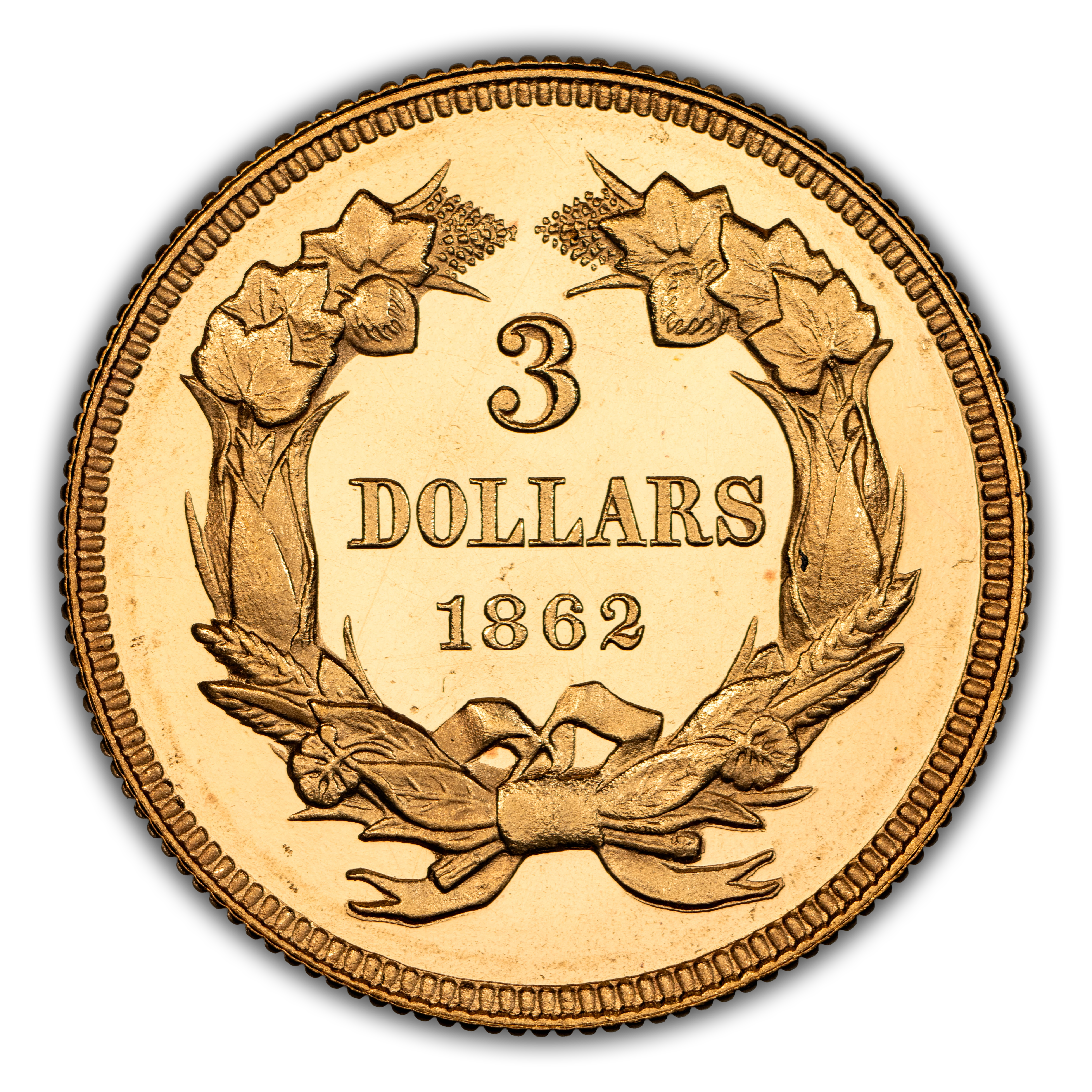 Reverse: "3 DOLLARS" is centered with date below, surrounded by a large wreath tied in a bow at the bottom.