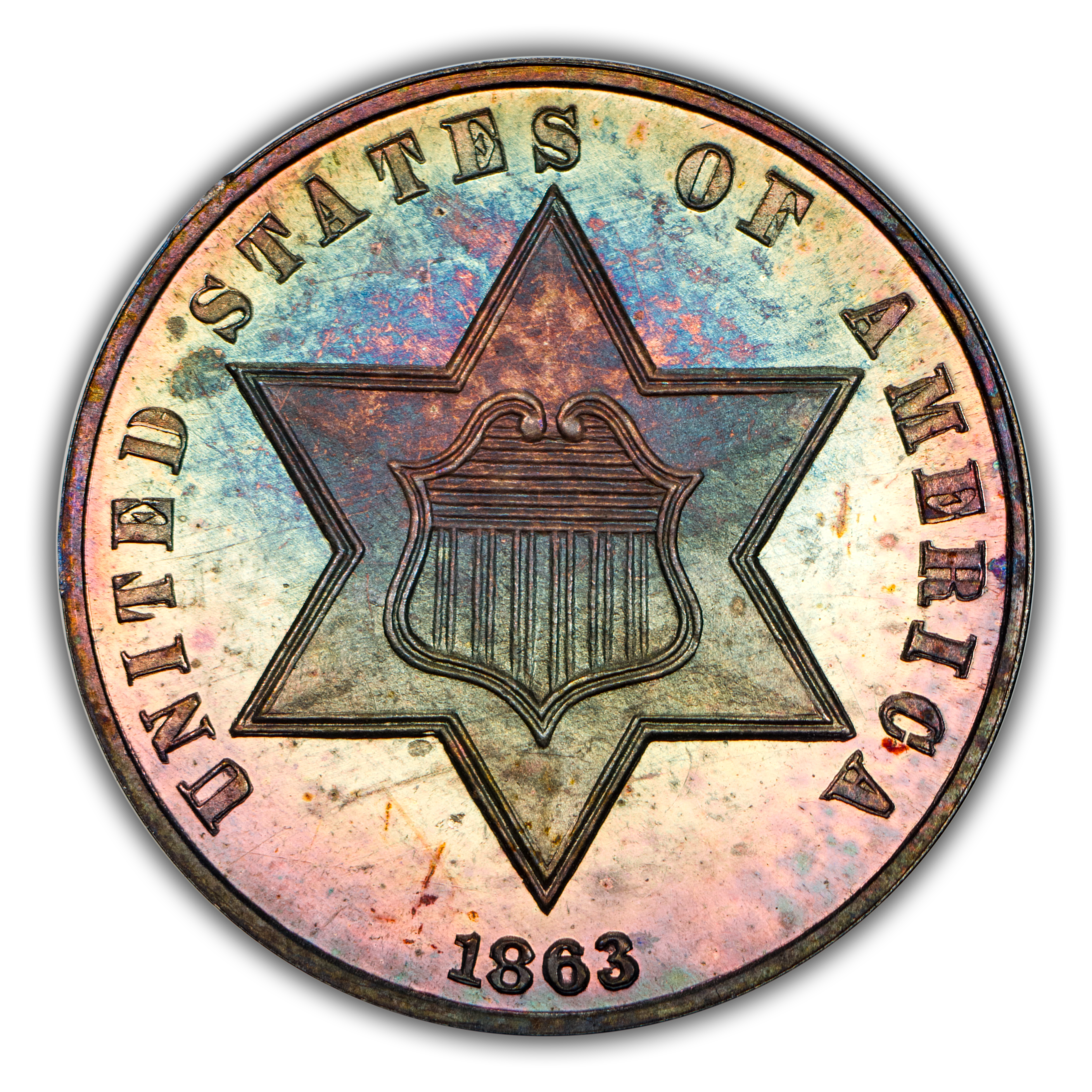 The 1863/2 overdate variety is very popular in the Proof Three Cent Silver Series. The two can be seen beneath the three in the date, but is most visible from the lower part of the three serif to the middle of the three. It is scarce in PR62 through PR65. PR66 and finer are considered very rare. Cameo pieces are far more difficult to locate in all grades.