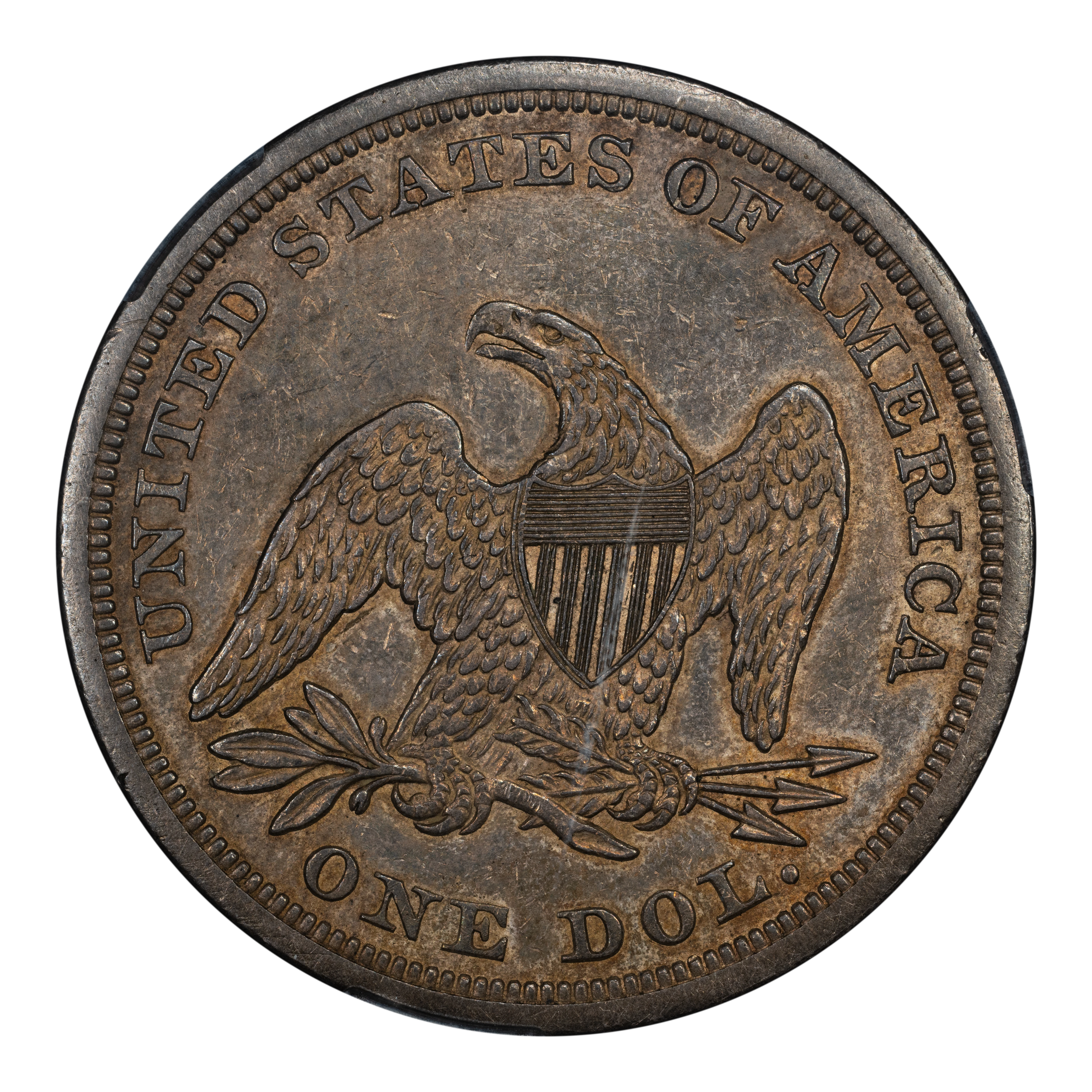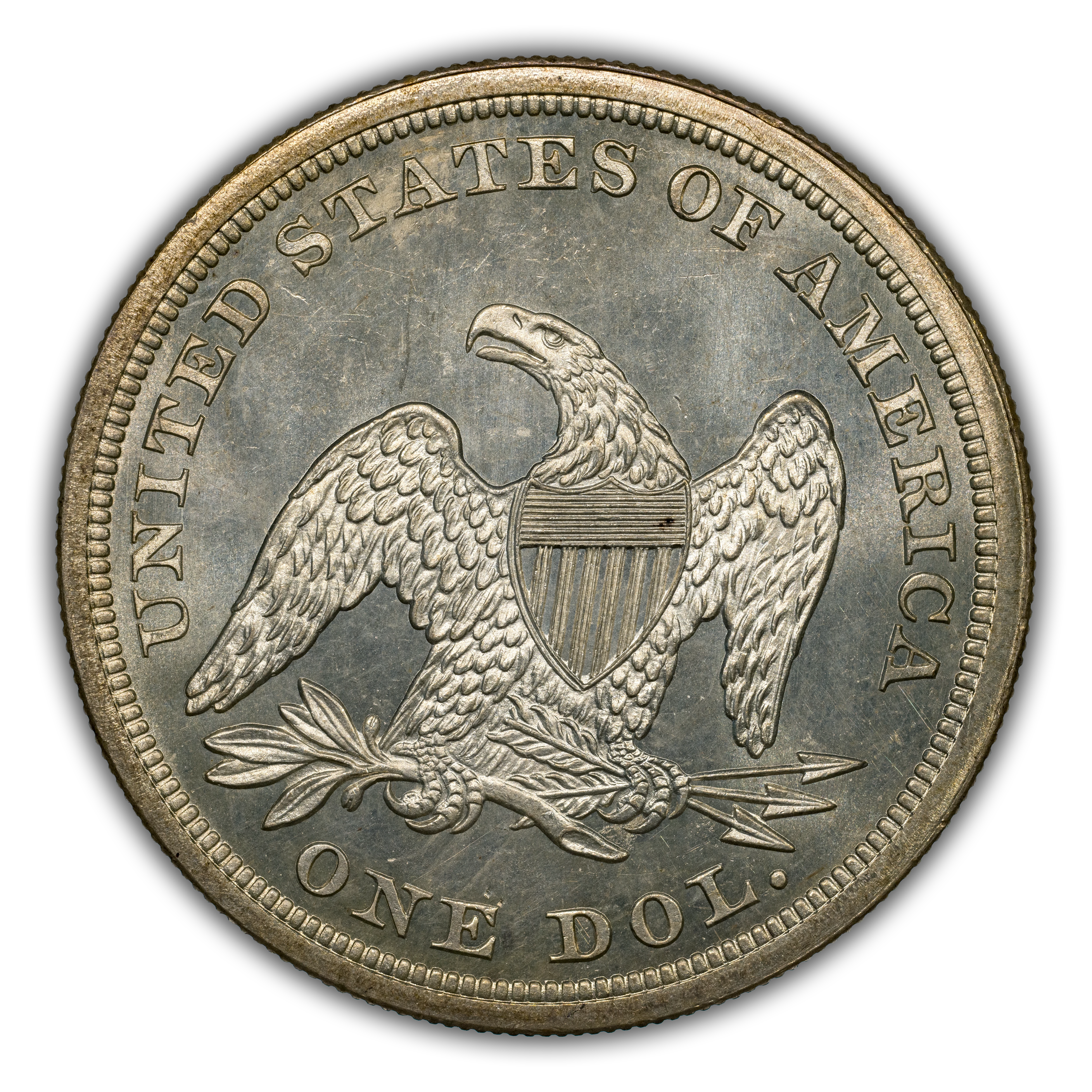 Reverse: The heraldic eagle is centered in the design with the words UNITED STATES OF AMERICA and ONE DOL. around the periphery.