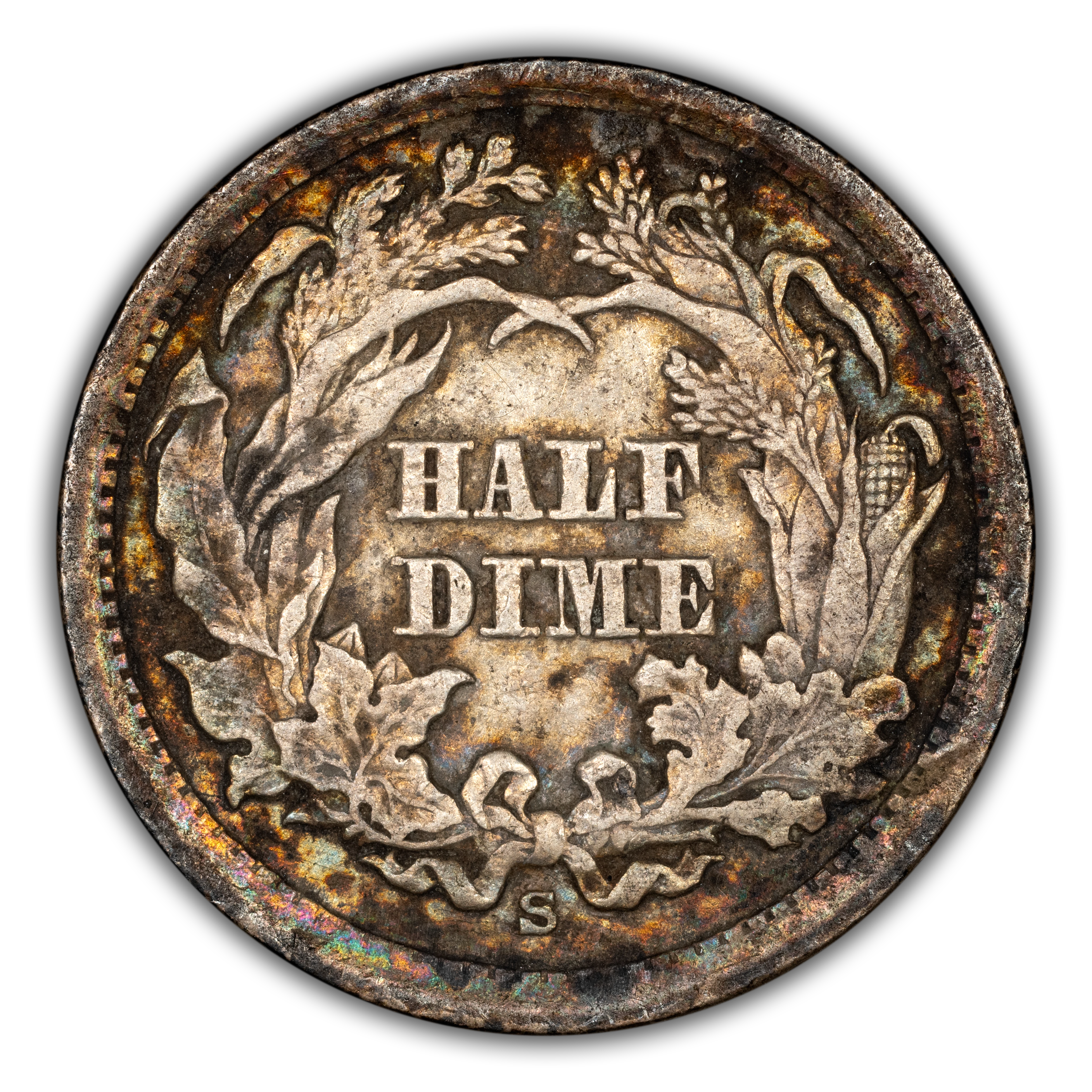 Reverse: The words HALF DIME are centered and surrounded by an ornate wreath tied by ribbon and double bow at the bottom. Mint mark, if any, appears at bottom center under the bow.