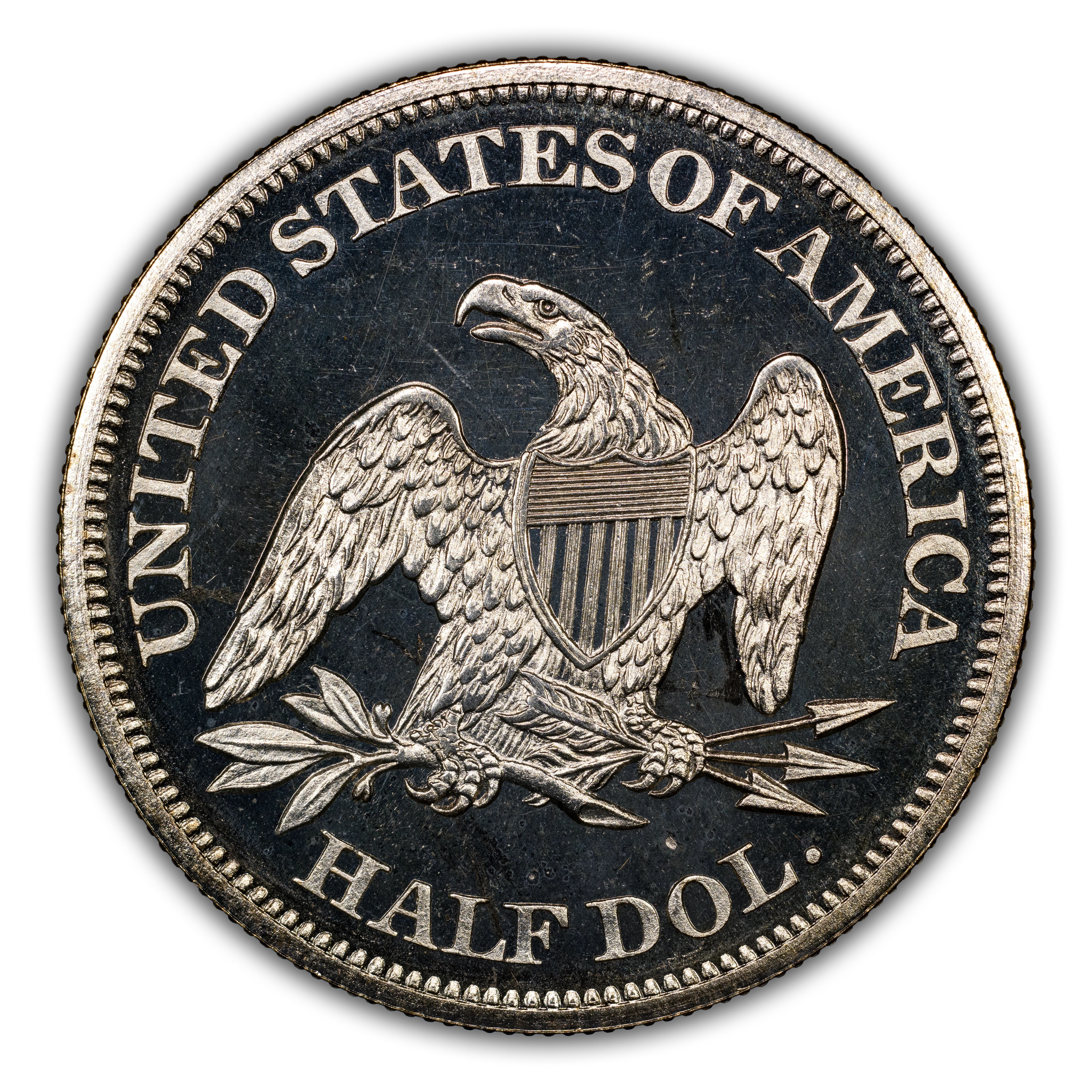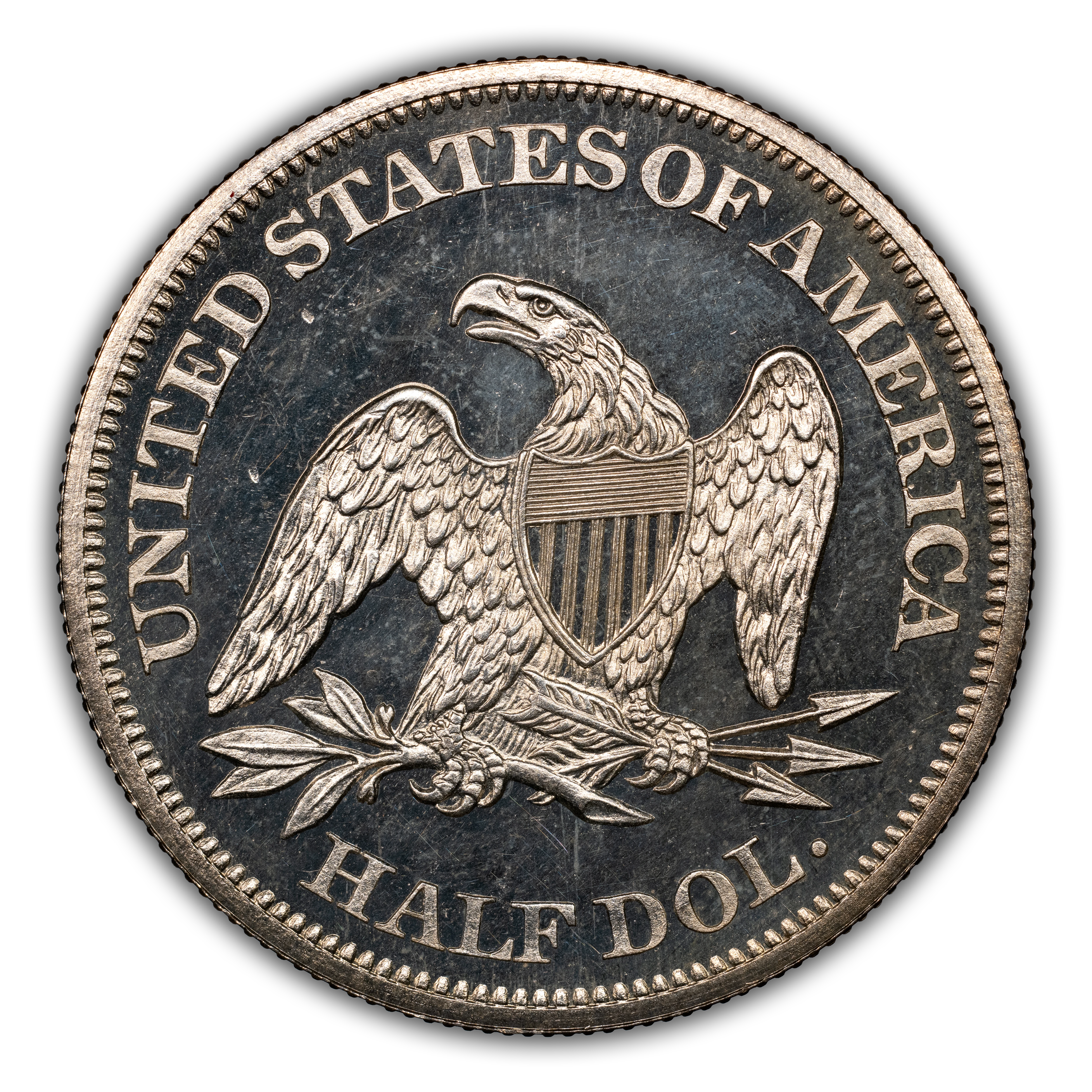 Reverse: The heraldic eagle is centered in the design with the words UNITED STATES OF AMERICA and HALF DOL. around the periphery.
