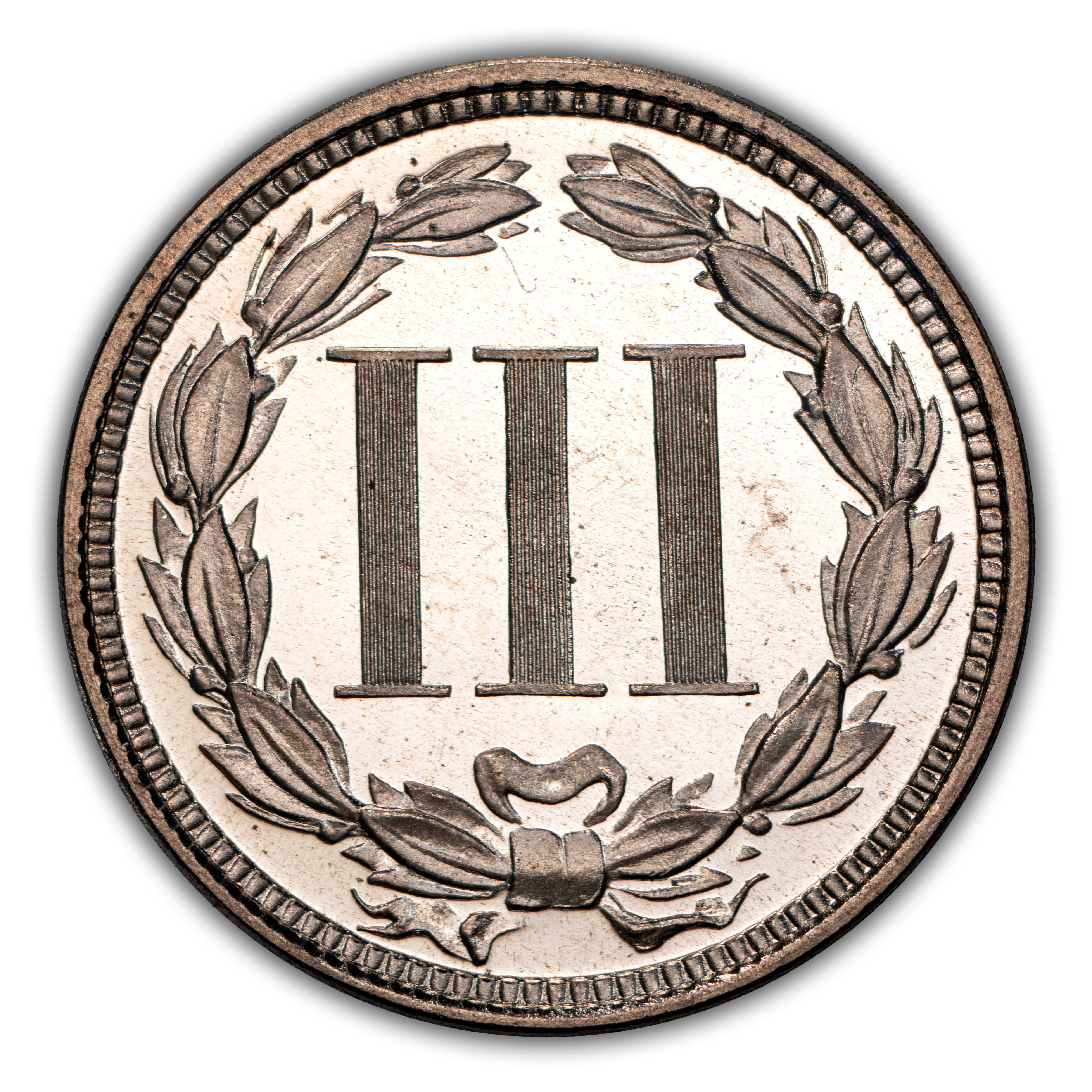 Reverse: The roman numeral III is centered in the design surrounded by a large wreath tied with a bow at the bottom. This design is one of few American coins without wording on one of the sides.