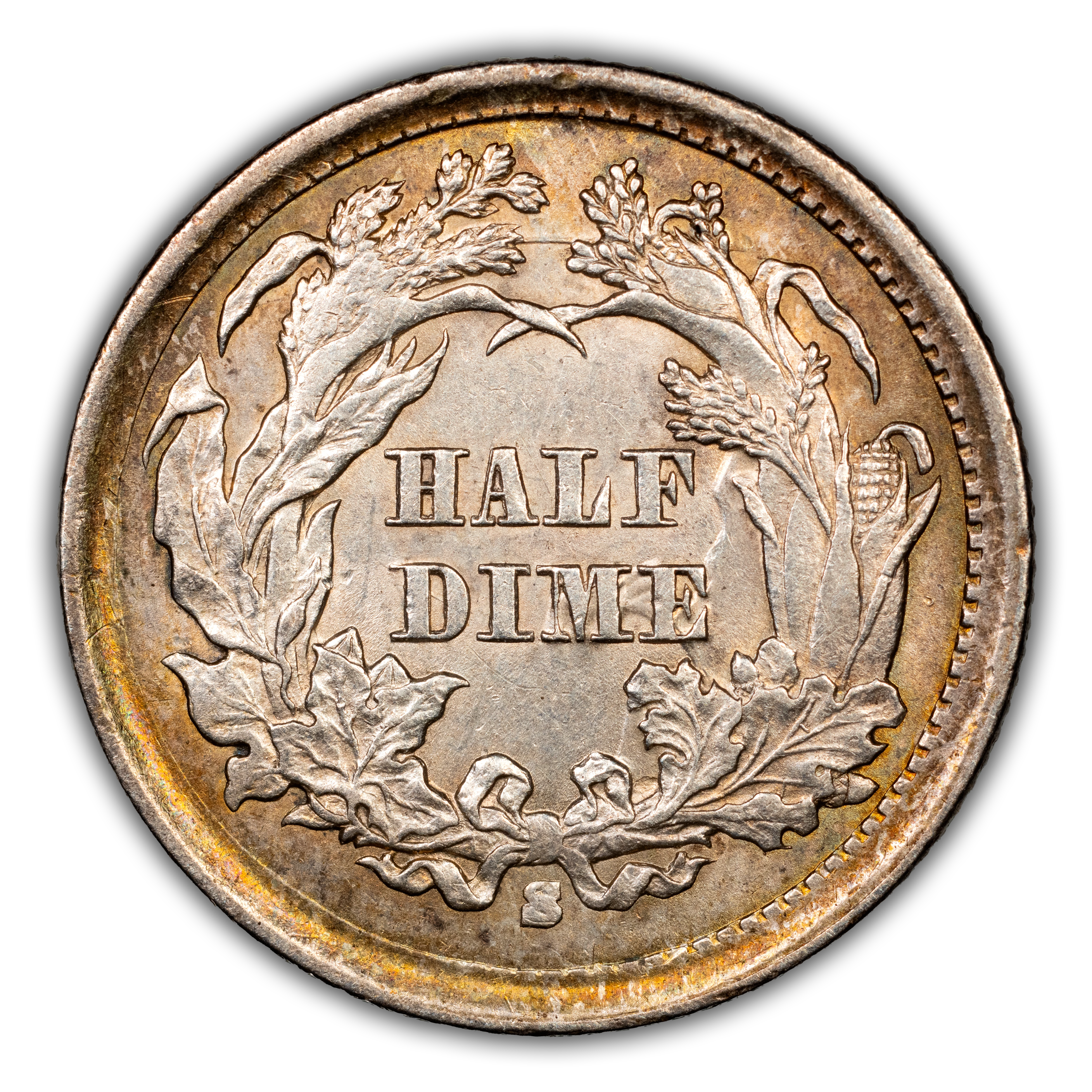 Reverse: The words HALF DIME are centered and surrounded by an ornate wreath tied by ribbon and double bow at the bottom. Mint mark, if any, appears at bottom center under the bow.