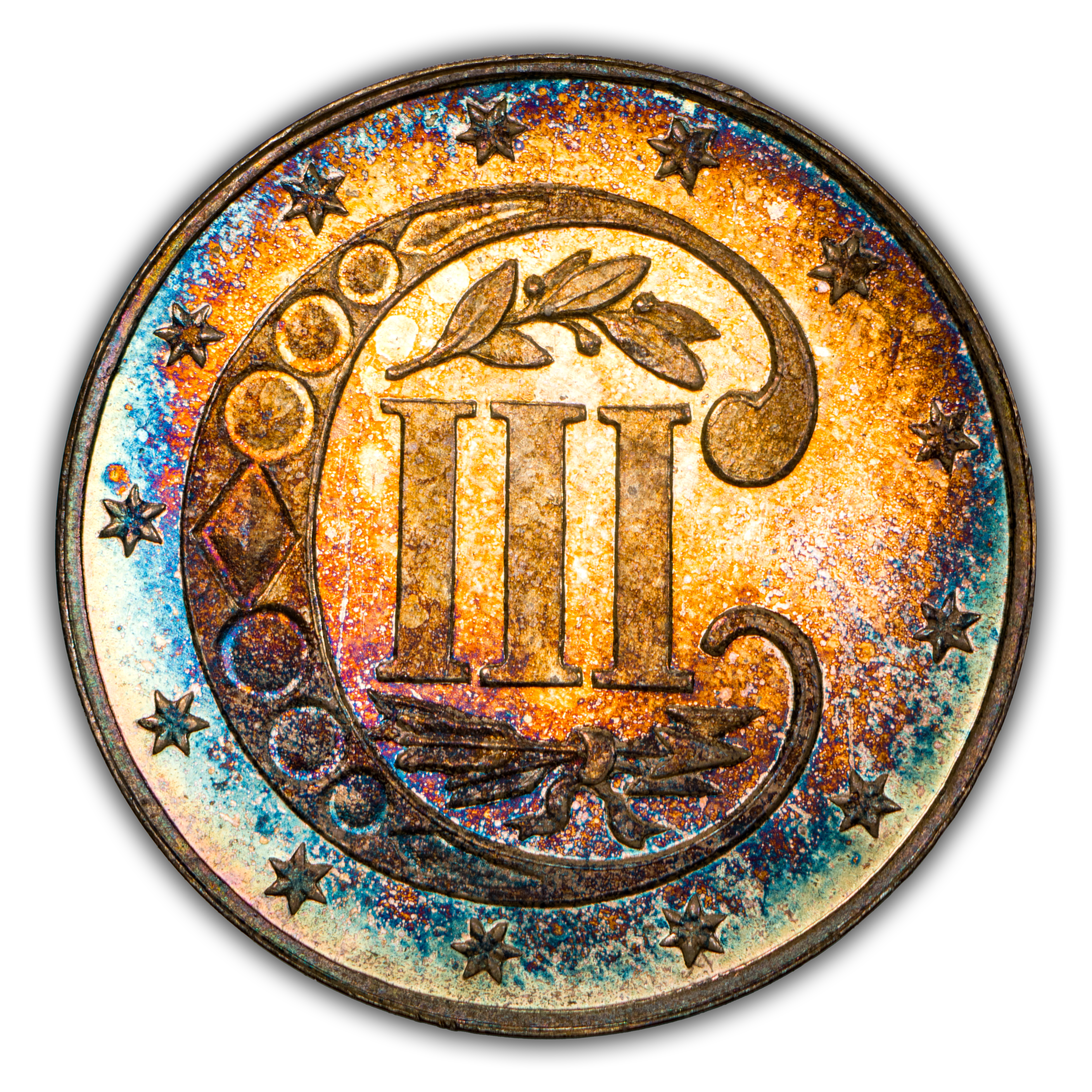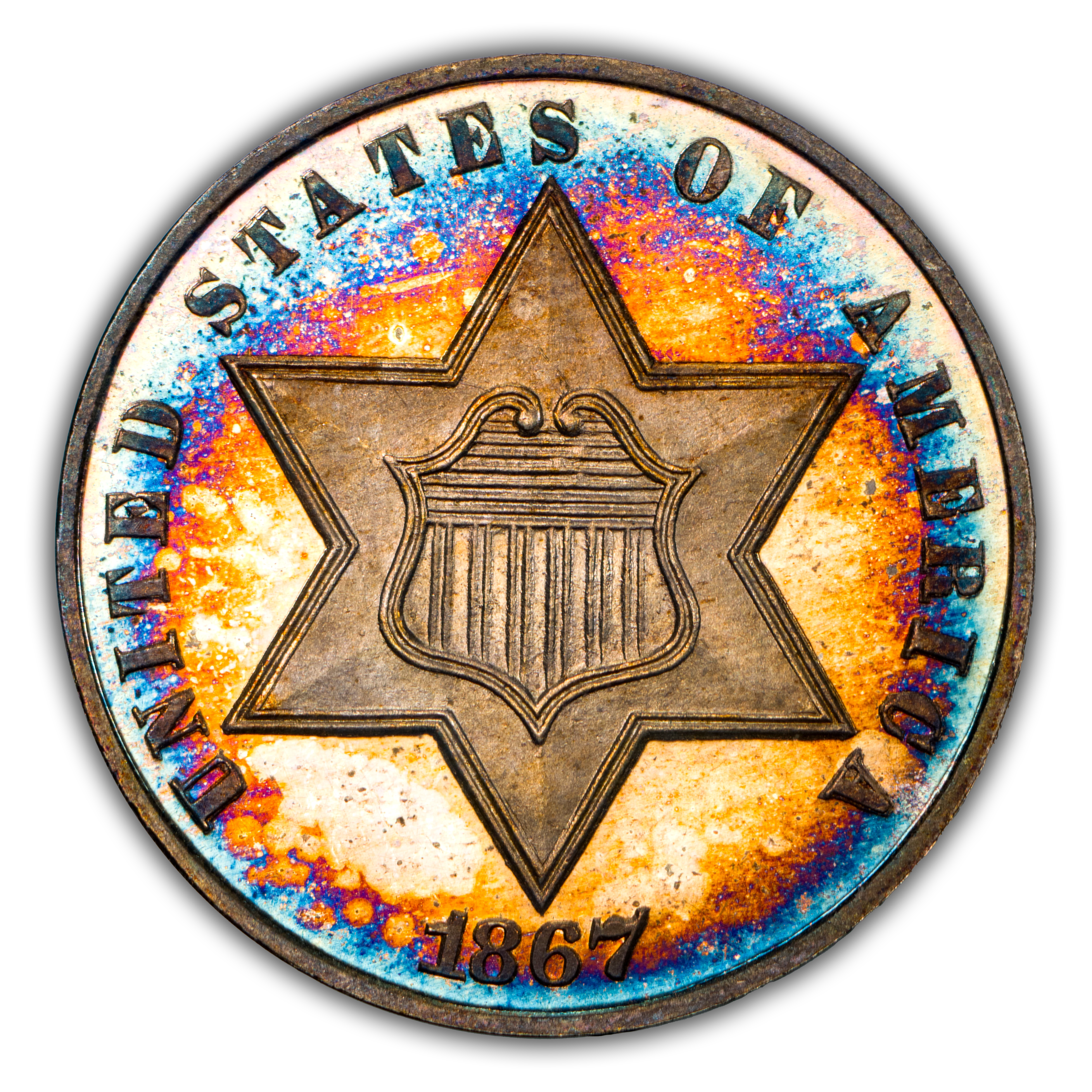 The 1867 Proof Three Cent Silver comes from a moderately low mintage for the series of 625 coins. Most were saved, leaving the issue relatively affordable and readily available to collectors. Scarce only in gem condition. Cameo pieces are far more difficult to locate in all grades and deep cameos are a rarity. Look for attractive toners as there are many in this series.