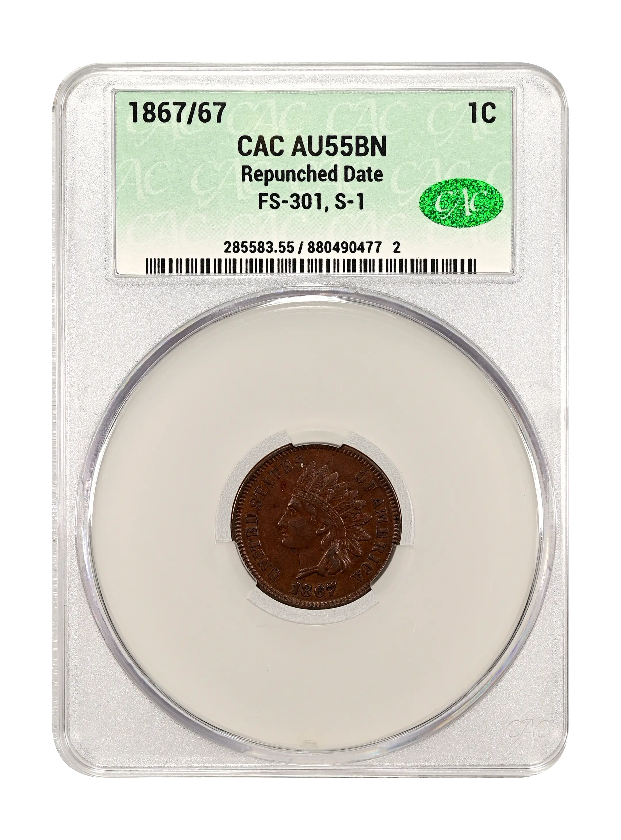 1867/67 Repunched Date 1c FS-301, S-1 BN CAC AU55BN