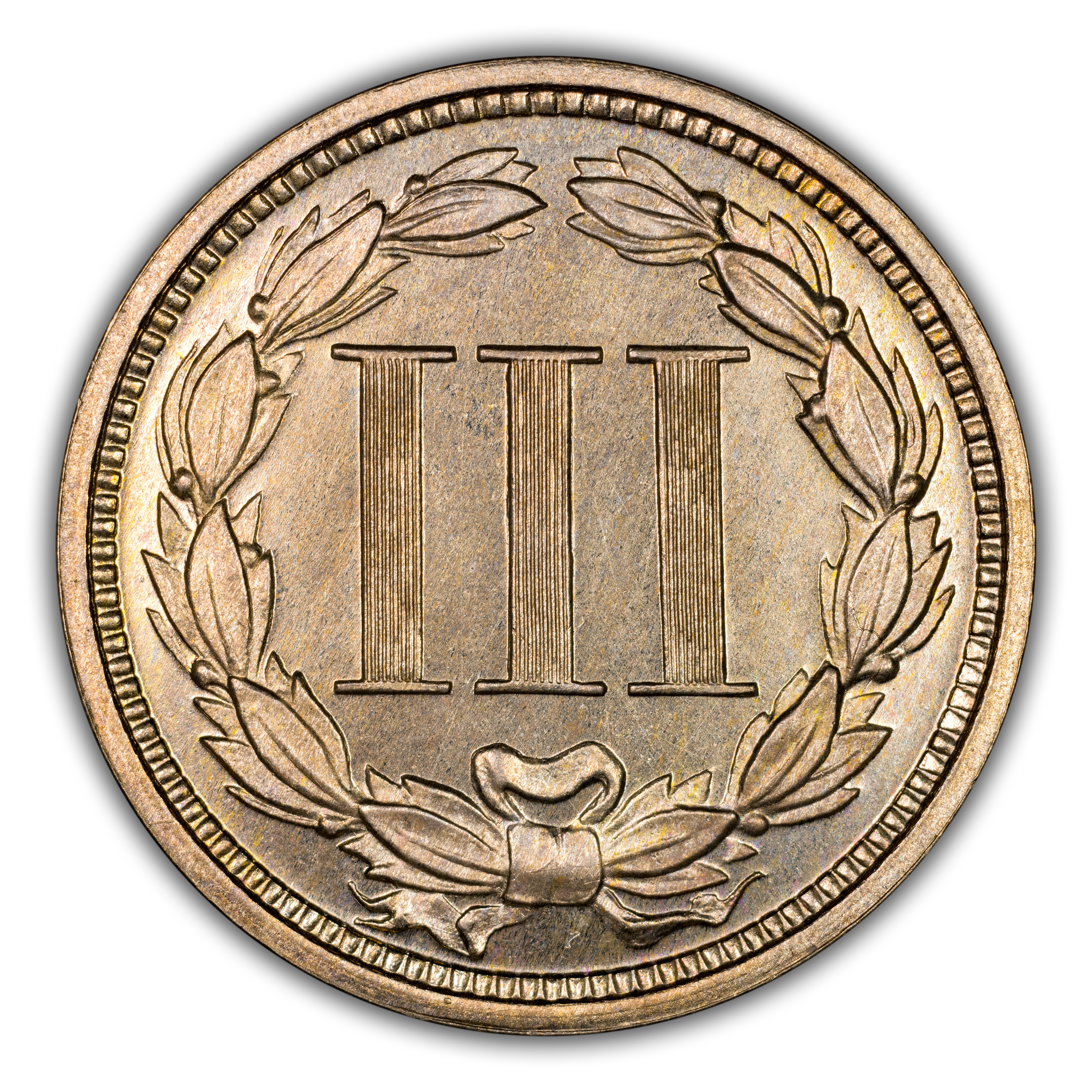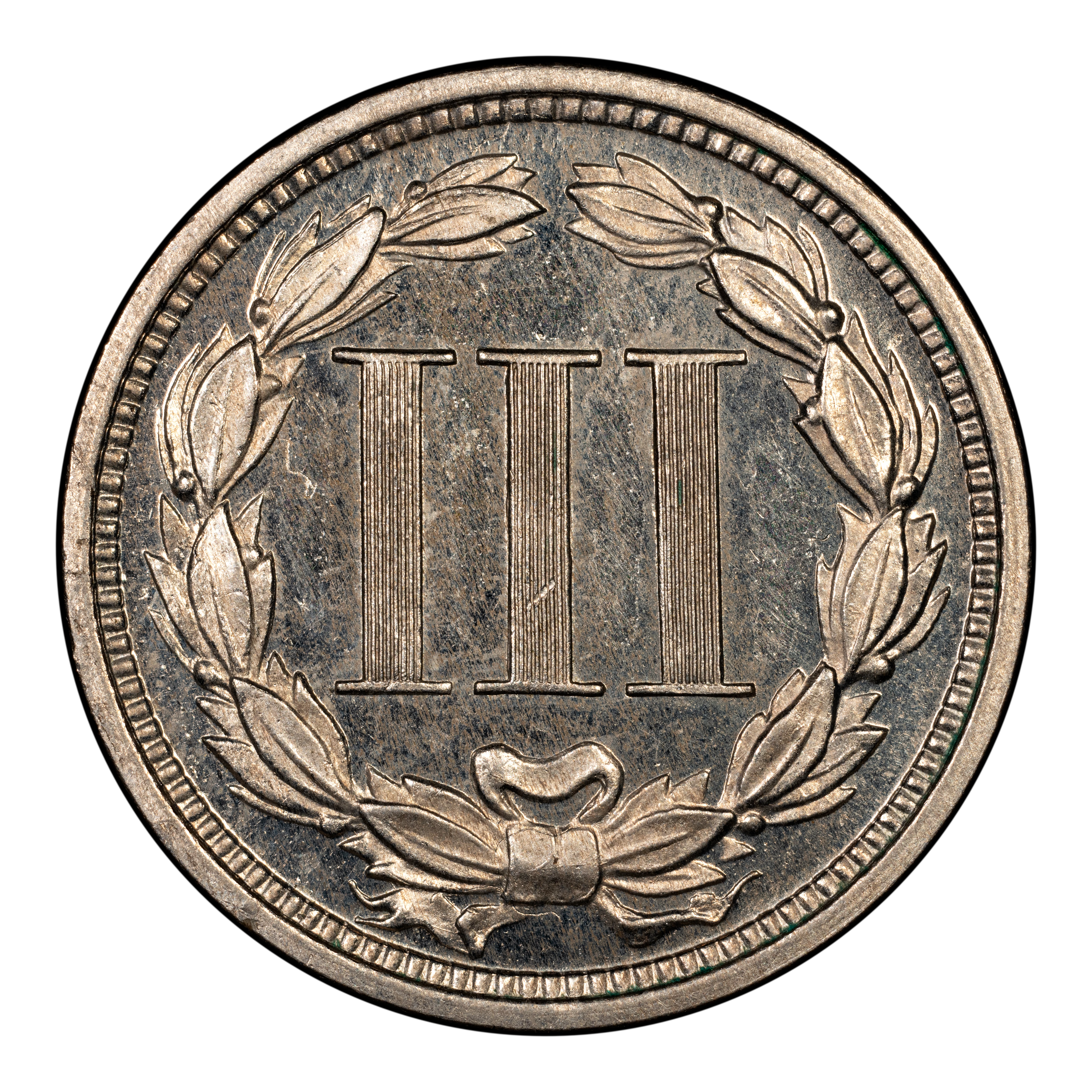 Reverse: The roman numeral III is centered in the design surrounded by a large wreath tied with a bow at the bottom. This design is one of few American coins without wording on one of the sides.