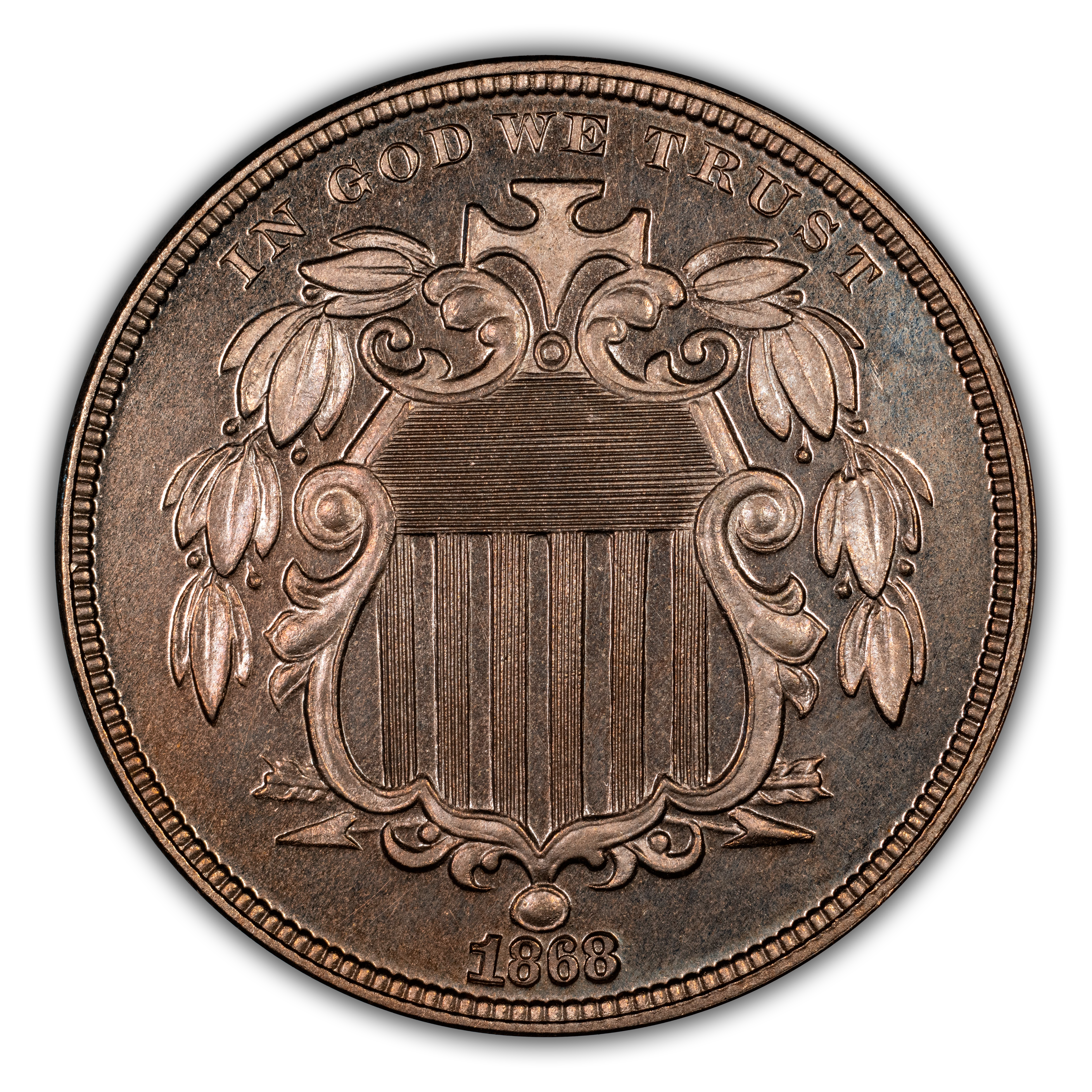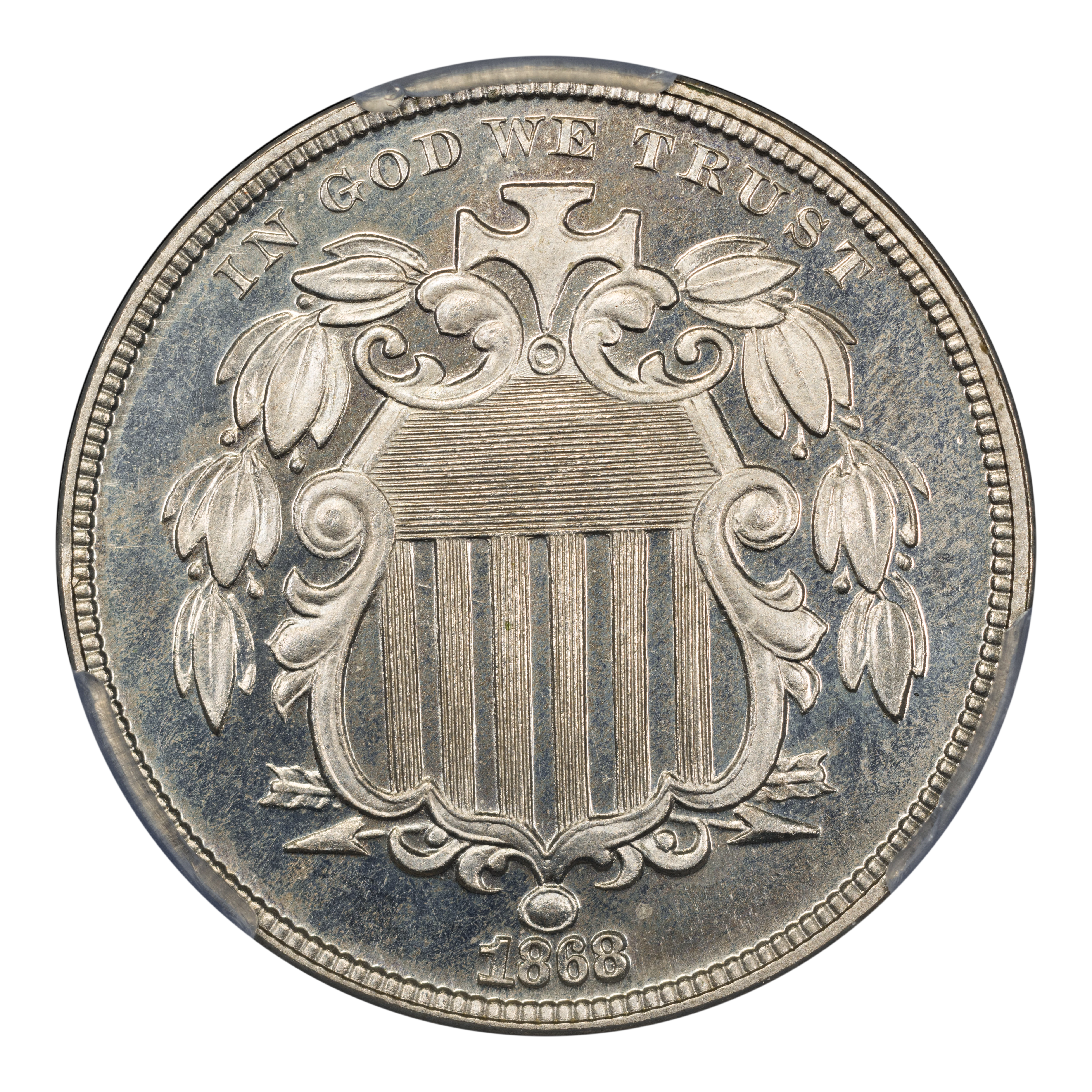 The 1868 Shield Nickel has a very low mintage at 600 coins. Most were saved, making this issue scarce but certainly accessible. Scarce in all grades and becoming rare as a high-end gem. Hard to locate with cameo surfaces; and a true rarity with deep cameo surfaces, as only a handful exist.