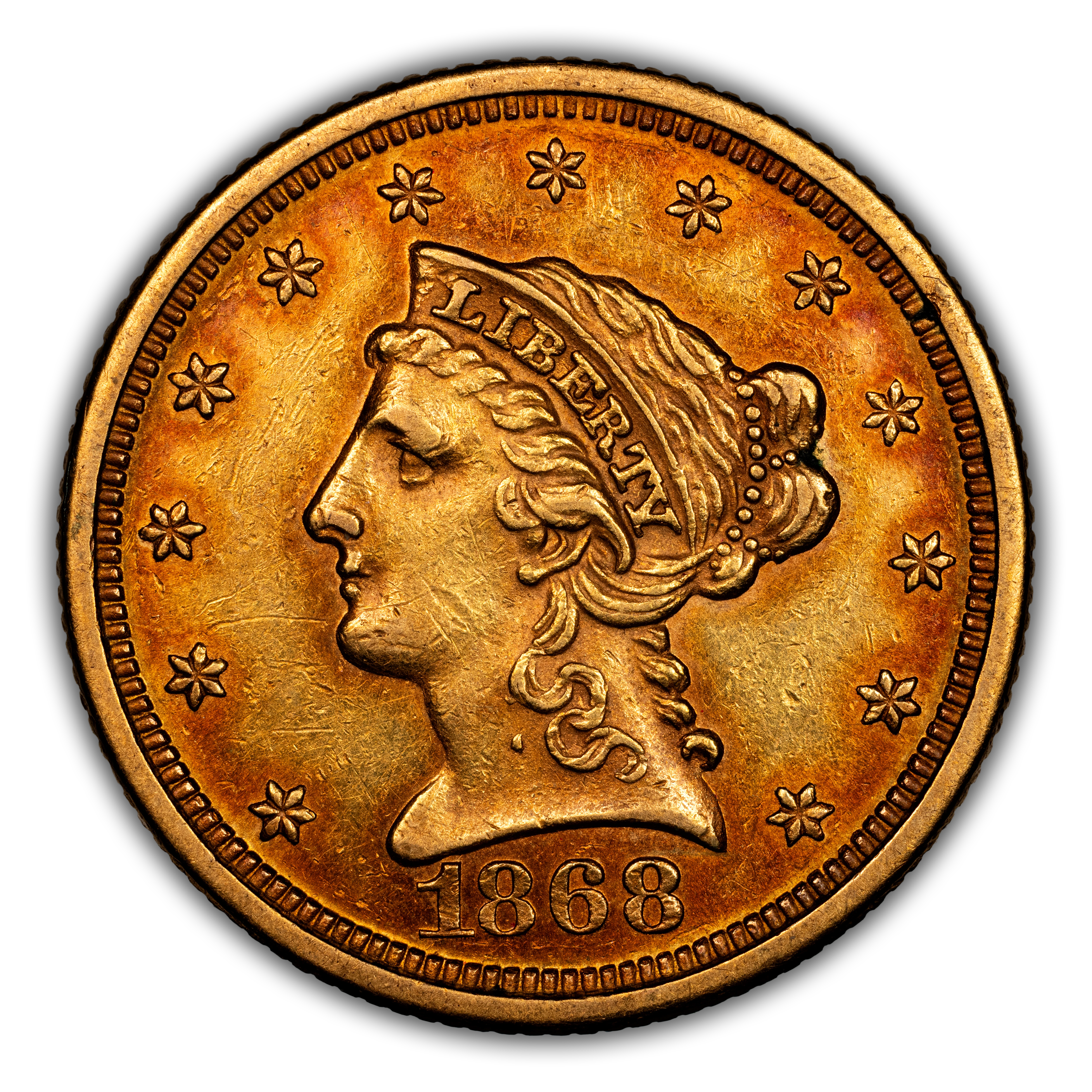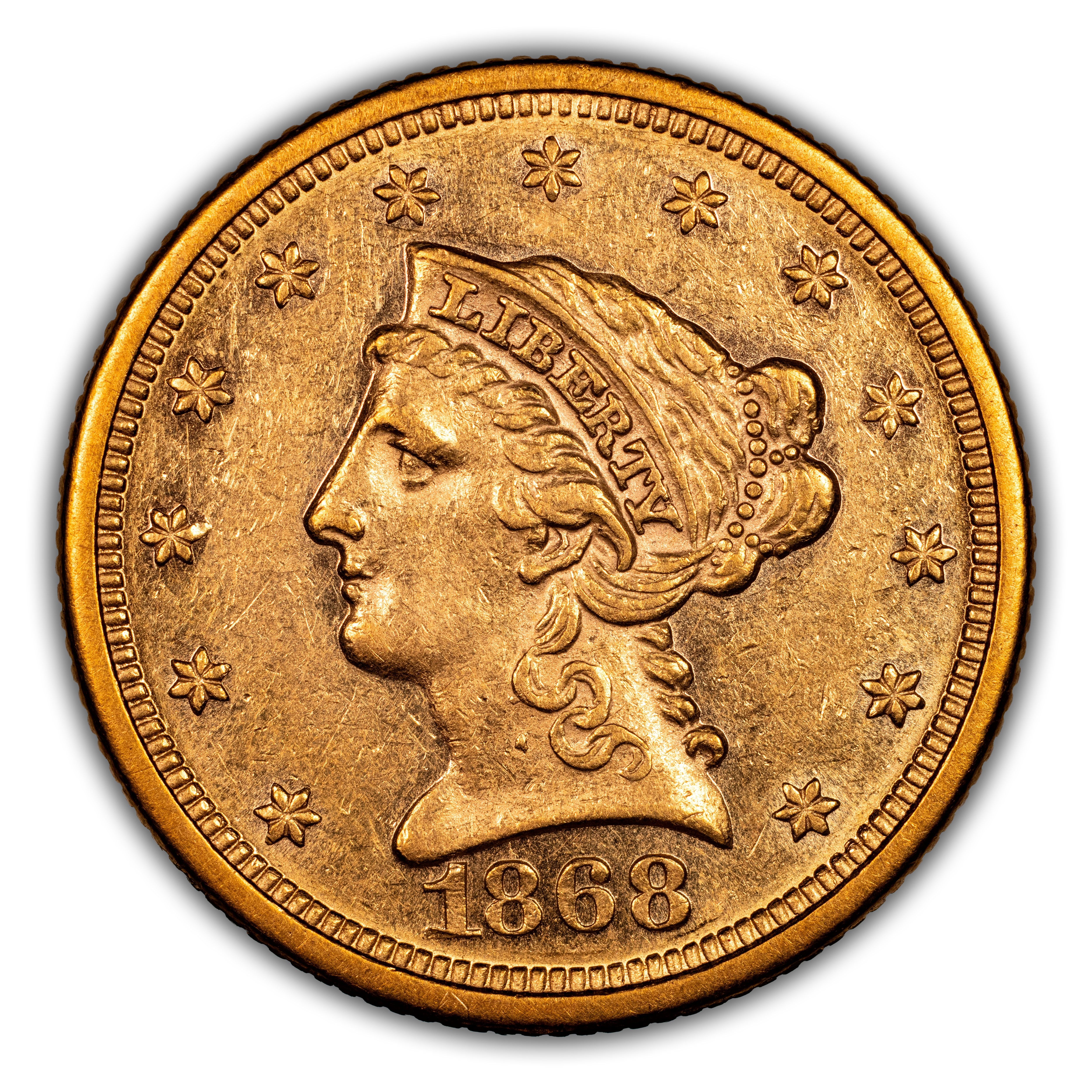1868 $2 1/2 AU58 PCGS. PCGS Population: (27/13 and 1/0+). NGC Census: (71/24 and 0/1+). CDN: $1,100 Whsle. Bid for NGC/PCGS...
