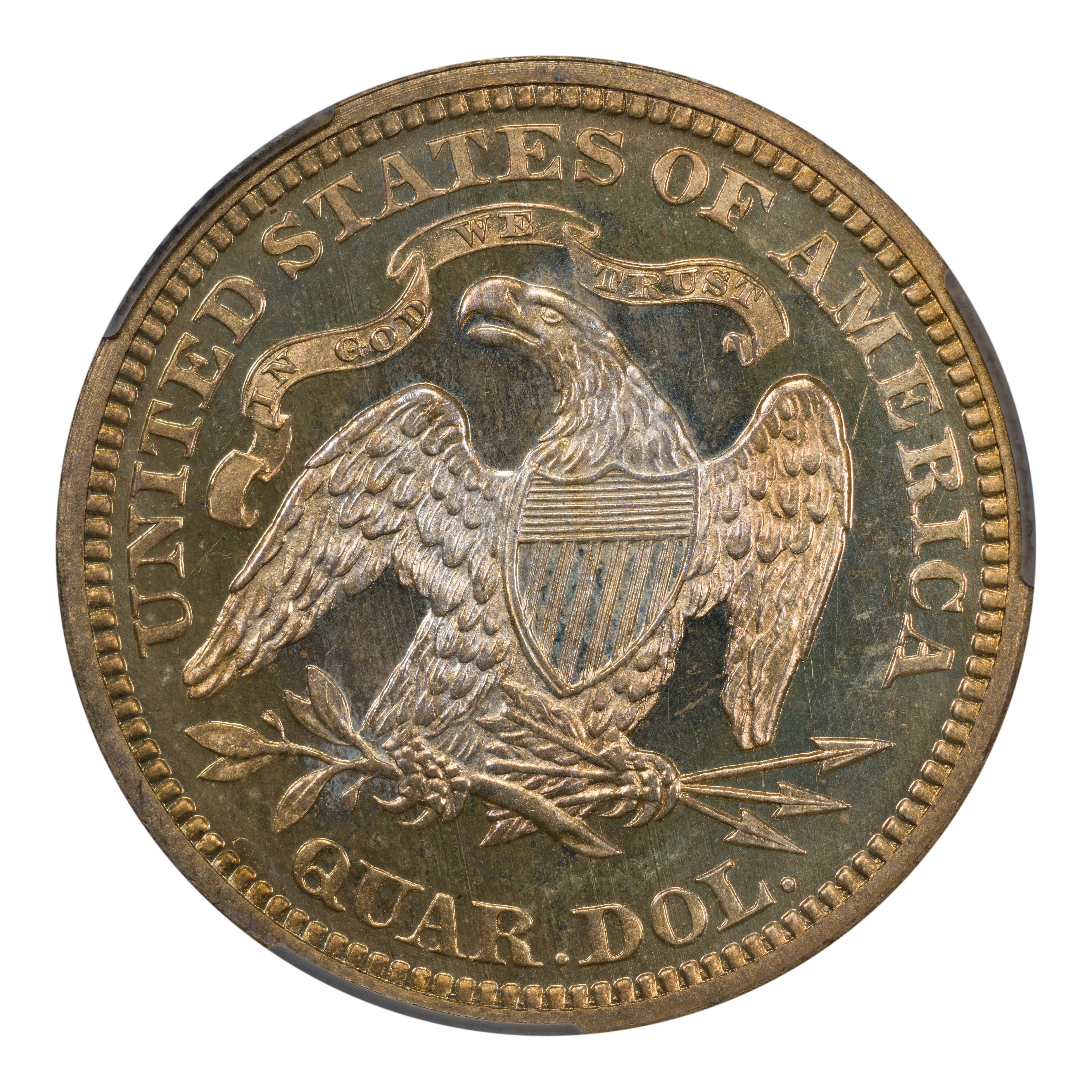 Reverse: The heraldic eagle is centered in the design with the words UNITED STATES OF AMERICA and QUAR. DOL. around the periphery. A ribbon above the eagle's head bears the motto IN GOD WE TRUST
