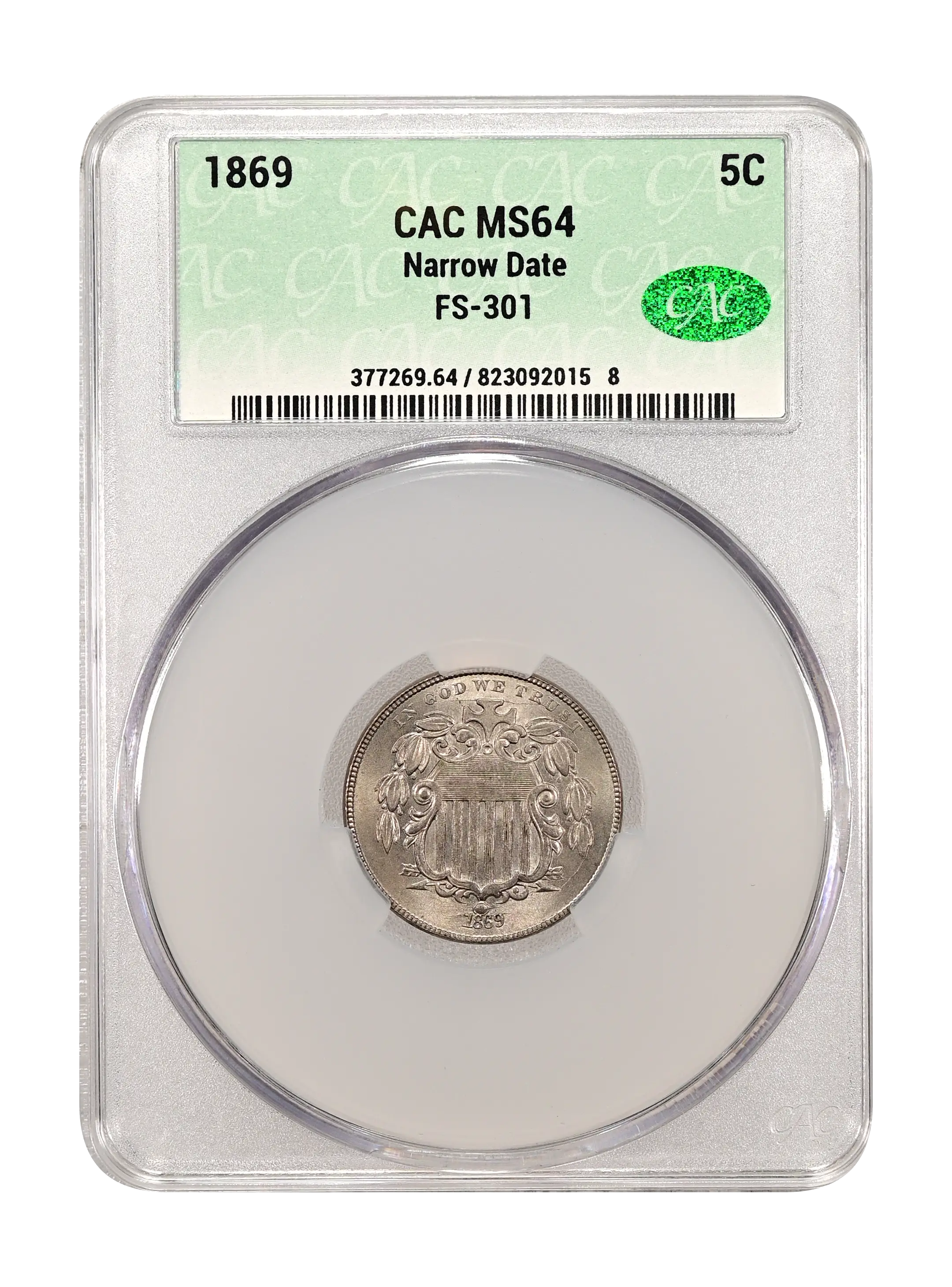 1869 Narrow Date 5c FS-301 CAC MS64