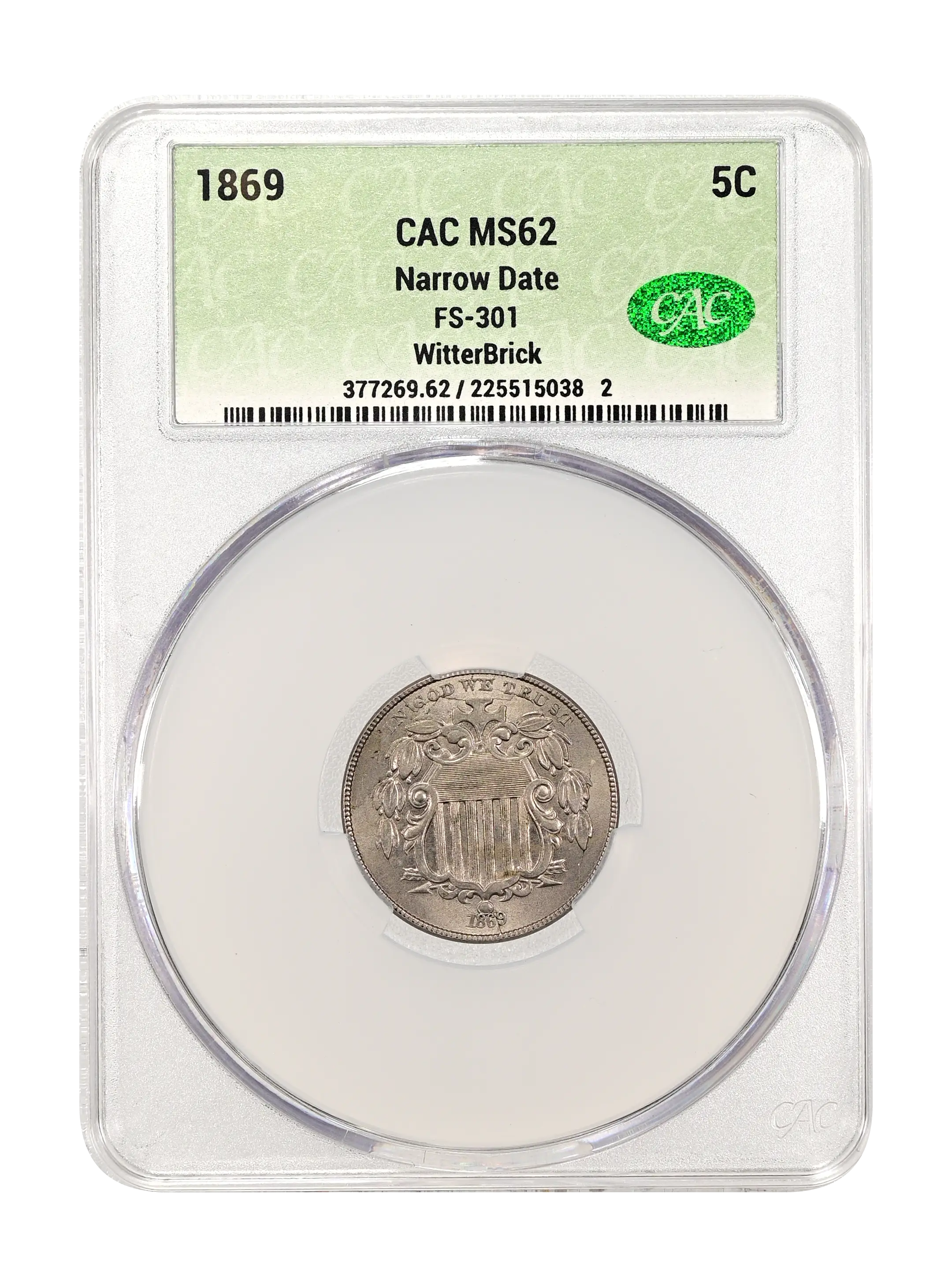 1869 Narrow Date 5c FS-301 CAC MS62
