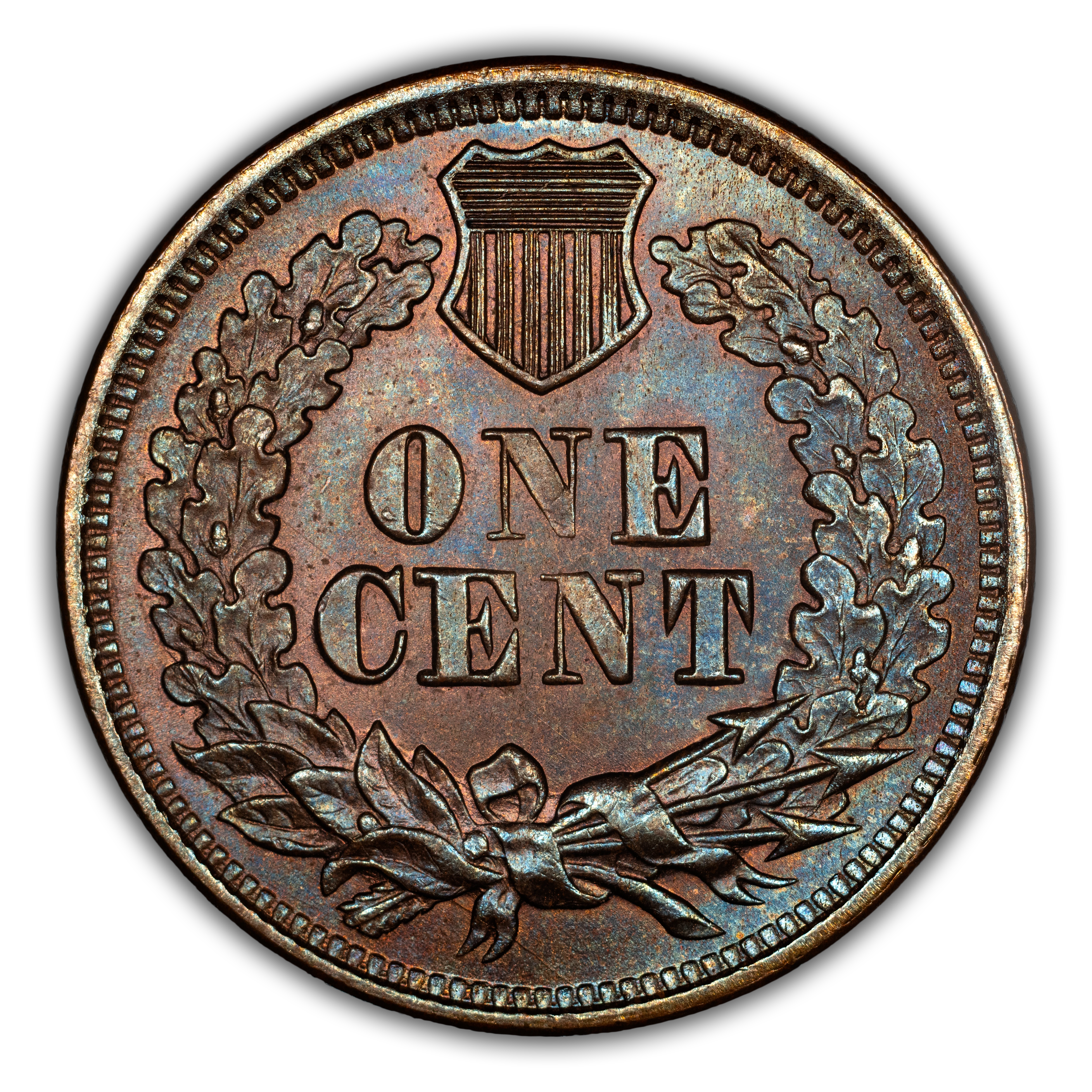 Reverse: The reverse bears the denomination of ONE CENT in the center surrounded by a wreath bearing a ribbon with arrows tied in at the bottom center.