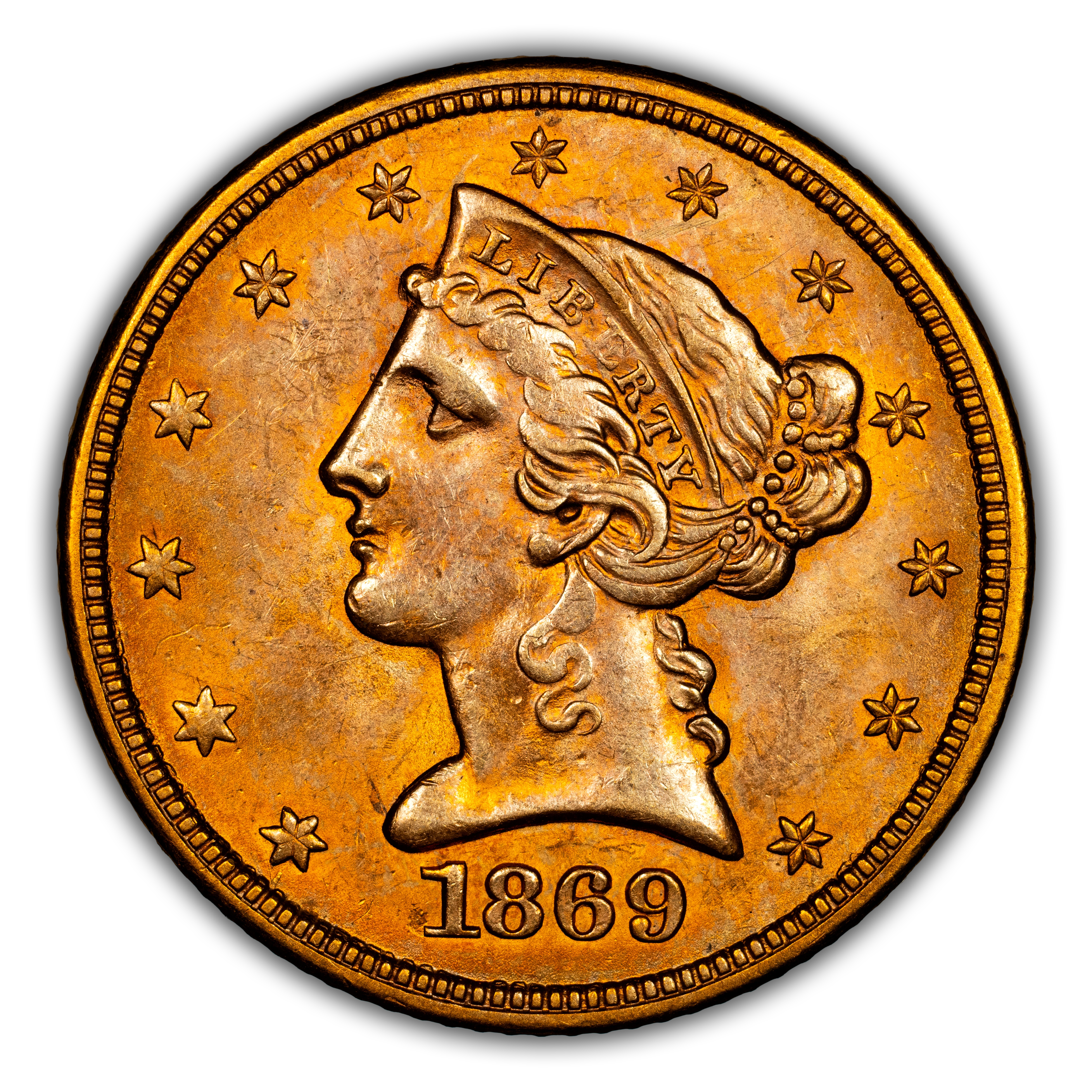 1869-S $5 AU53 PCGS. PCGS Population: (8/7 and 0/1+). NGC Census: (8/23 and 1/0+). CDN: $2,770 Whsle. Bid for NGC/PCGS AU53...