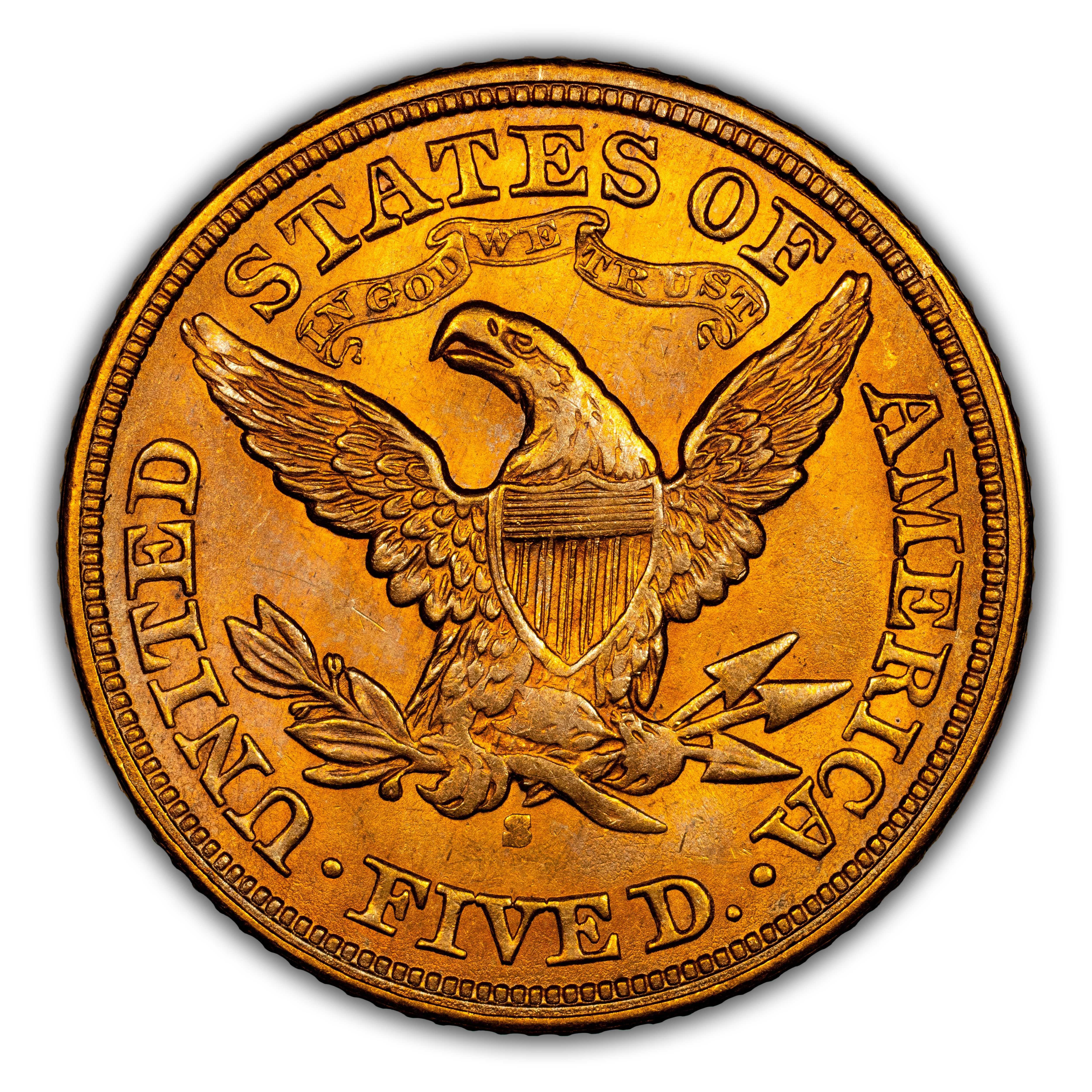 Reverse: Heraldic eagle holding arrows and branch in its claws is centered in the design with the words UNITED STATES OF AMERICA * FIVE D. around the periphery. Mintmark (if any) is located under the eagle's claws.