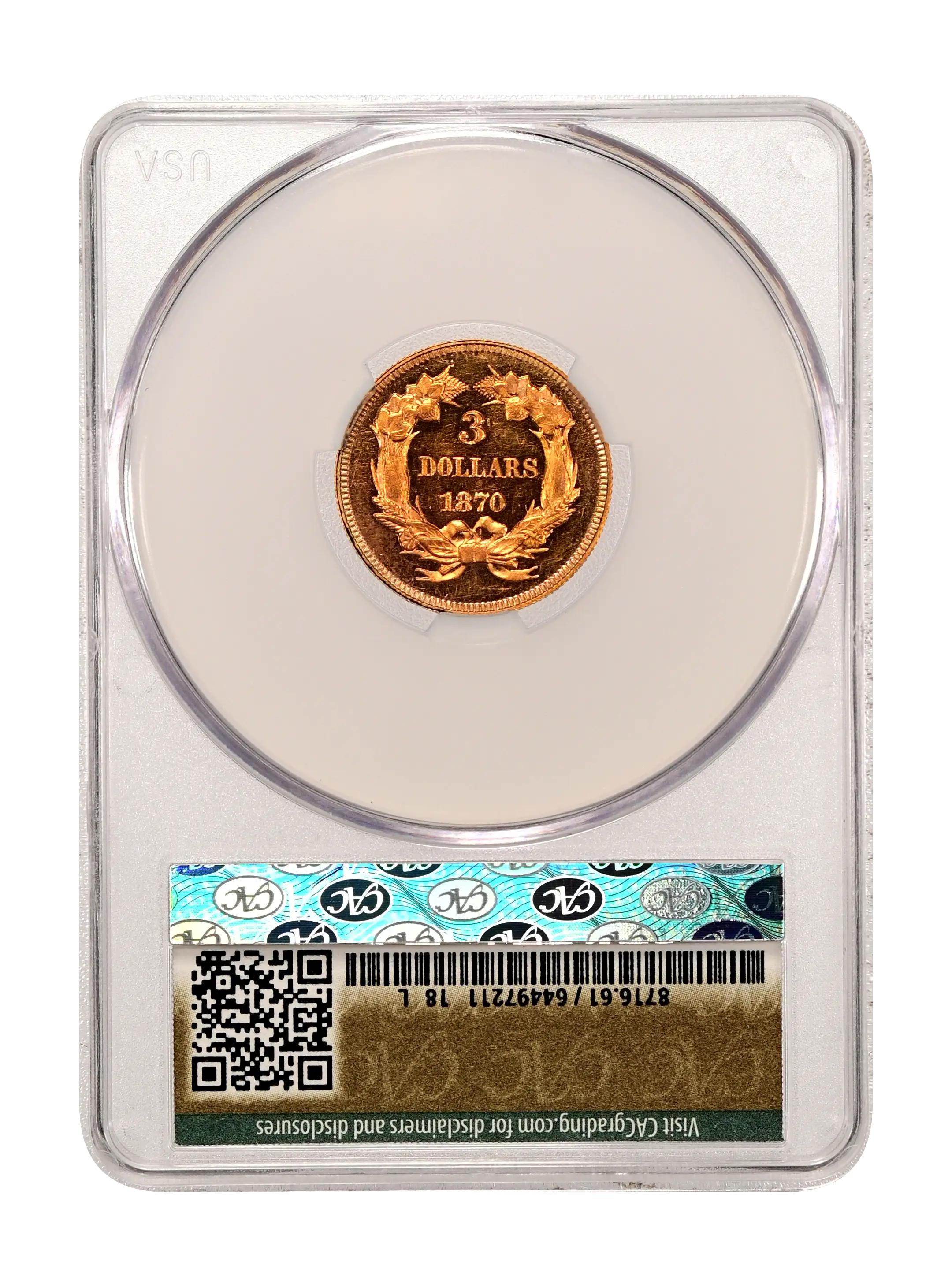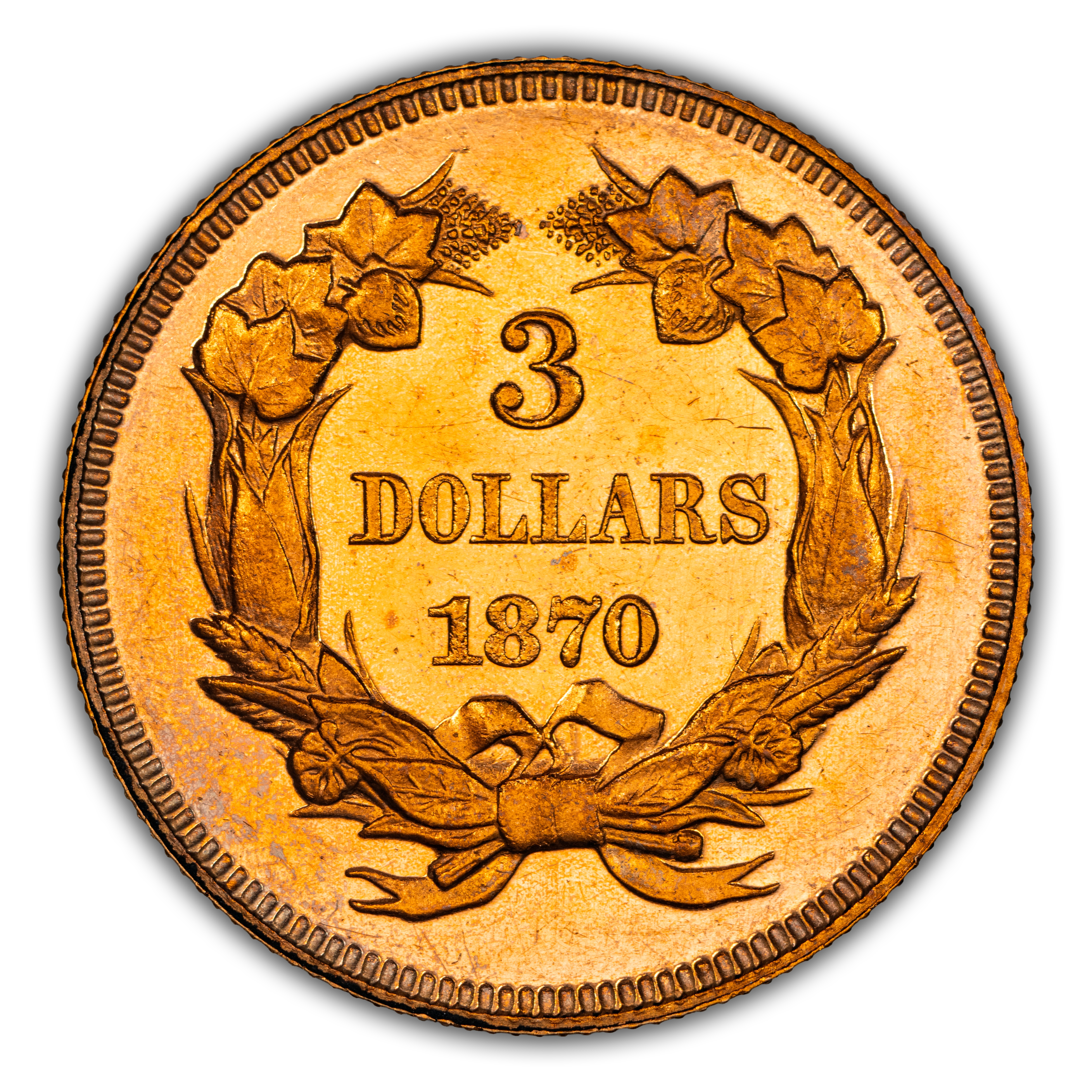 Reverse: "3 DOLLARS" is centered with date below, surrounded by a large wreath tied in a bow at the bottom.