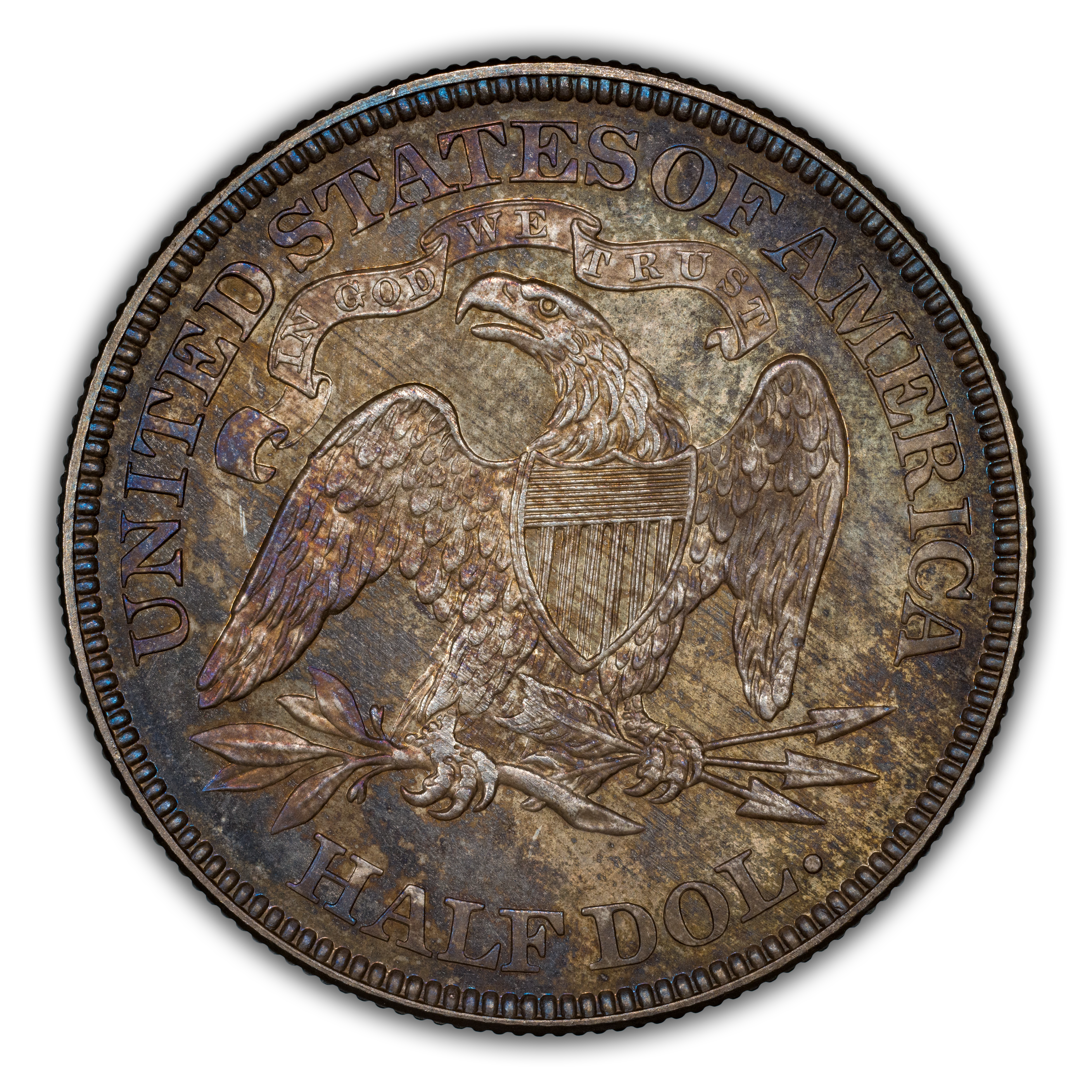 Reverse: The heraldic eagle is centered in the design with the words UNITED STATES OF AMERICA and HALF DOL. around the periphery. A ribbon above the eagle's head bears the motto IN GOD WE TRUST