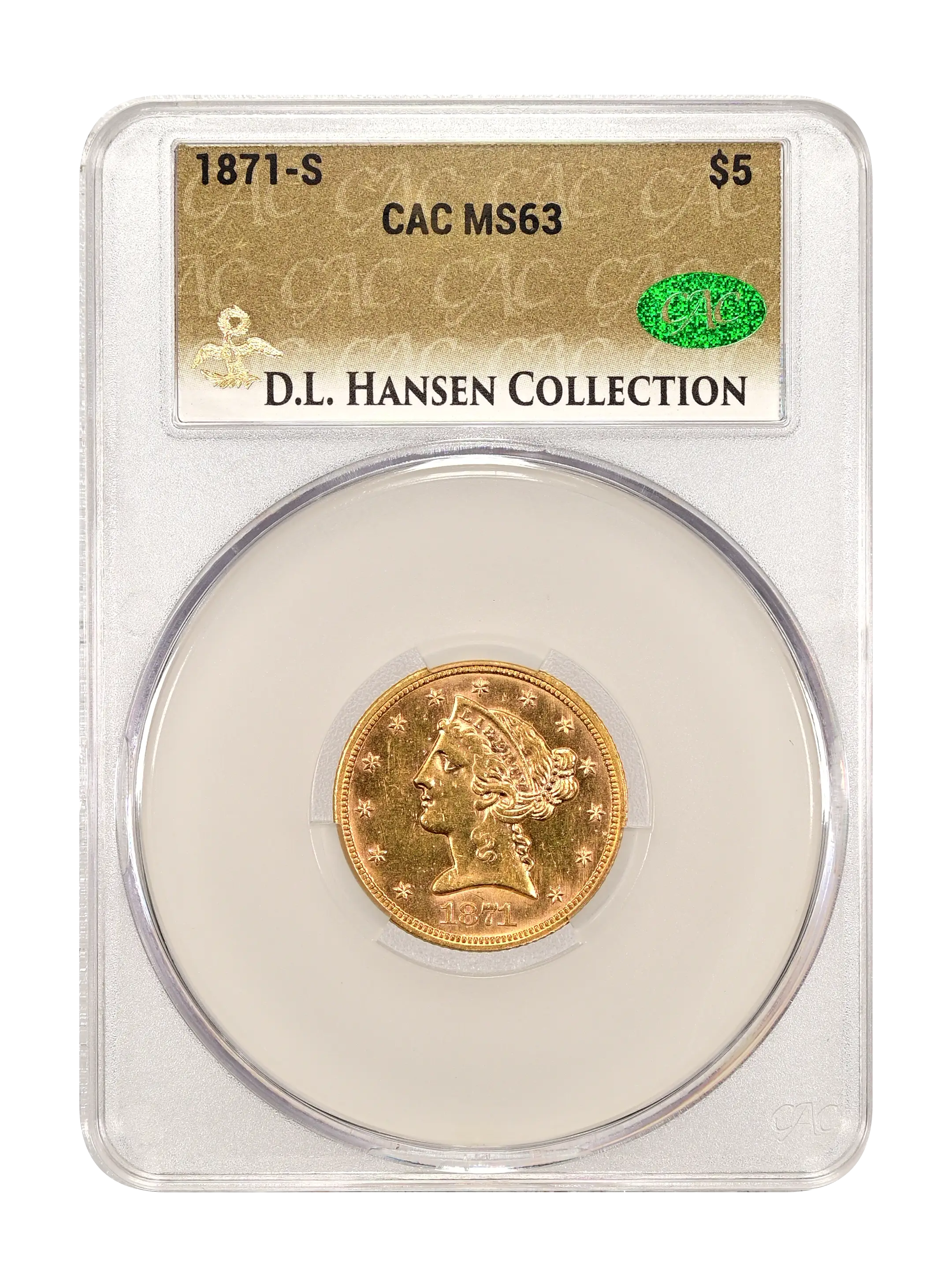 <B>1871-S $5 AU53 NGC.</B></I> NGC Census: 13 in 53, 37 finer (11/25). CDN: $2,250 Whsle. Bid for NGC/PCGS AU53. Mintage 25,000. ...