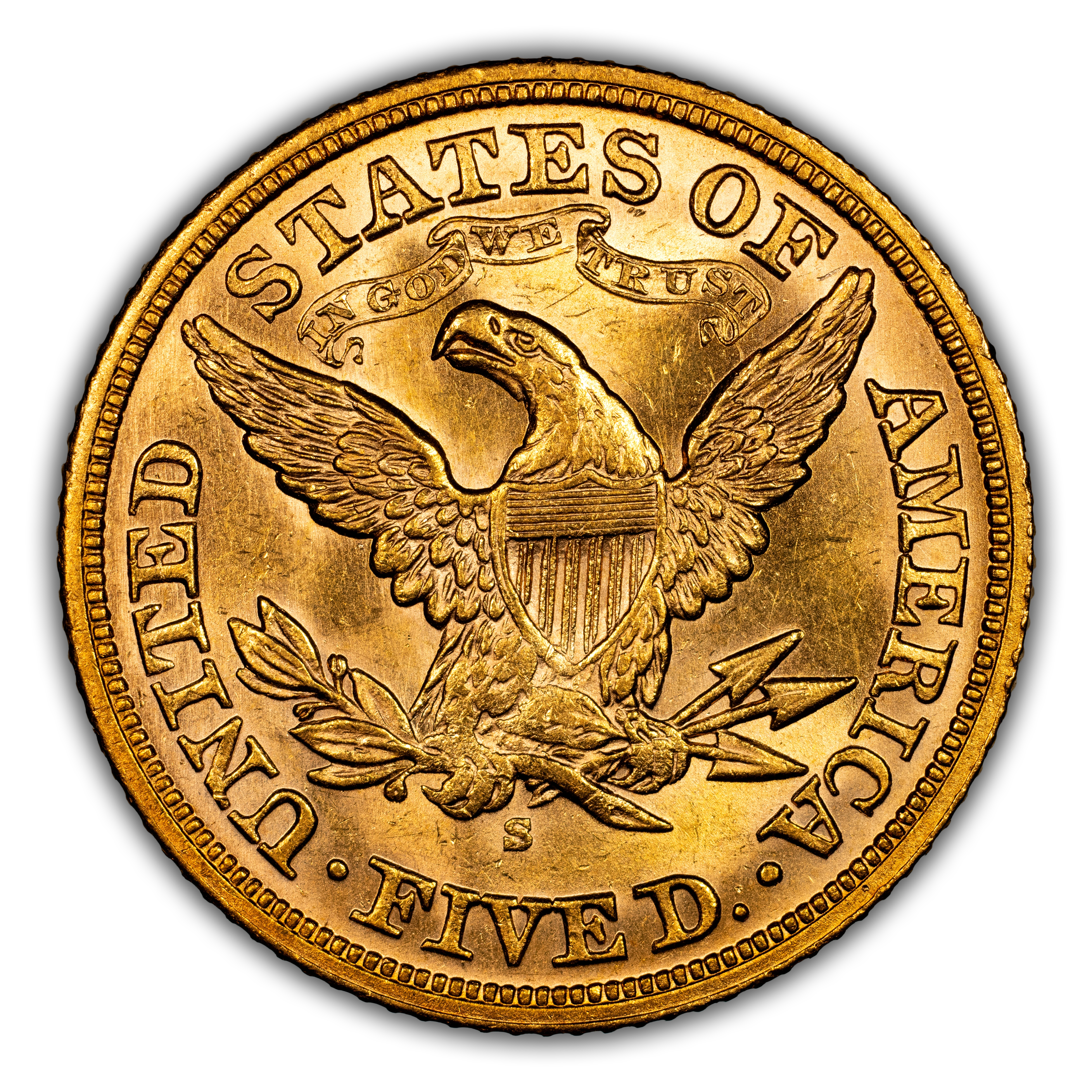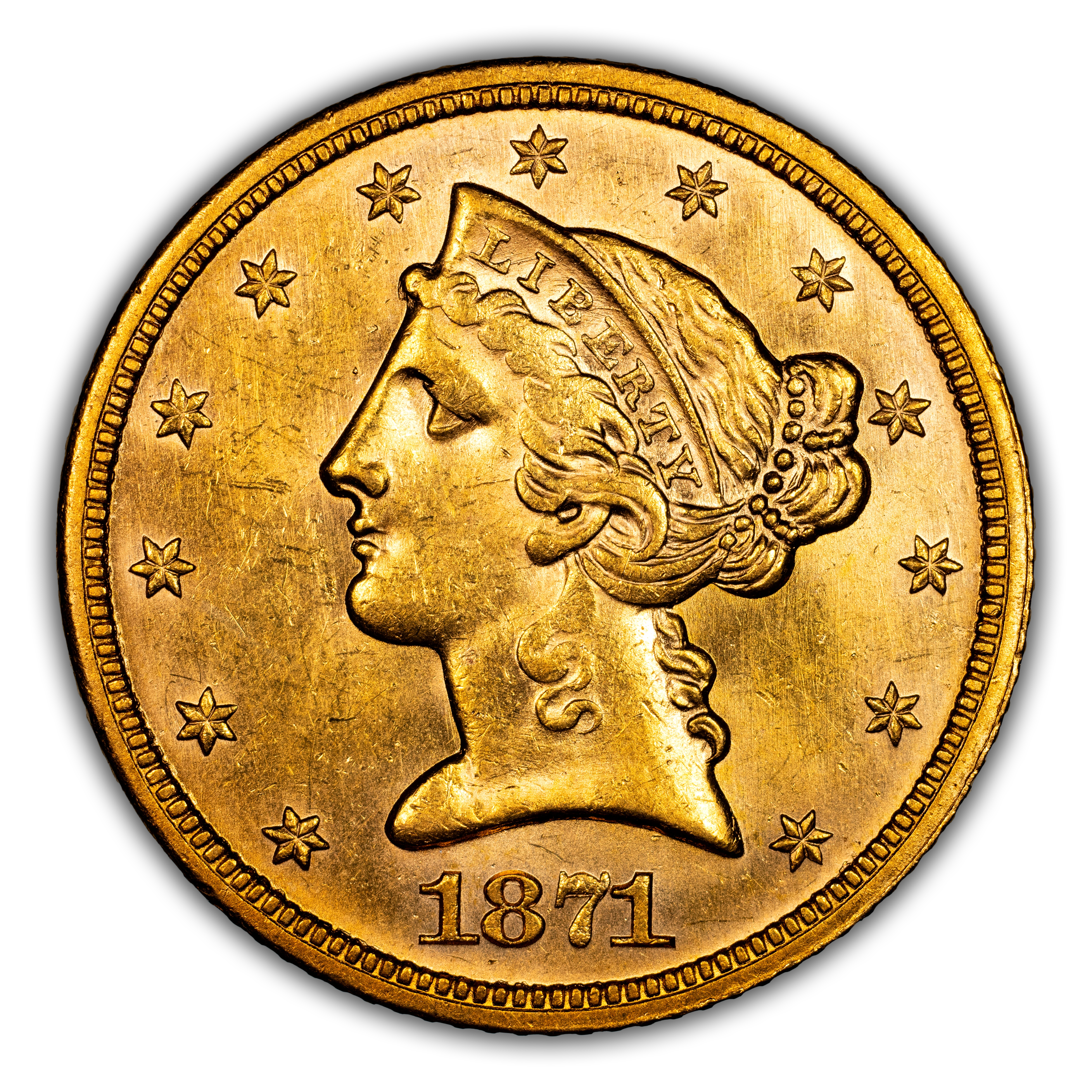 1871-S $5 AU53 NGC. NGC Census: (11/33). PCGS Population: (6/18). CDN: $2,250 Whsle. Bid for NGC/PCGS AU53. Mintage 25,000....