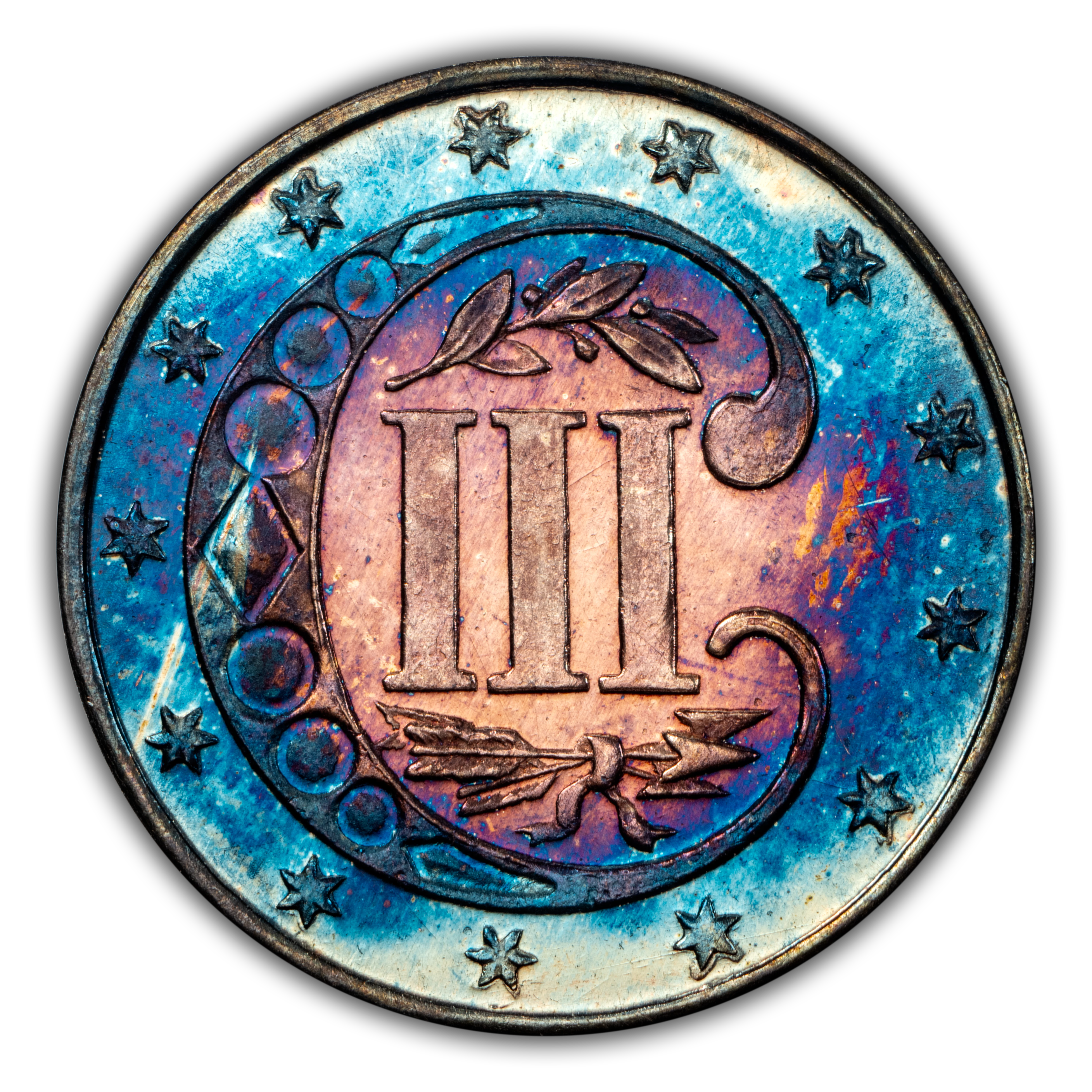 Reverse: The roman numeral III is centered in the design ensconced in a large, bejeweled letter C surrounded by 13 stars on the periphery. An olive sprig is added above the roman numerals.