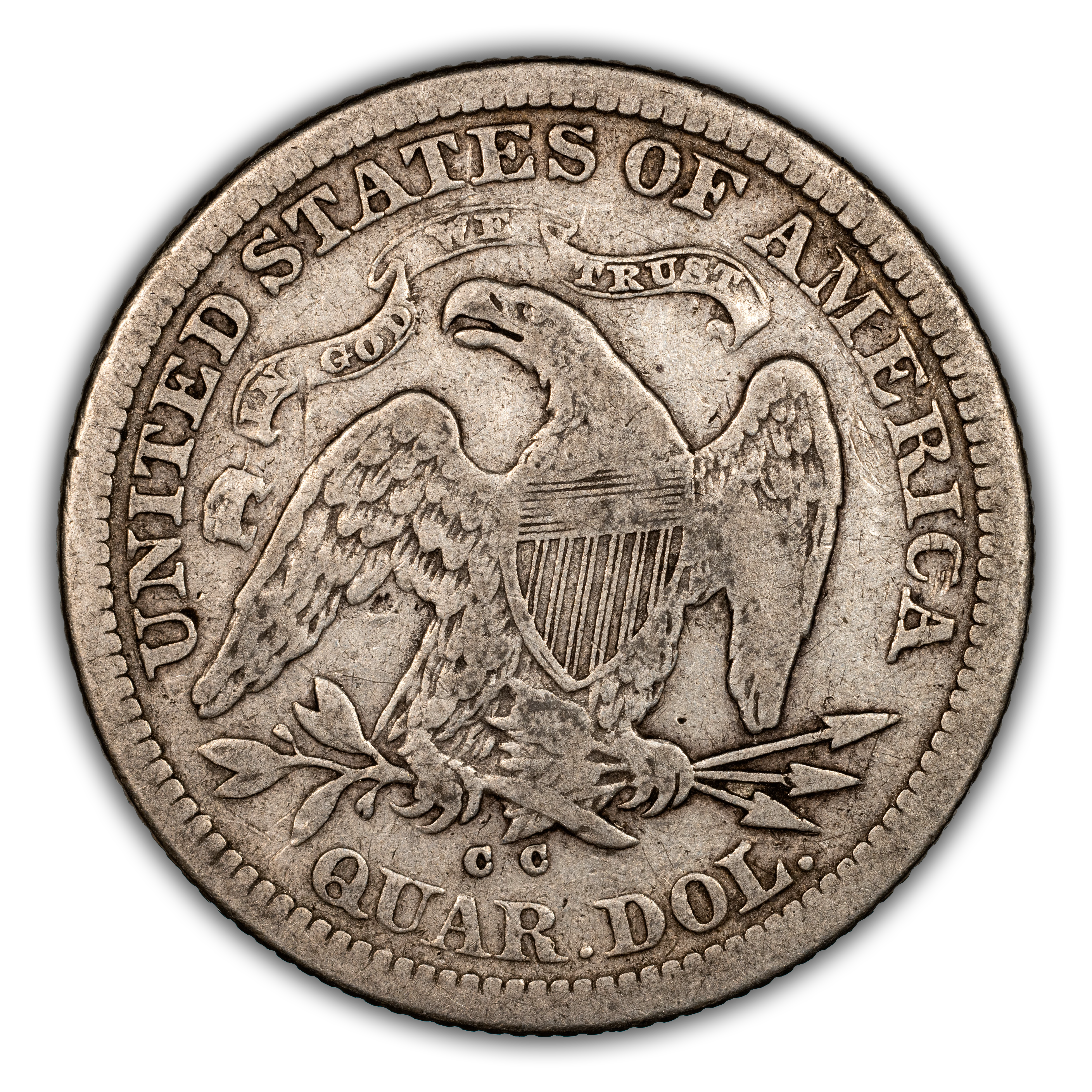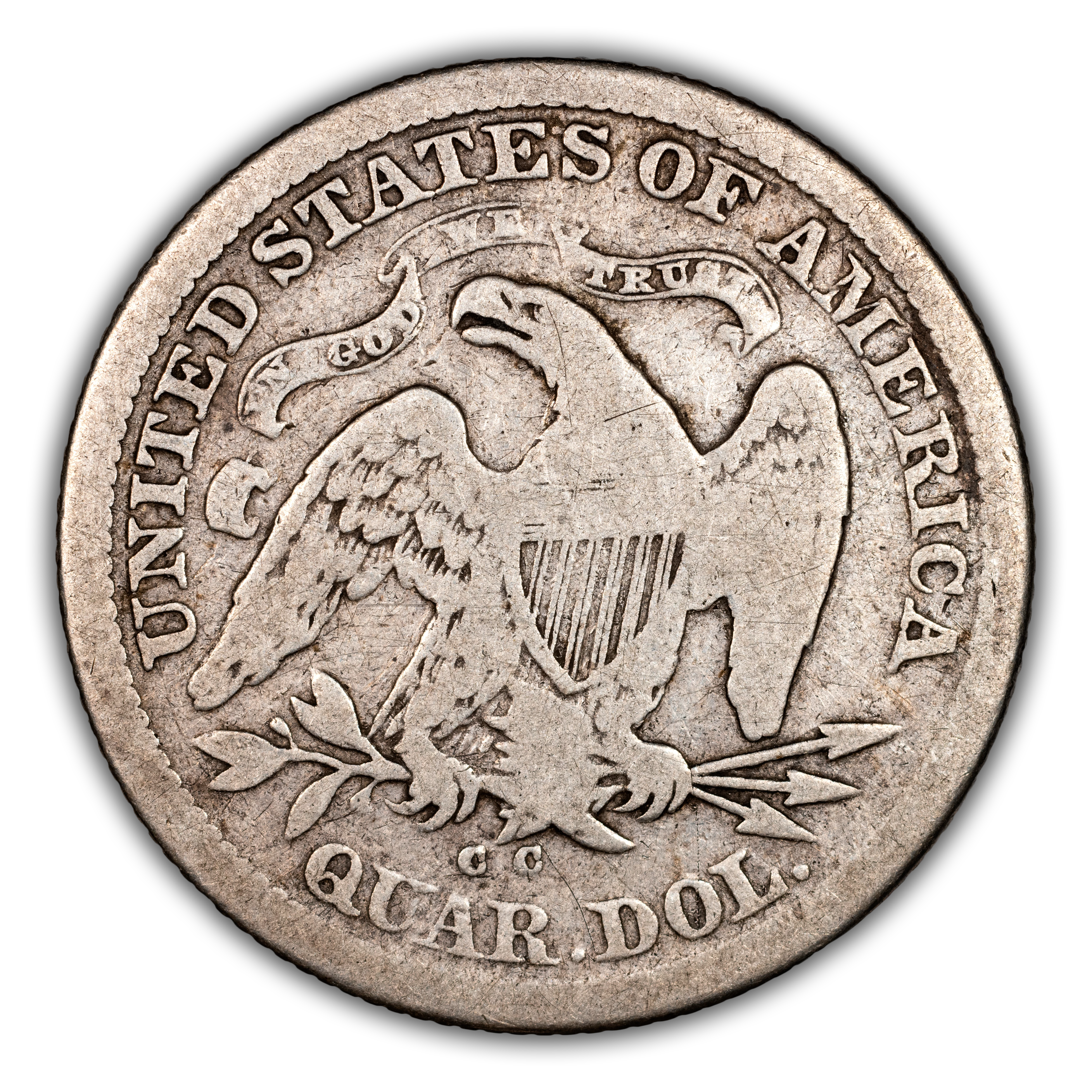 Reverse: The heraldic eagle is centered in the design with the words UNITED STATES OF AMERICA and QUAR. DOL. around the periphery. A ribbon above the eagle's head bears the motto IN GOD WE TRUST