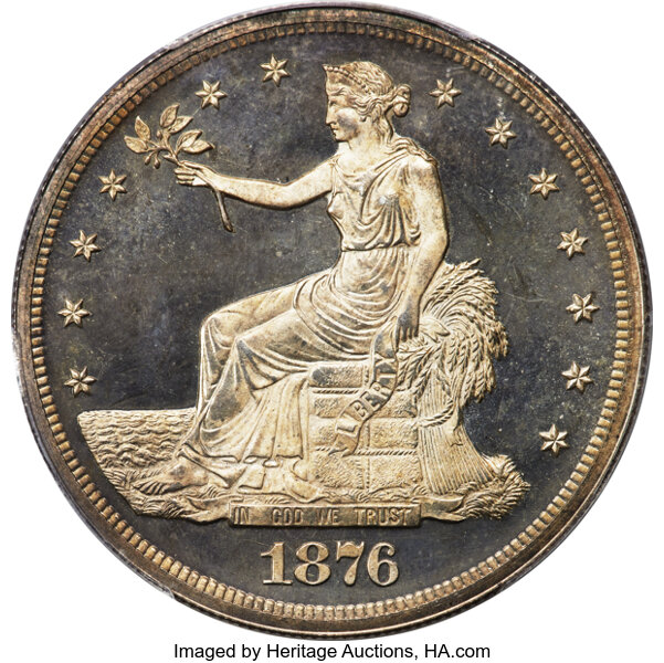 Reverse: An eagle is centered in the design with the weight of the coin listed below as "420 GRAINS. 900 FINE." The words UNITED STATES OF AMERICA and TRADE DOLLAR adorn the top and bottom periphery with a ribbon stating the motto E PLURIBUS UNUM above the eagle's head.