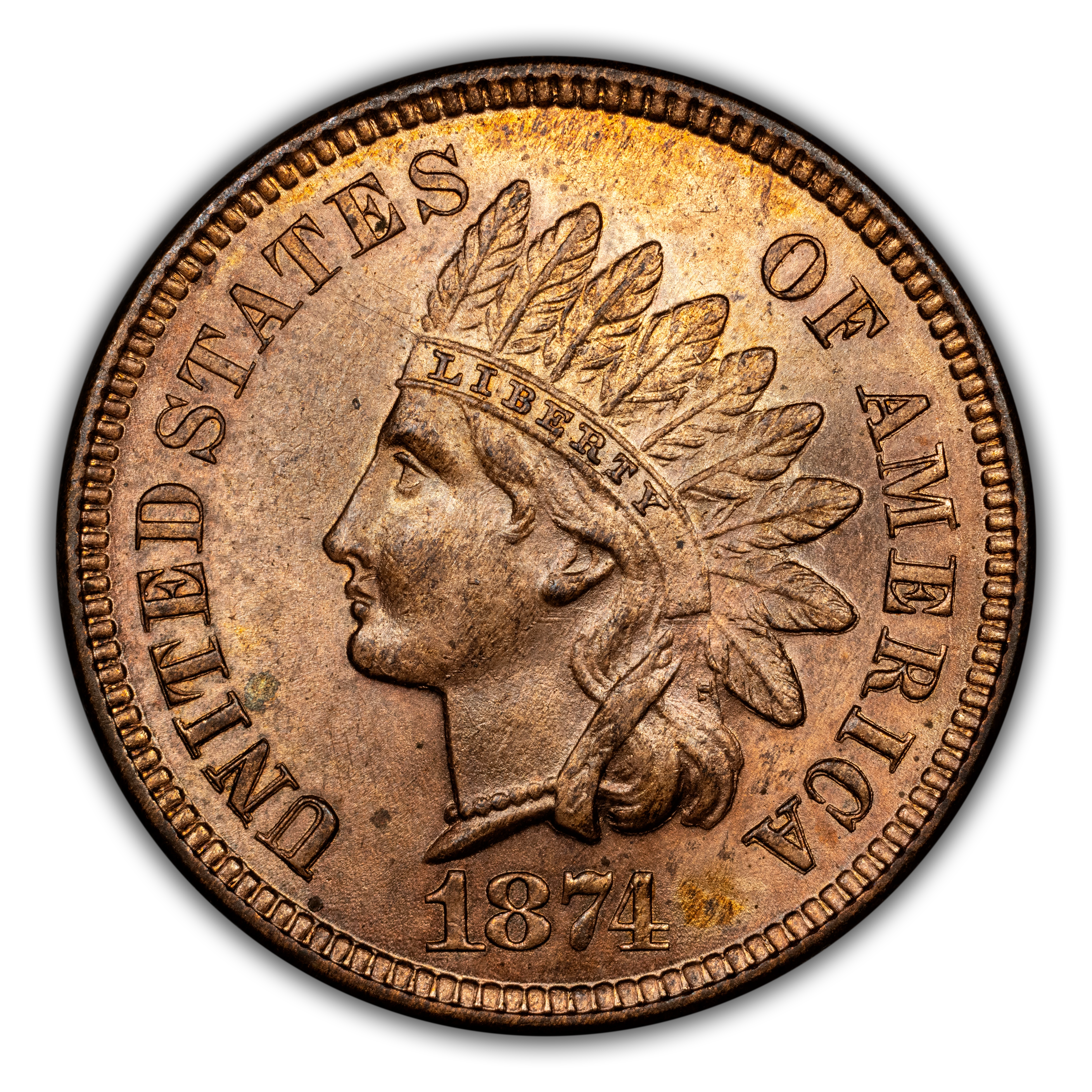 A near semi-key date in the Indian Cent Series in which very few have been saved, explains the scarcity of the 1874. Most of the surviving examples are known in circulated grades. Scarce in Mint State as the value gradually increases with more red color. High-end red gems are extremely rare.