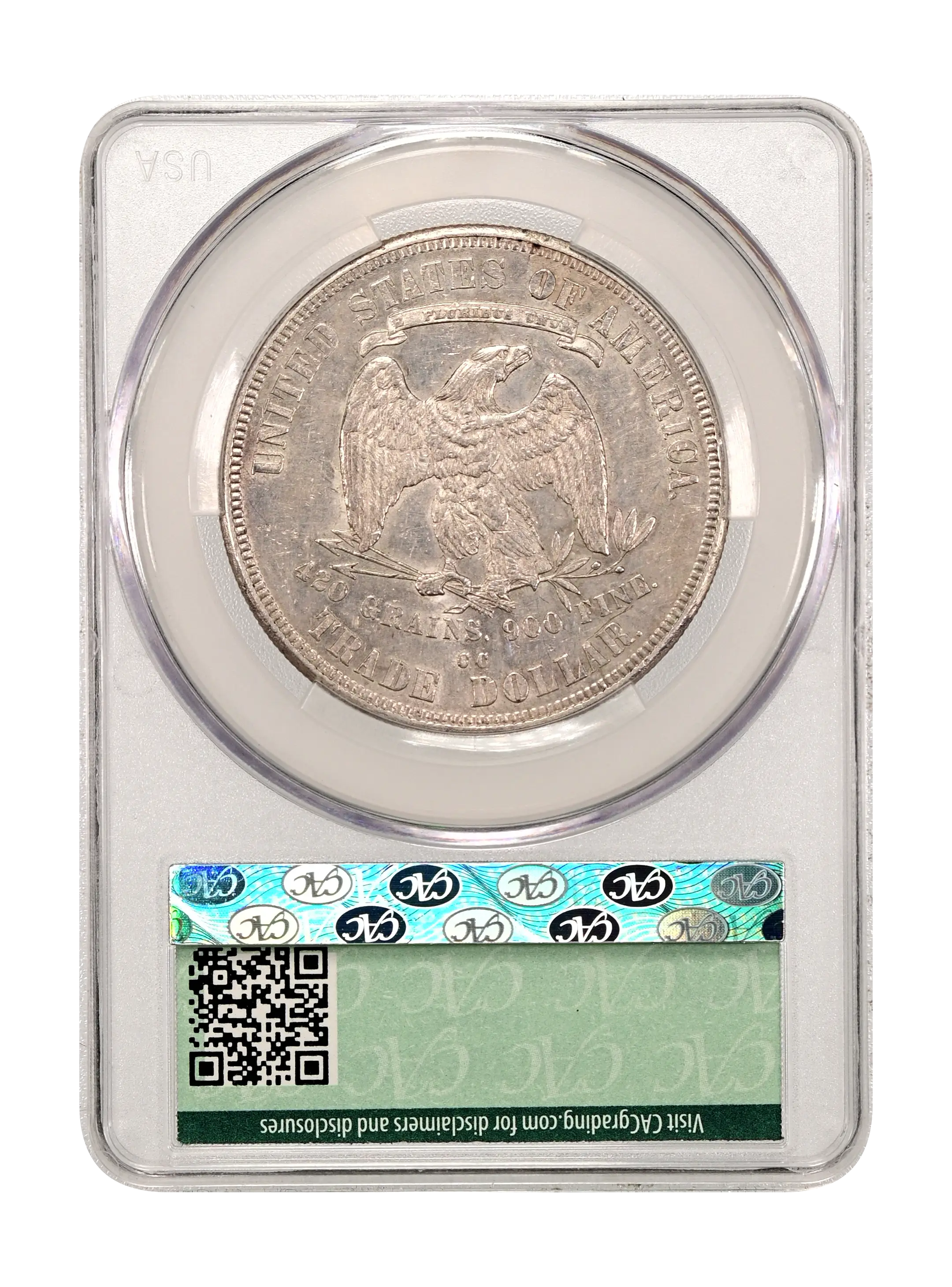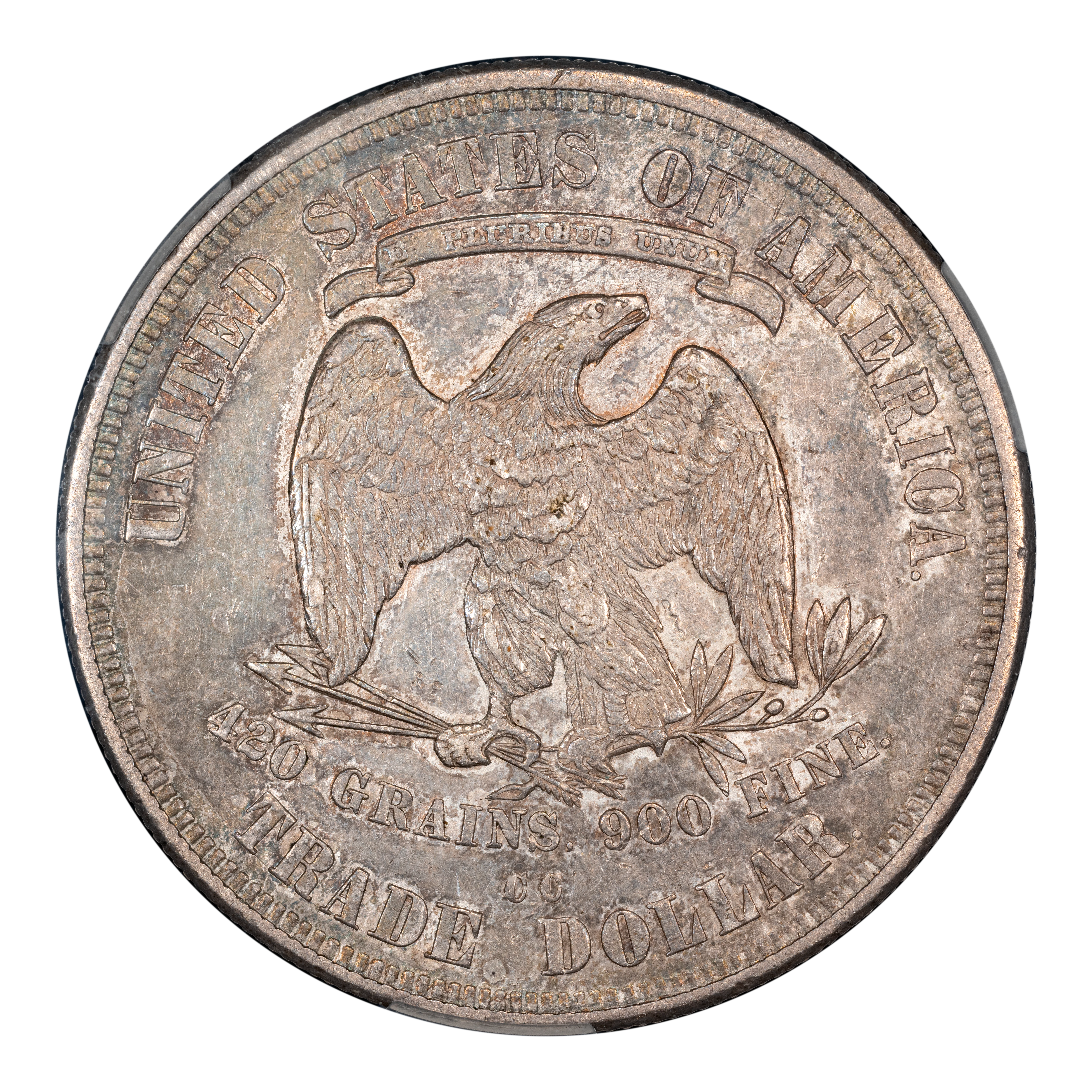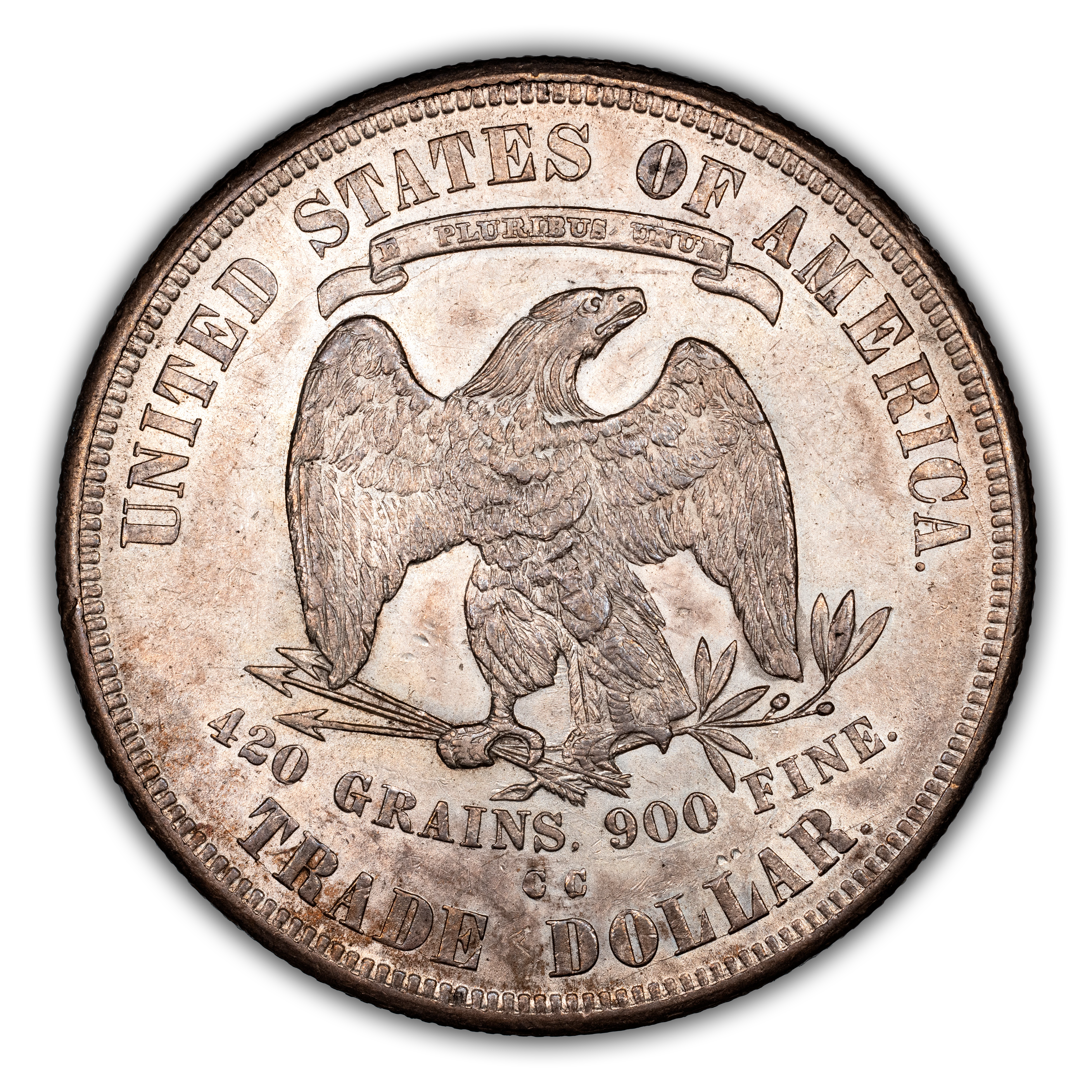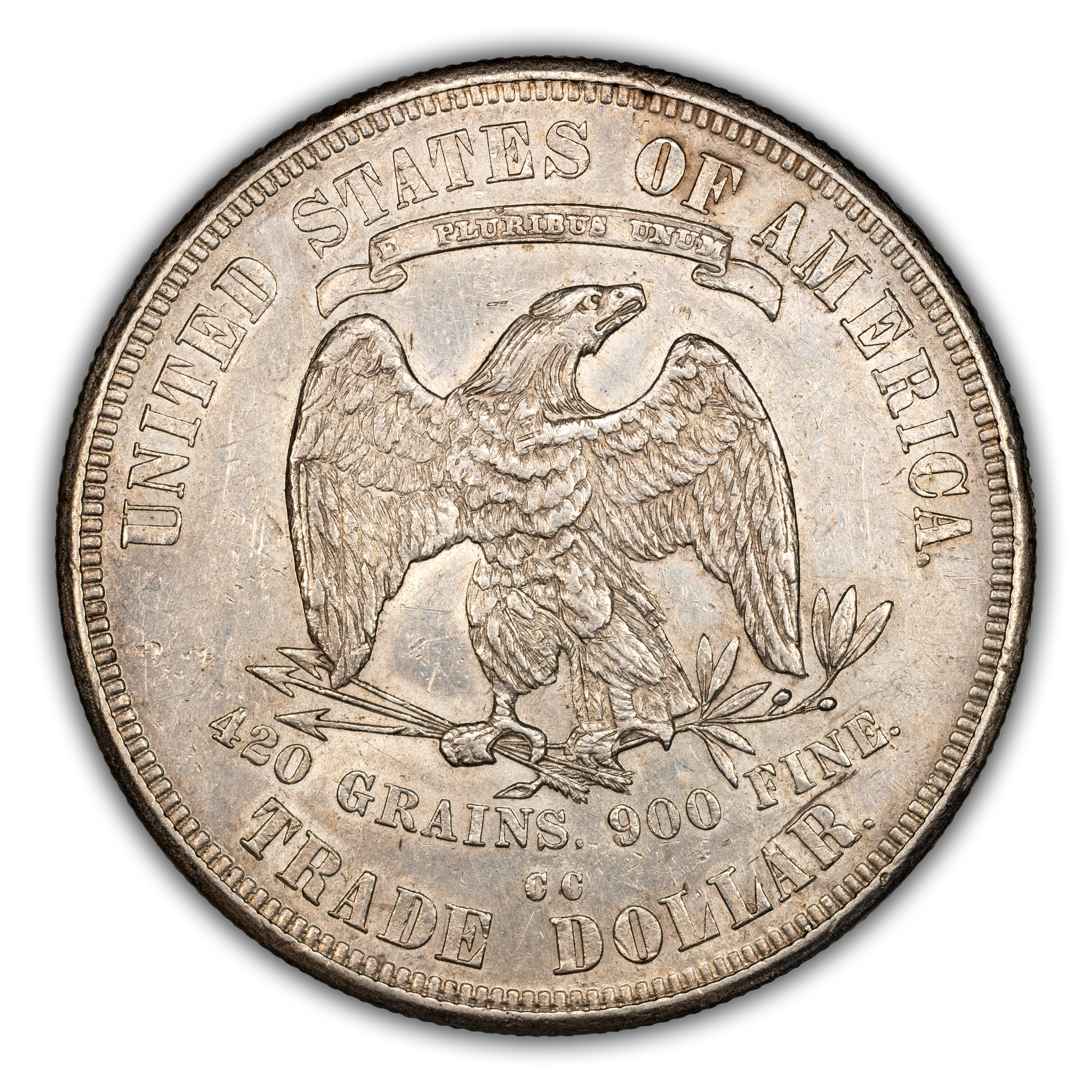 Reverse: An eagle is centered in the design with the weight of the coin listed below as "420 GRAINS. 900 FINE." The words UNITED STATES OF AMERICA and TRADE DOLLAR adorn the top and bottom periphery with a ribbon stating the motto E PLURIBUS UNUM above the eagle's head. The mint mark is positioned below the eagle and weight text, above the "E D" of TRADE DOLLAR. Type II reverse without the extra berry under the eagle's left (viewer's right) claw. Arrowhead ends over 2 in "420".