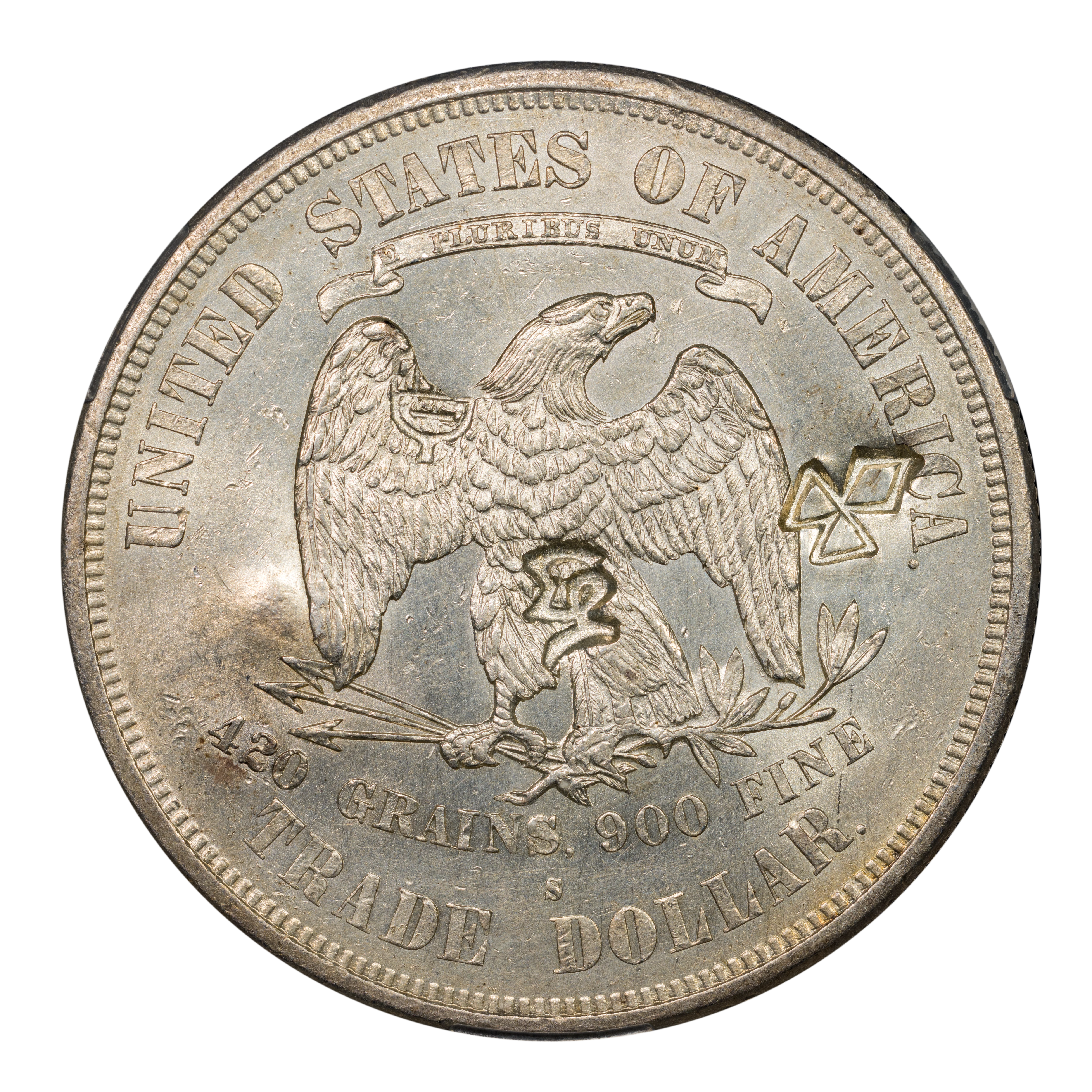 Reverse: An eagle is centered in the design with the weight of the coin listed below as "420 GRAINS. 900 FINE." The words UNITED STATES OF AMERICA and TRADE DOLLAR adorn the top and bottom periphery with a ribbon stating the motto E PLURIBUS UNUM above the eagle's head. The mint mark is positioned below the eagle and weight text, above the "E D" of TRADE DOLLAR.