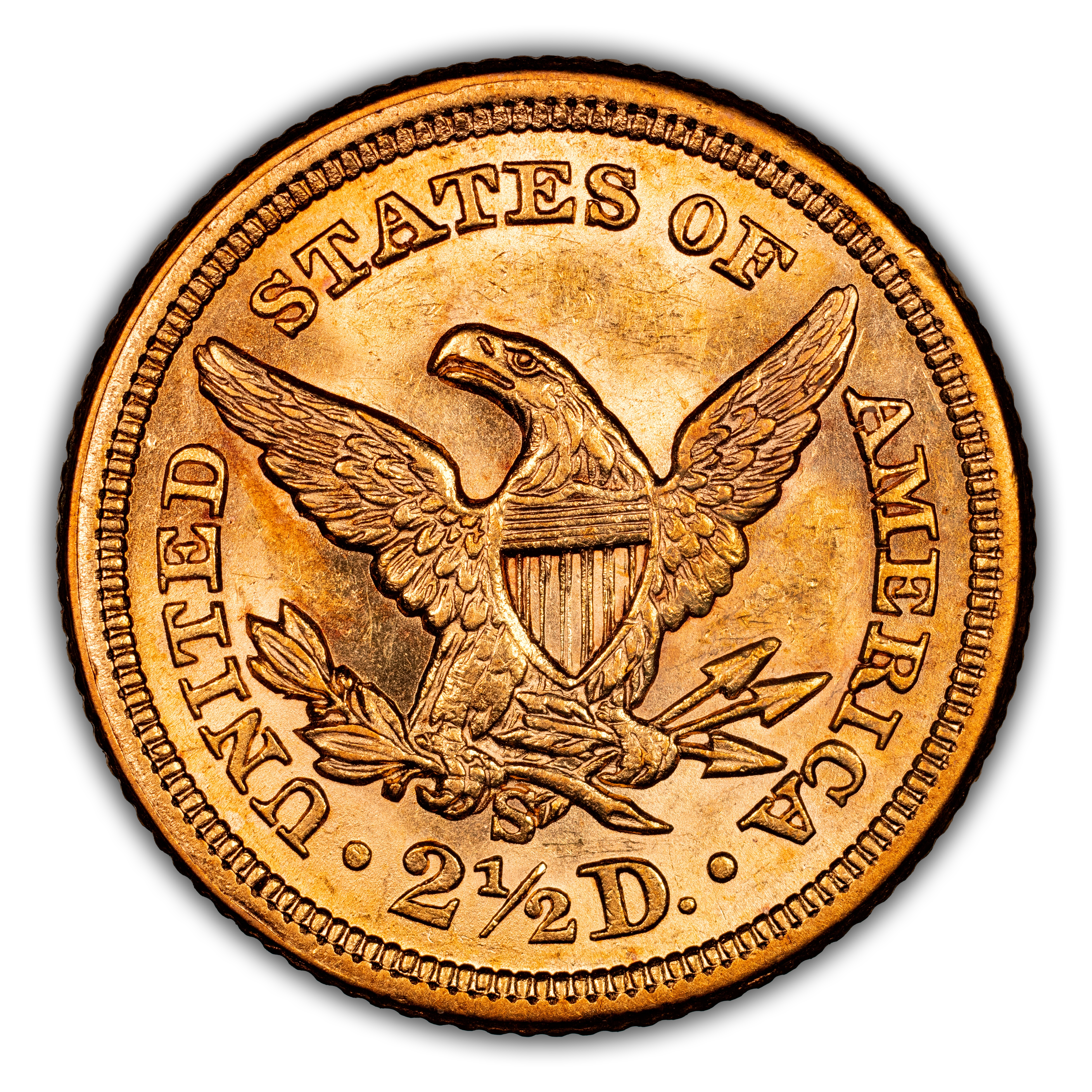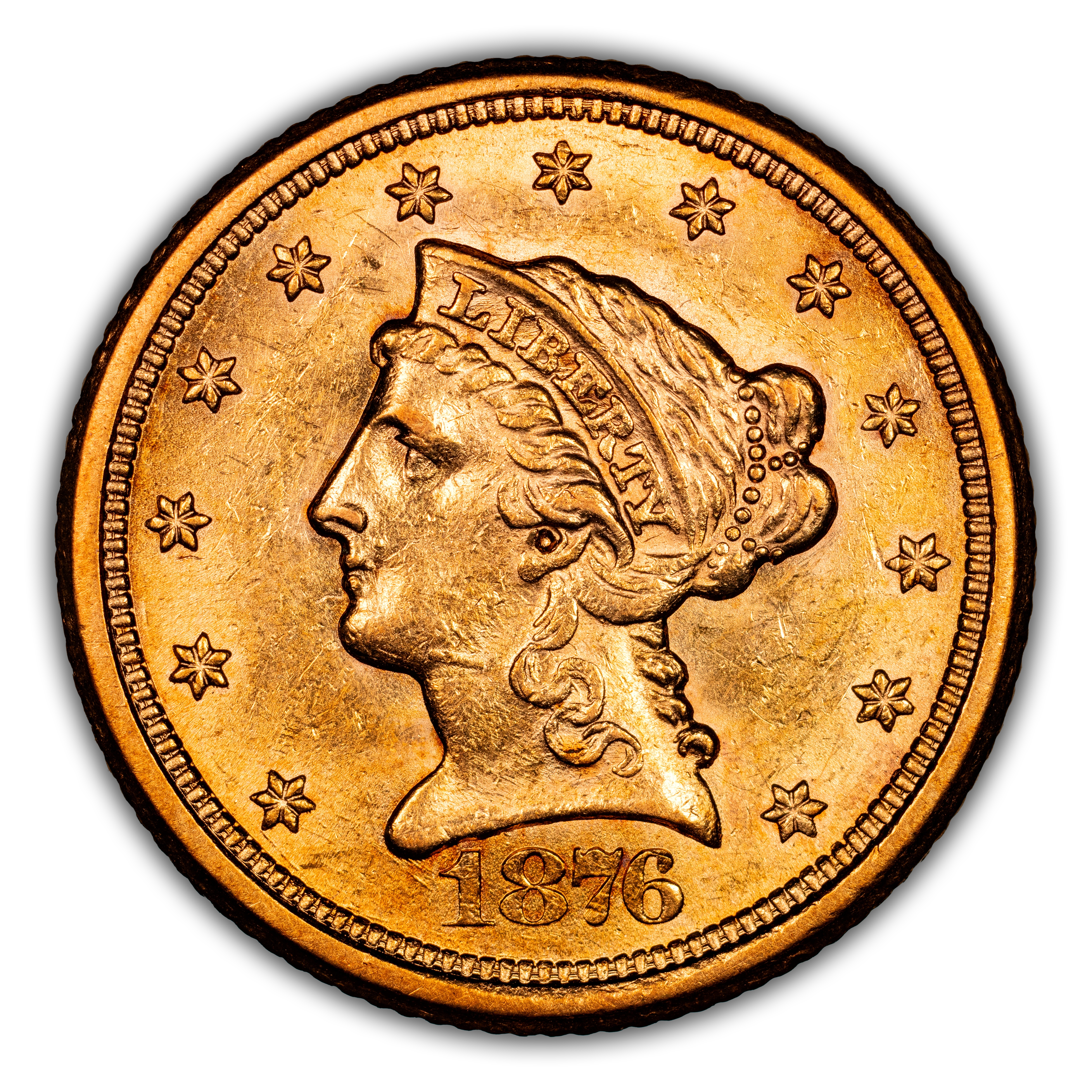 1876-S $2 1/2 AU50 PCGS. PCGS Population: (14/70 and 0/0+). NGC Census: (7/109 and 0/1+). CDN: $800 Whsle. Bid for NGC/PCGS...