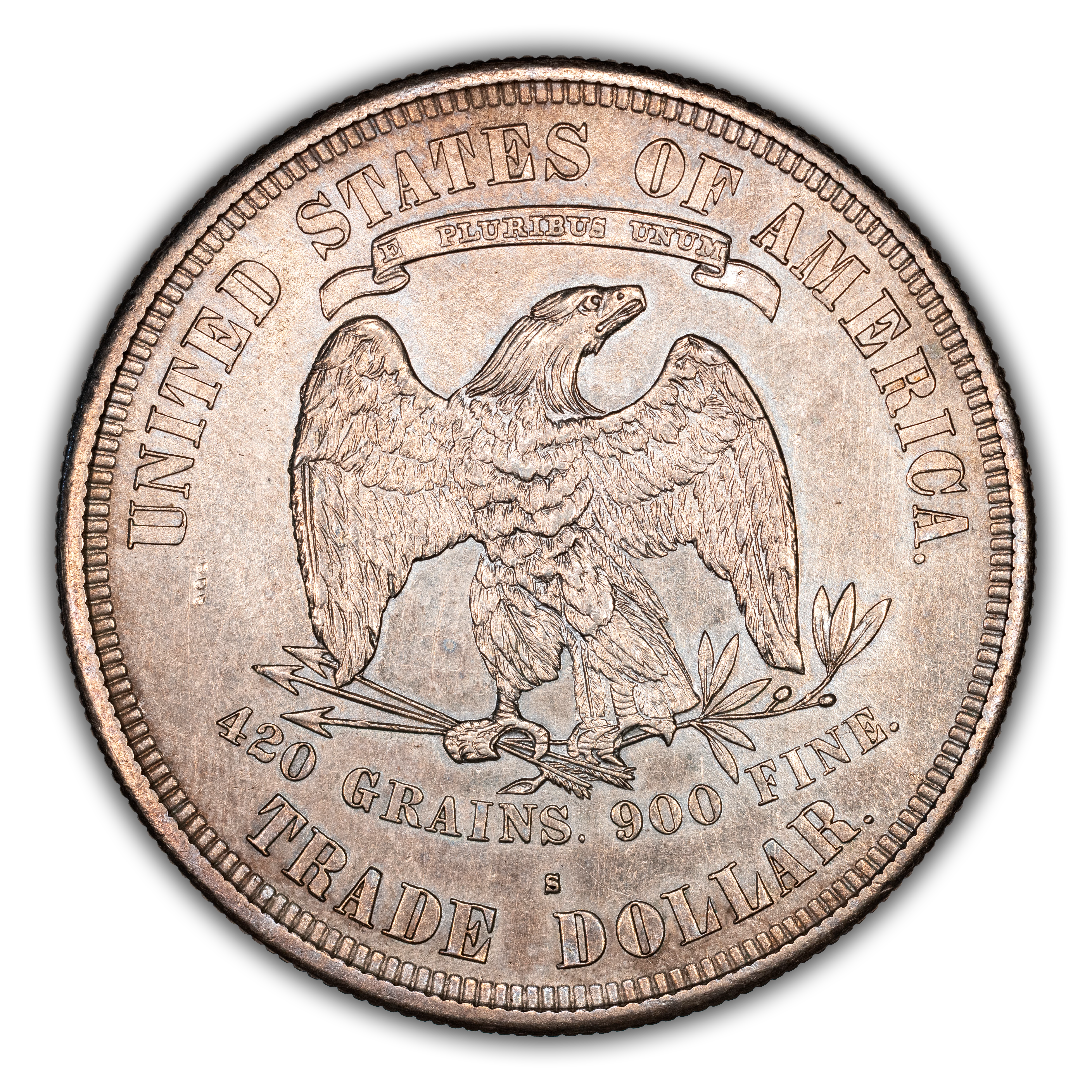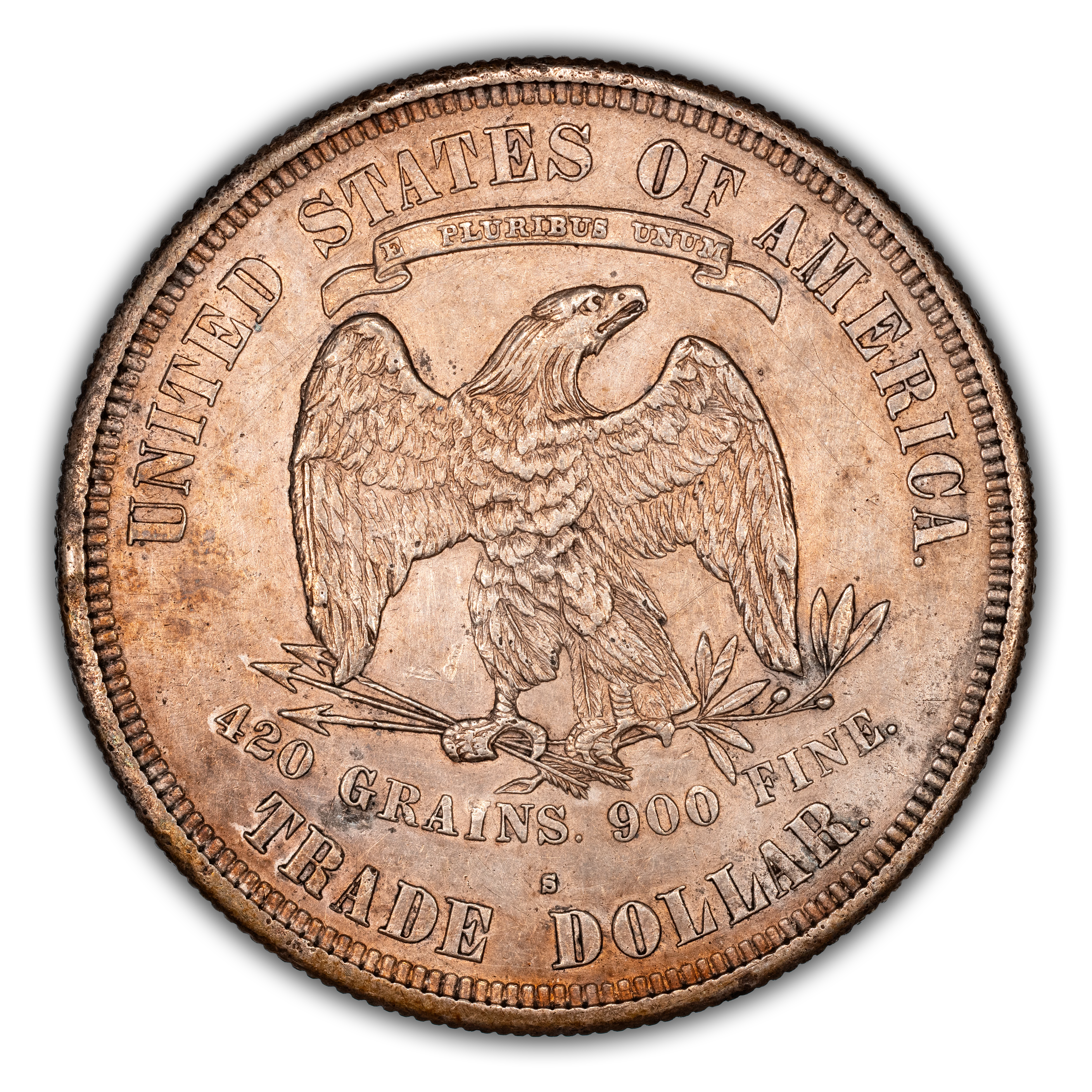 Reverse: An eagle is centered in the design with the weight of the coin listed below as "420 GRAINS. 900 FINE." The words UNITED STATES OF AMERICA and TRADE DOLLAR adorn the top and bottom periphery with a ribbon stating the motto E PLURIBUS UNUM above the eagle's head. The mint mark is positioned below the eagle and weight text, above the "E D" of TRADE DOLLAR. Type II reverse without the extra berry under the eagle's left (viewer's right) claw. Arrowhead ends over 2 in "420".