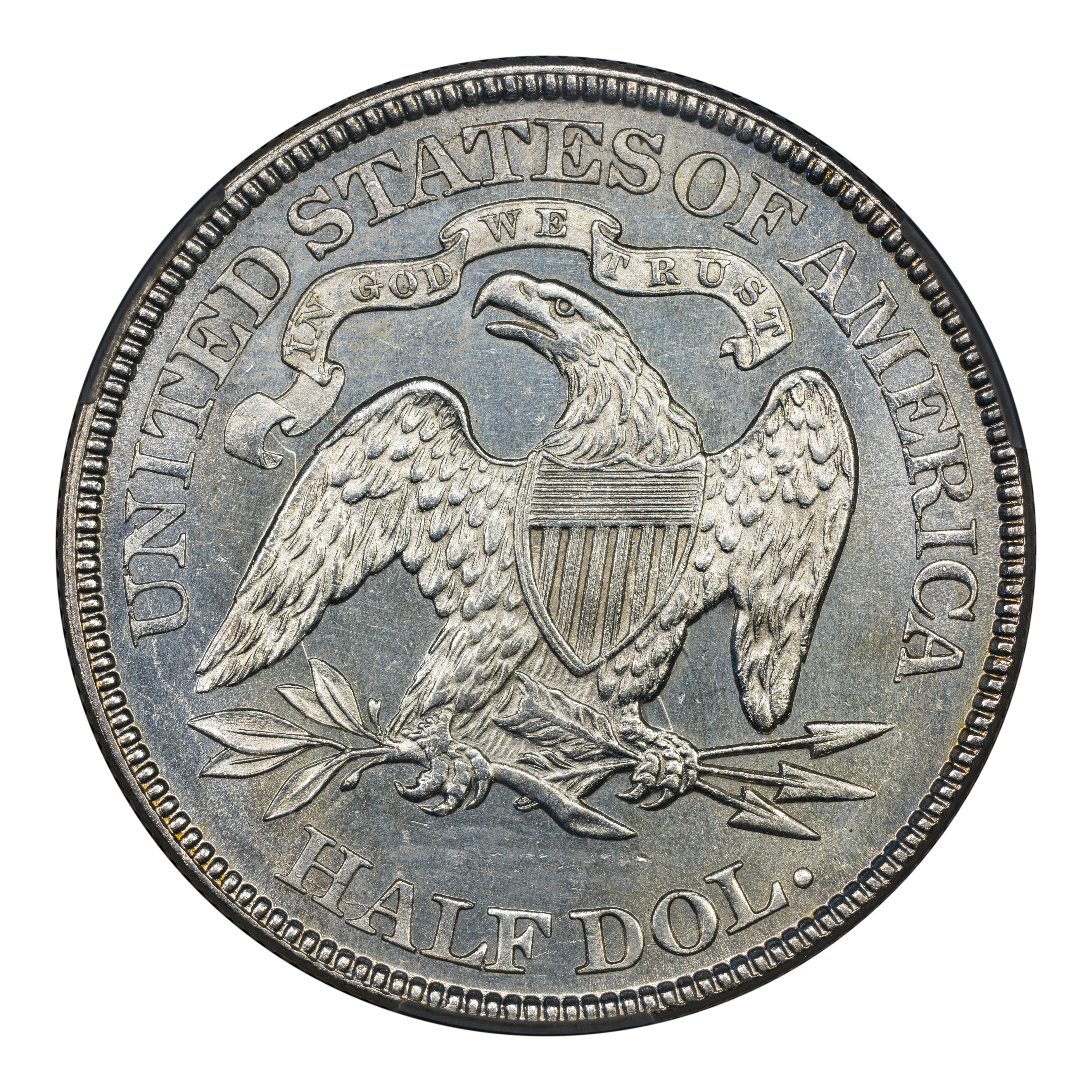 Reverse: The heraldic eagle is centered in the design with the words UNITED STATES OF AMERICA and HALF DOL. around the periphery. A ribbon above the eagle's head bears the motto IN GOD WE TRUST