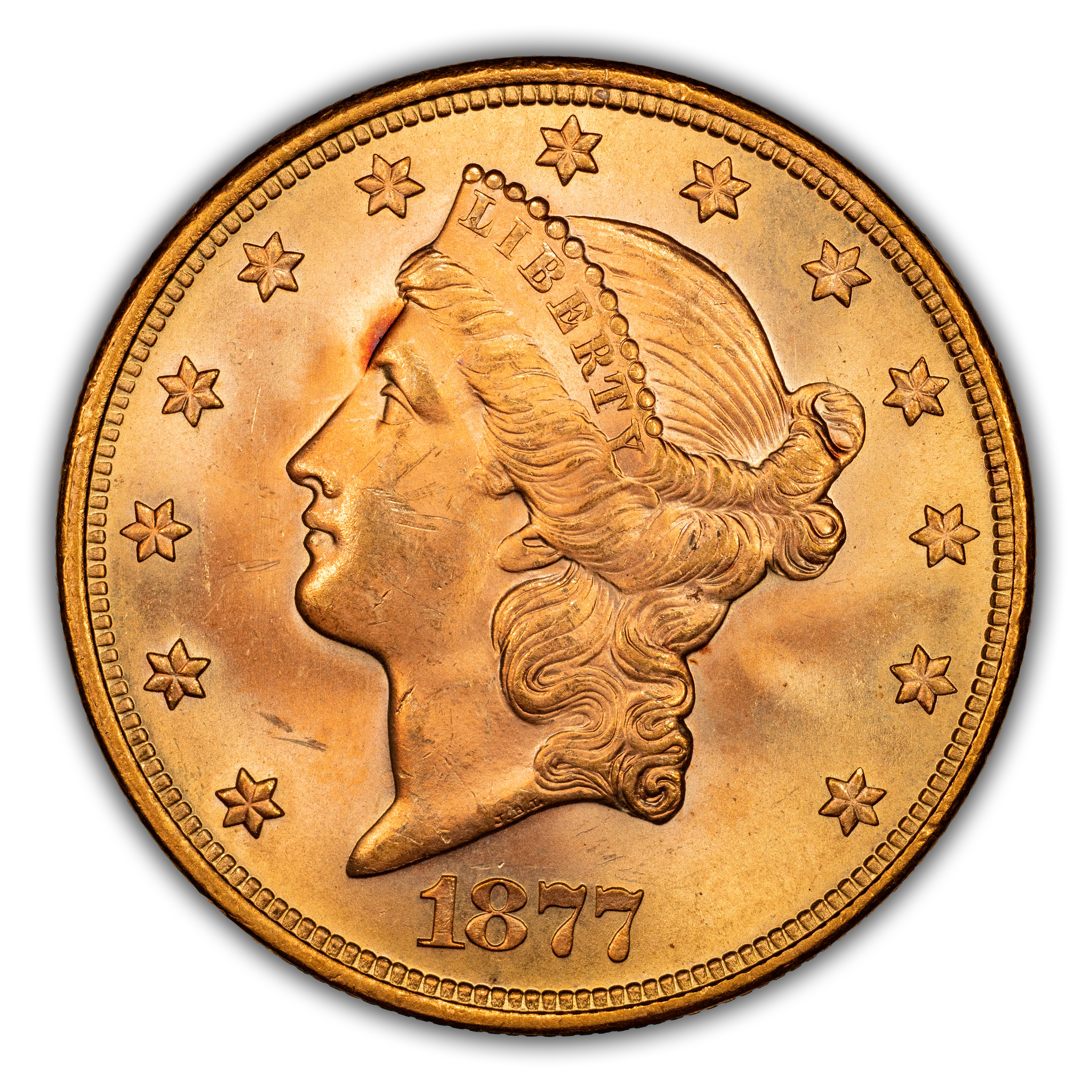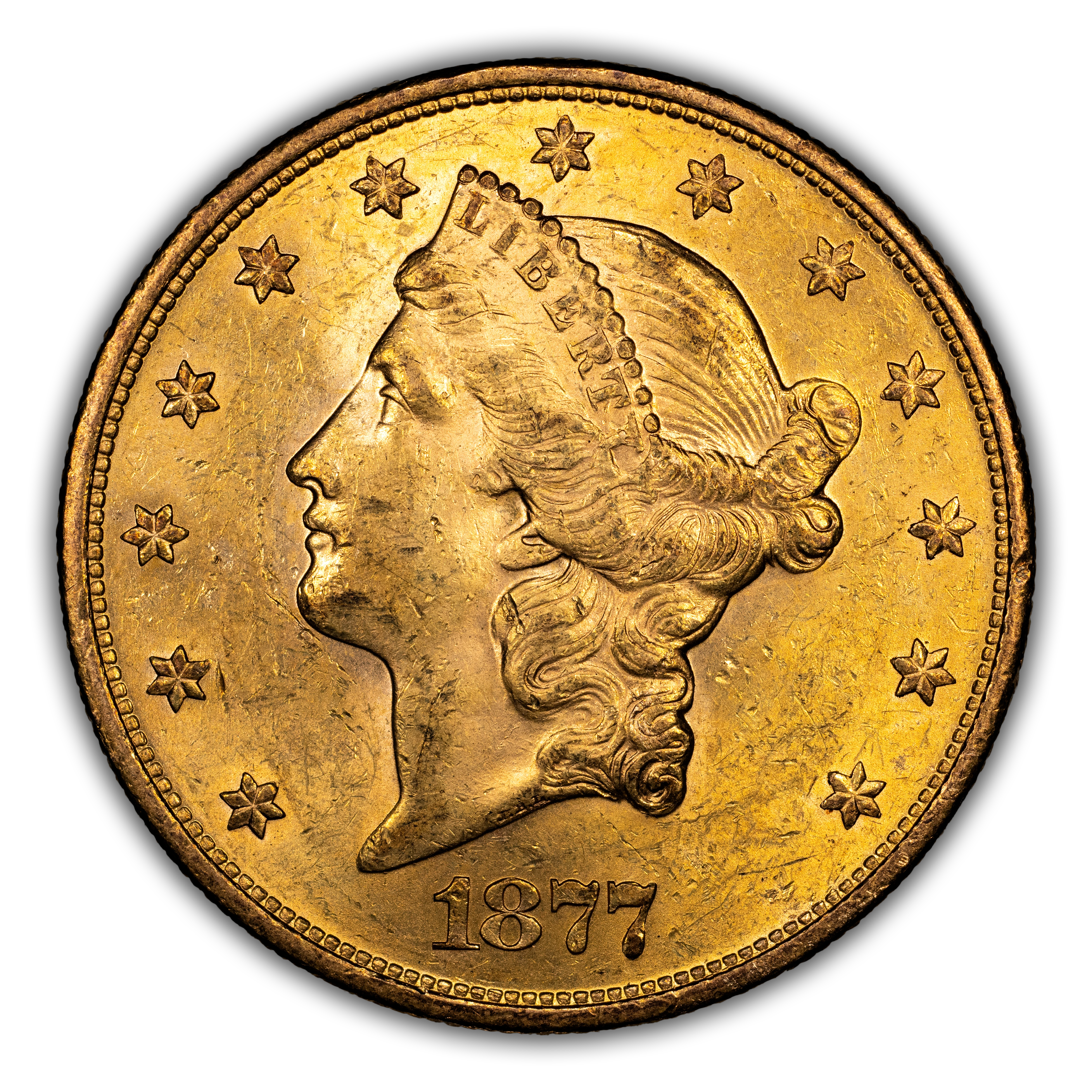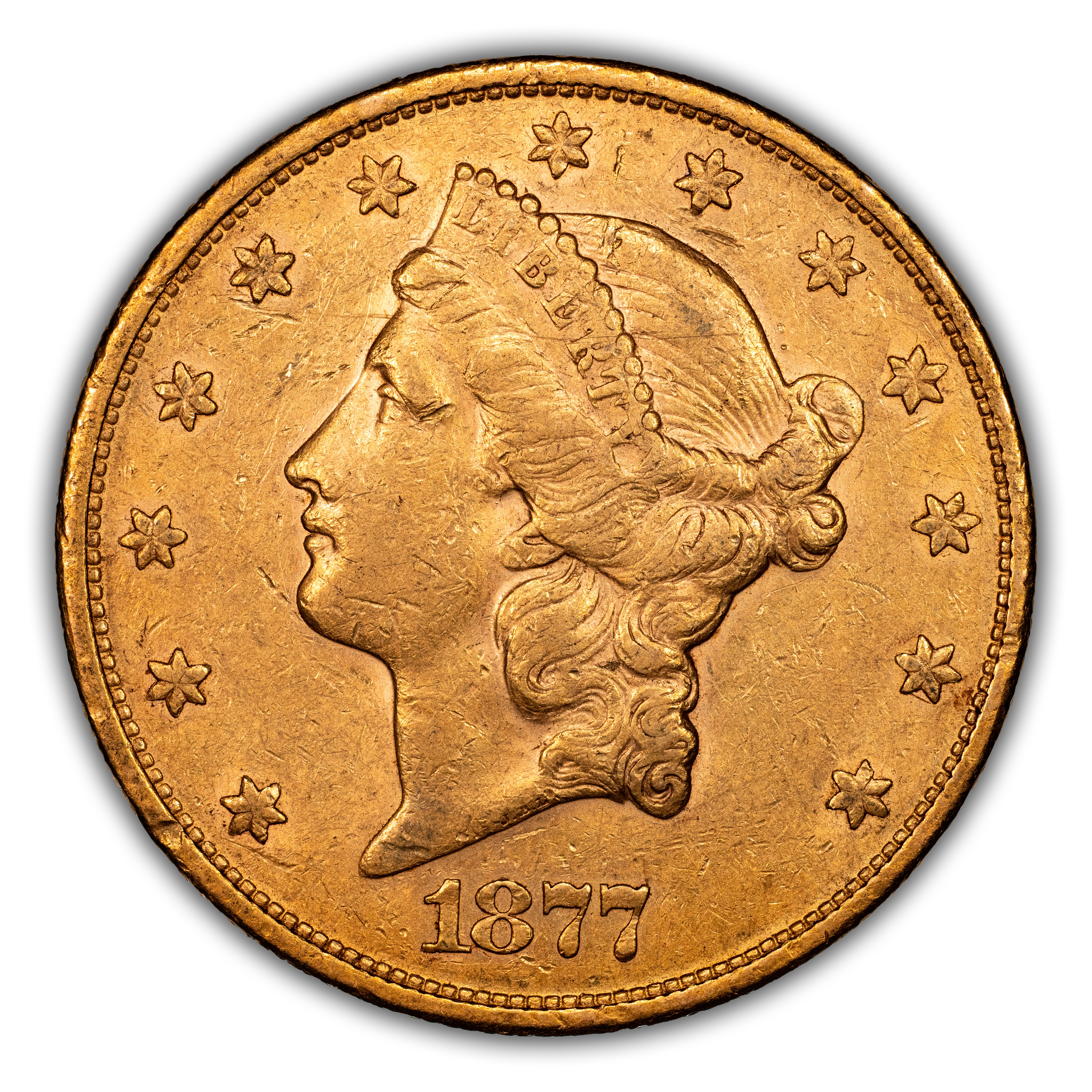 Reverse: Shielded eagle with wings outstretched holding arrows and olive branches. The words UNITED STATES OF AMERICA * TWENTY D. appear around the periphery. Mint mark, if any, appears below the eagle's tail, above the N in TWENTY.