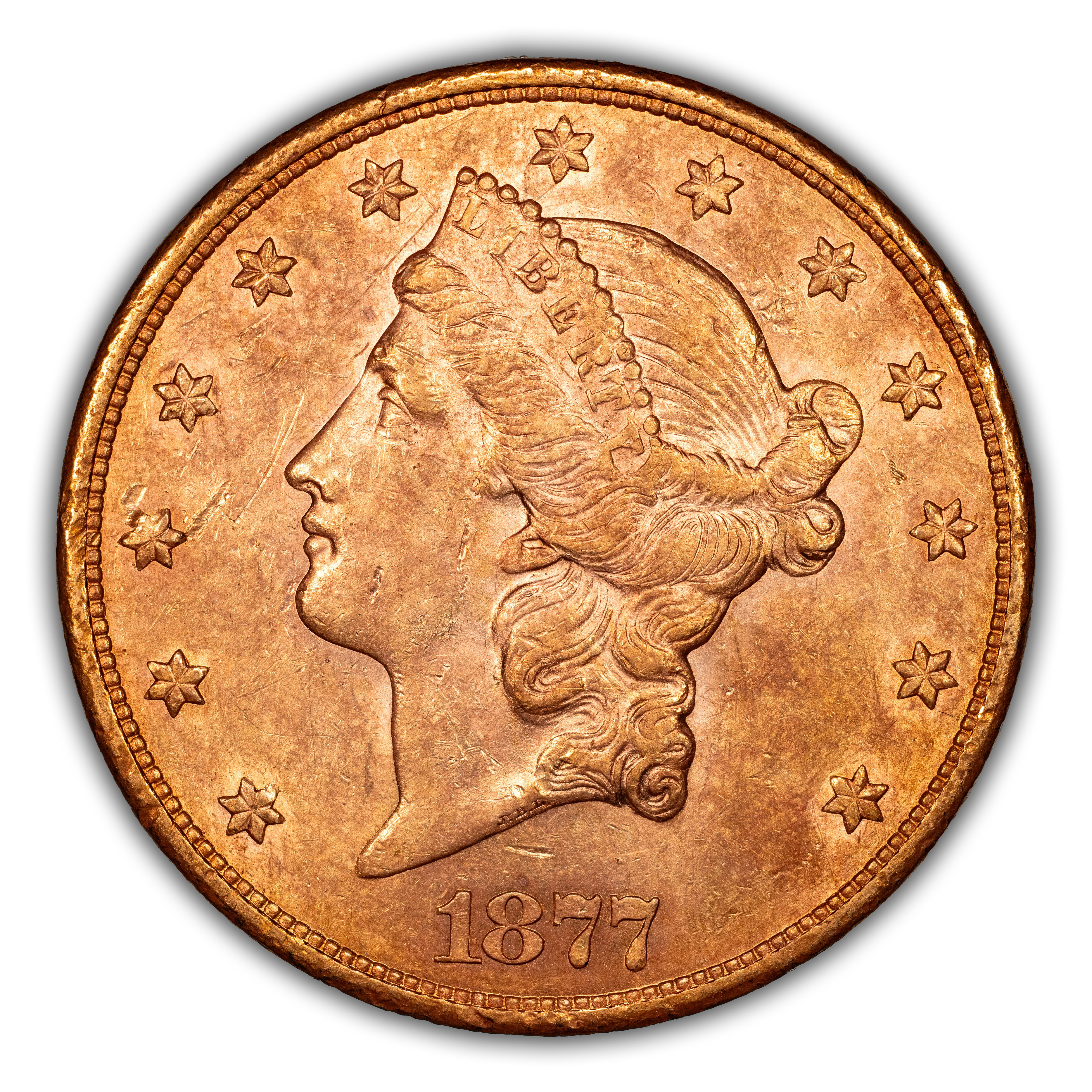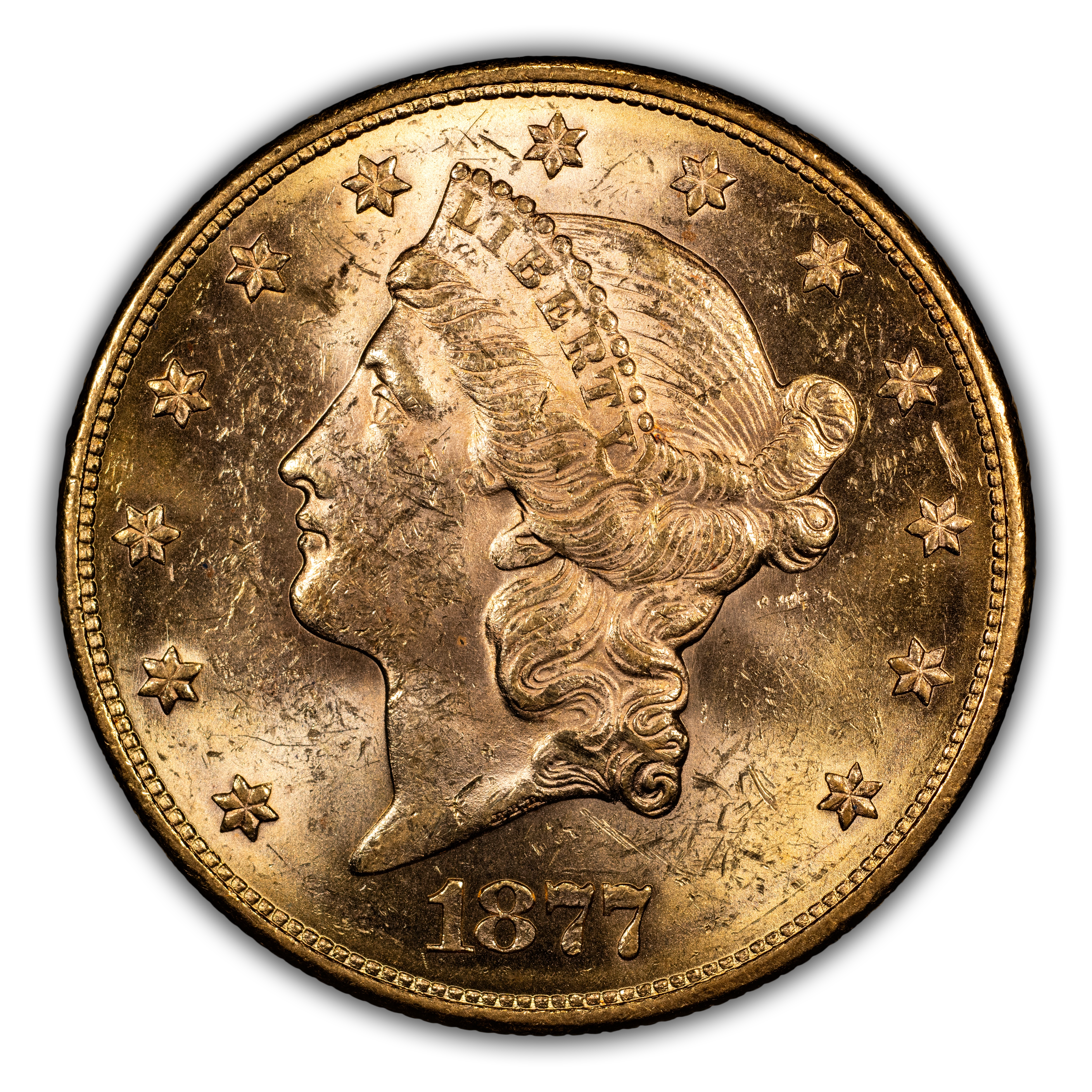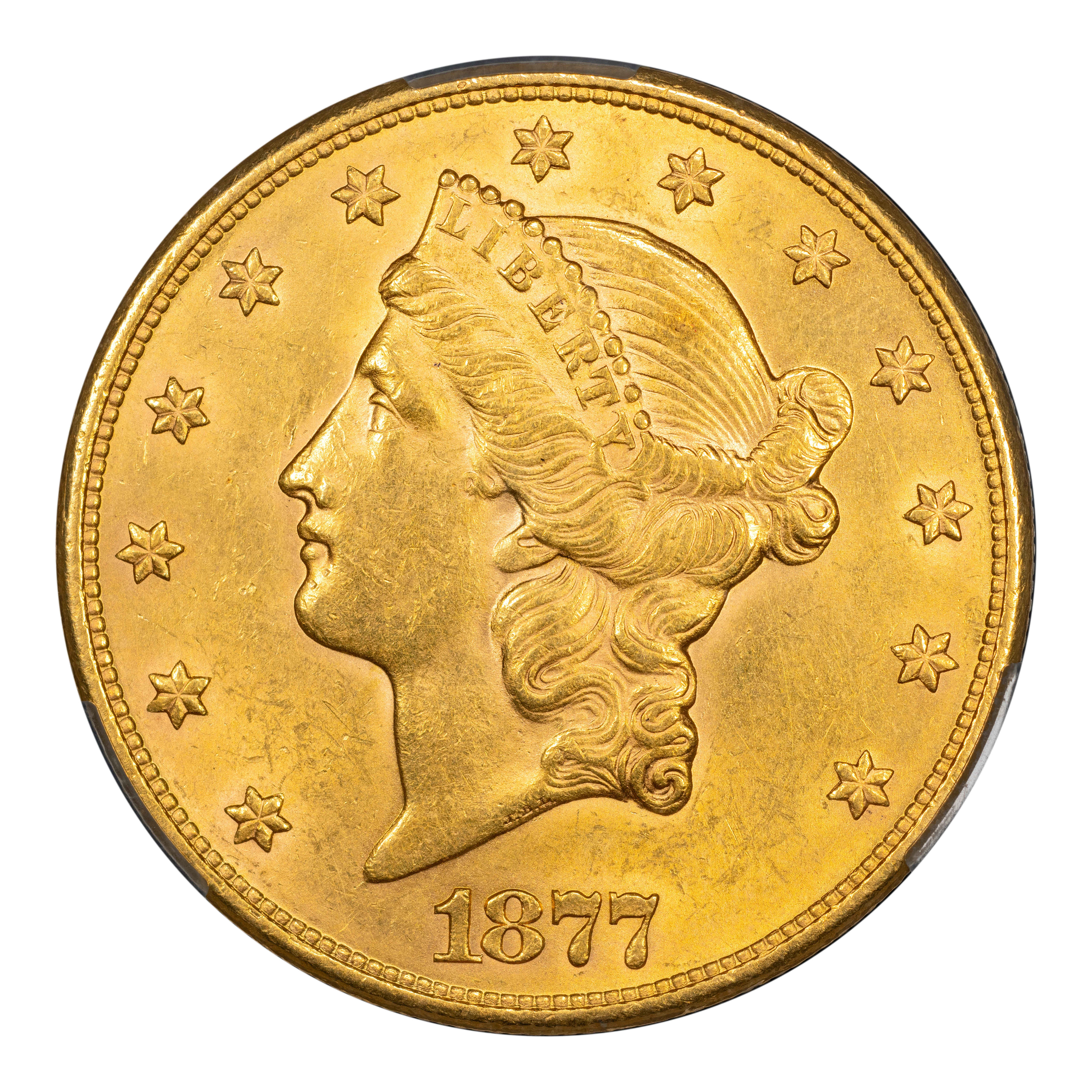 Reverse: Shielded eagle with wings outstretched holding arrows and olive branches. The words UNITED STATES OF AMERICA * TWENTY D. appear around the periphery. Mint mark, if any, appears below the eagle's tail, above the N in TWENTY.