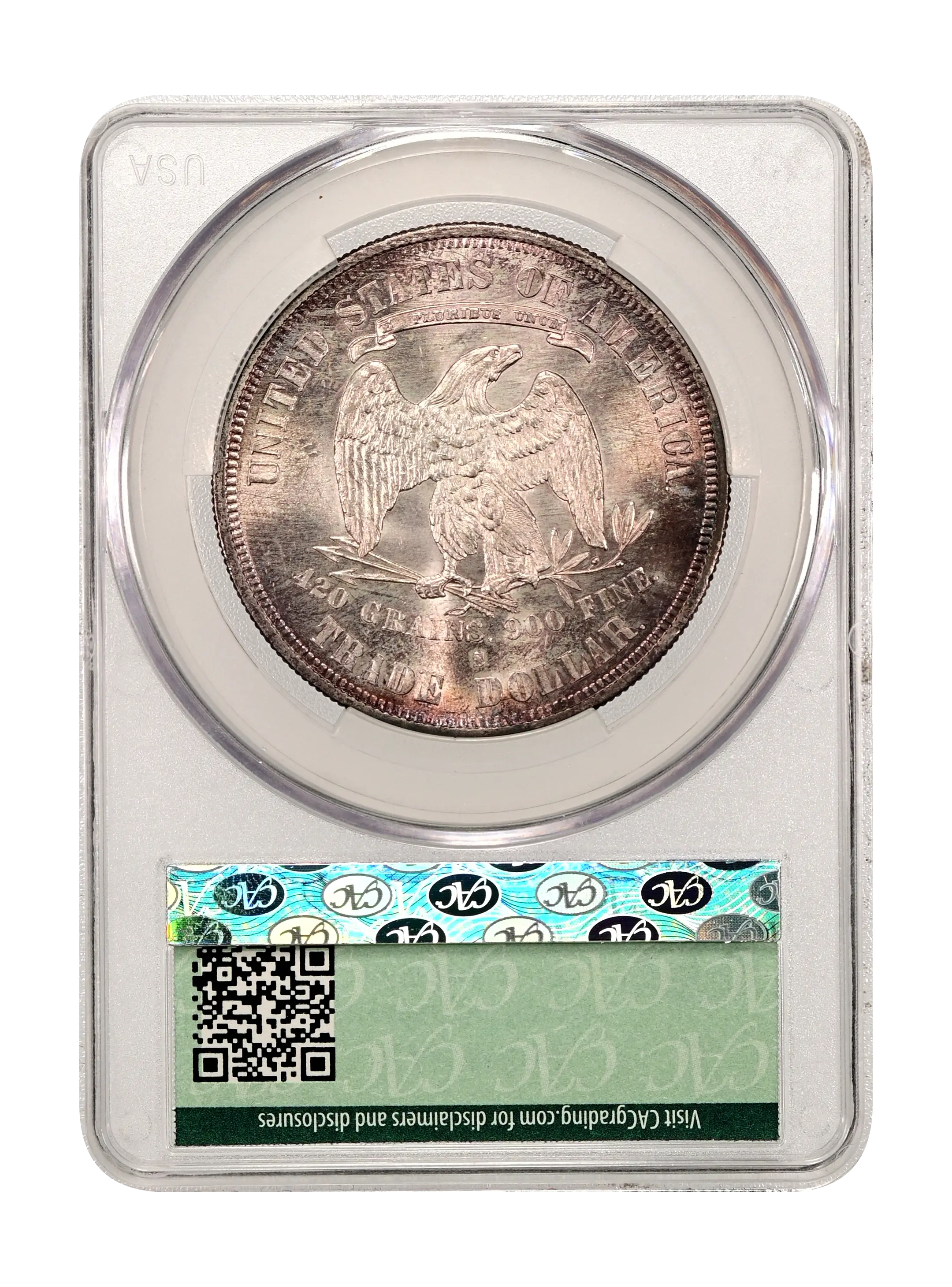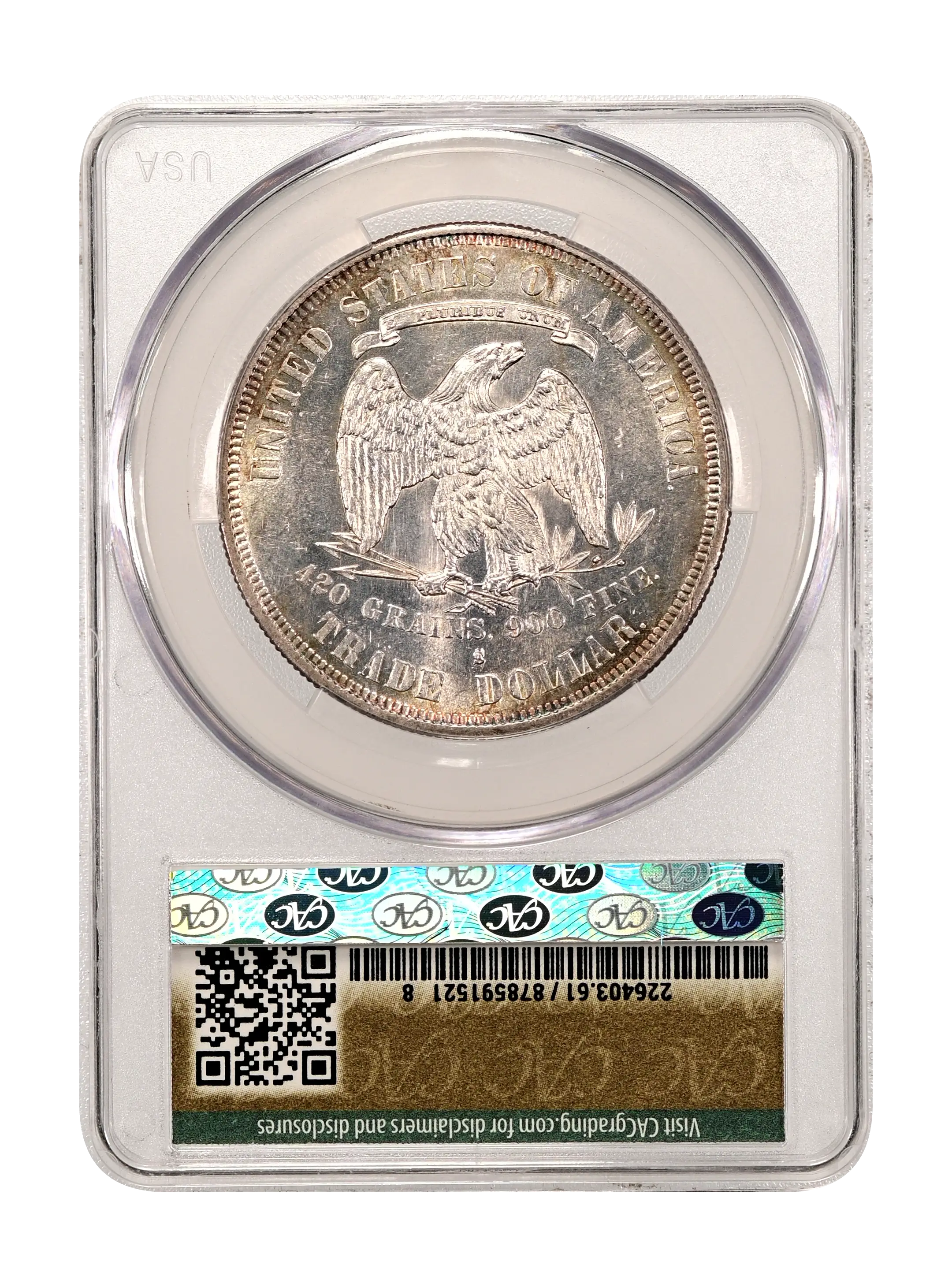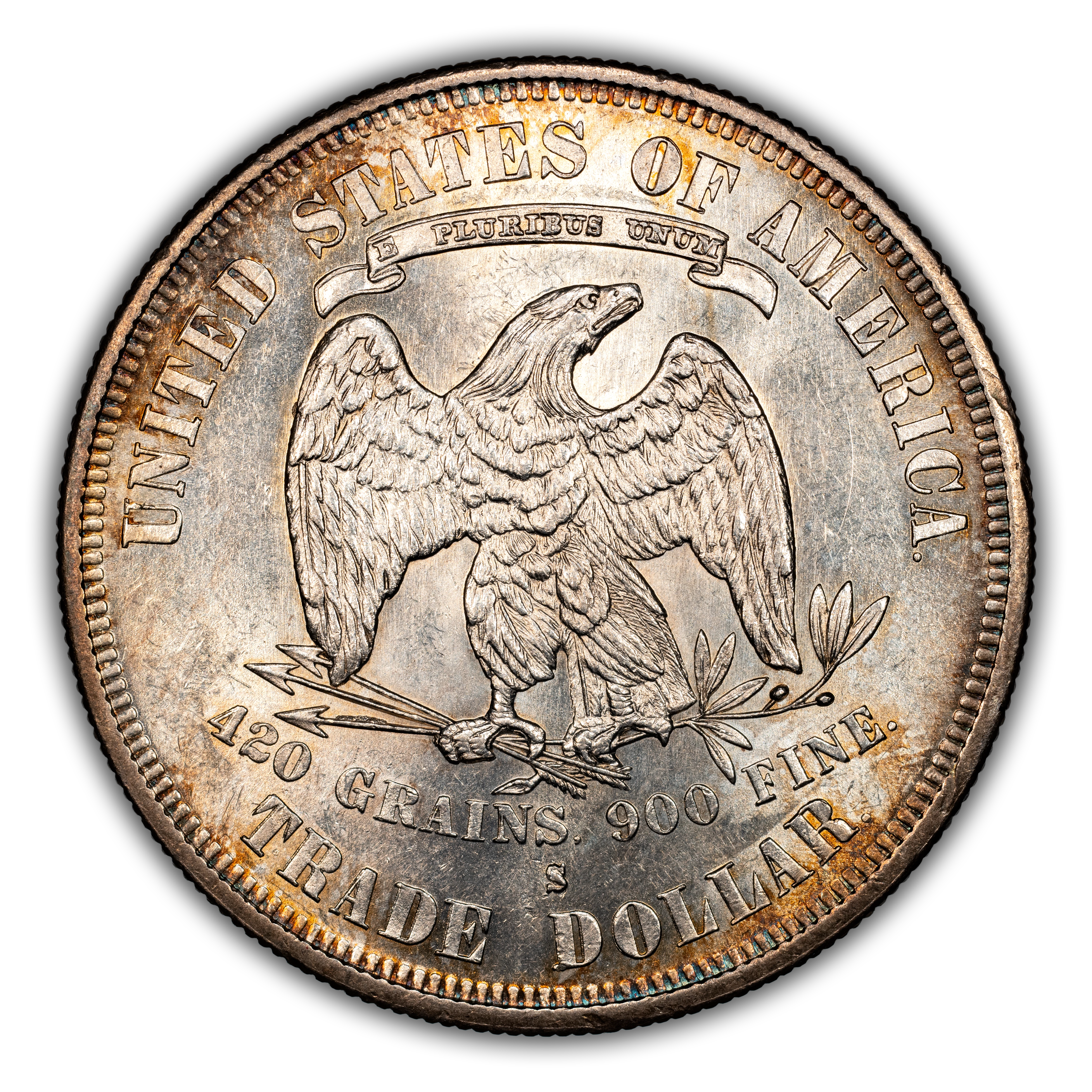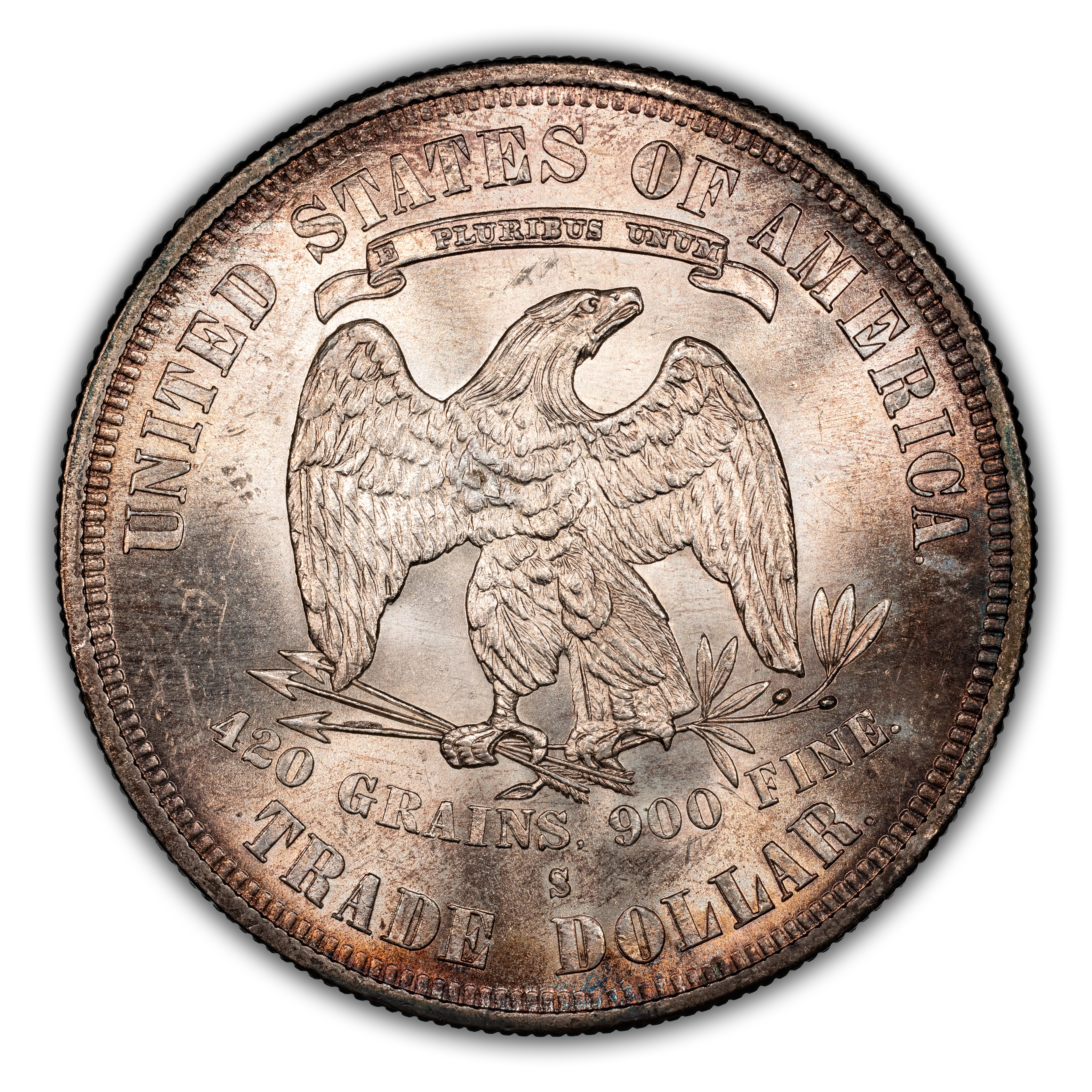 Reverse: An eagle is centered in the design with the weight of the coin listed below as "420 GRAINS. 900 FINE." The words UNITED STATES OF AMERICA and TRADE DOLLAR adorn the top and bottom periphery with a ribbon stating the motto E PLURIBUS UNUM above the eagle's head. The mint mark is positioned below the eagle and weight text, above the "E D" of TRADE DOLLAR. Type II reverse without the extra berry under the eagle's left (viewer's right) claw. Arrowhead ends over 2 in "420".