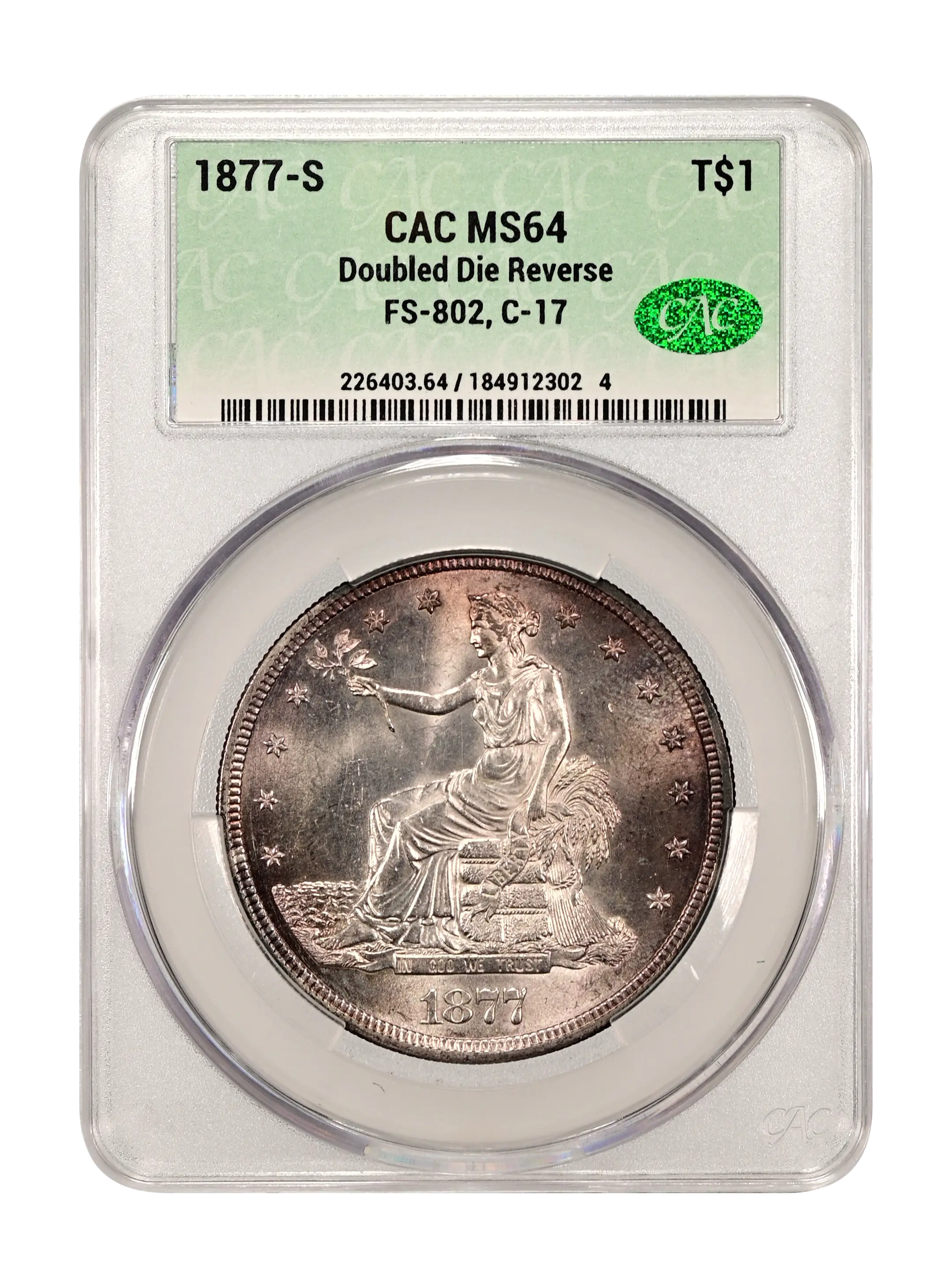 1877-S Doubled Die Reverse T$1 FS-802, C-17 CAC MS64