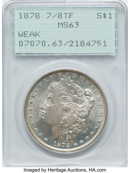 1878 7/8TF $1 PCGS/CAC MS63 (Weak, VAM-33, Double Legs)