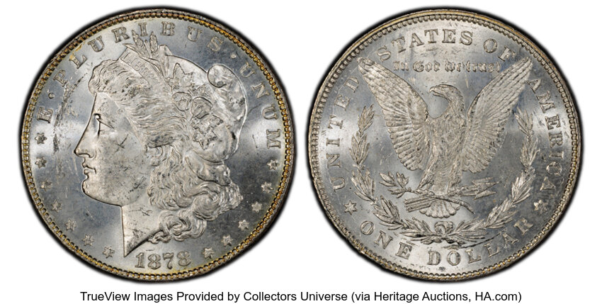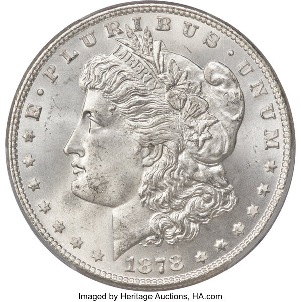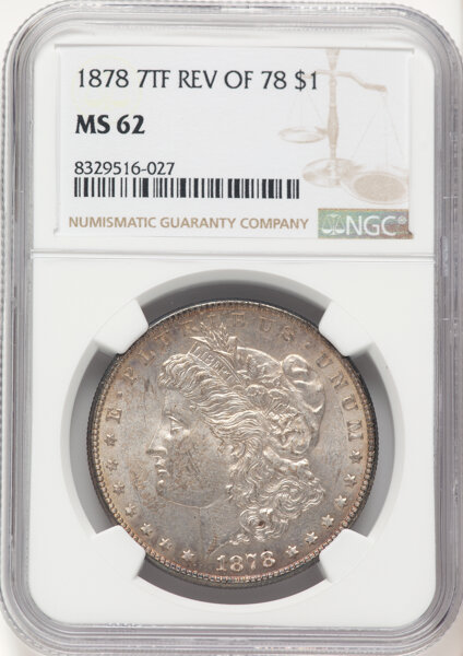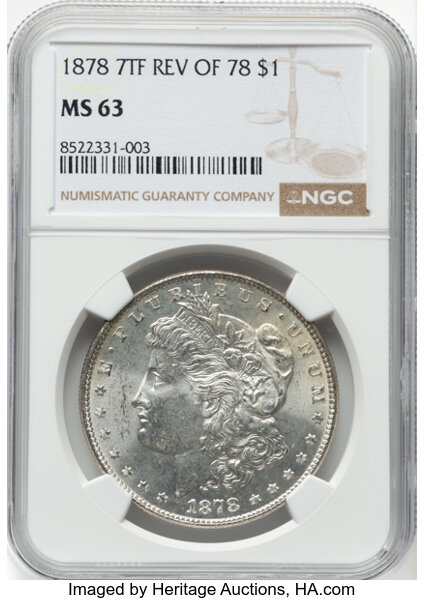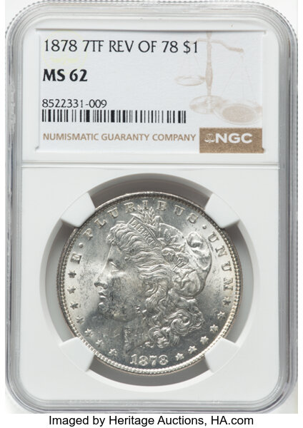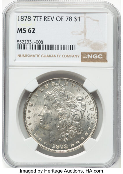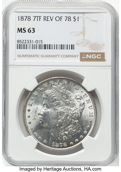 Following the removal of the supernumerary eighth tail feather on the reverse's bald eagle, a bird that normally has only seven tail feathers, the 1878 7TF followed. This coin exists in a few varieties, including the Second Reverse with flat breast on eagle and long arrow shaft, Second Reverse with flat breast on eagle and short arrow shaft, the Third Reverse (Reverse of 1879) with round breast on eagle and slanting top arrow feather, Third Reverse with doubled obverse and no lines in wheat, and Third Reverse (Reverse of 1879) with round breast on eagle and slanting top arrow feather but lines in the wheat leaves. While scarcer in Gem MS grades than circulated and further difficult with PL or DMPL designations than non-PL, the 1878 7TF Morgan dollar is frequently encountered across the marketplace in most of the actively traded grade levels.