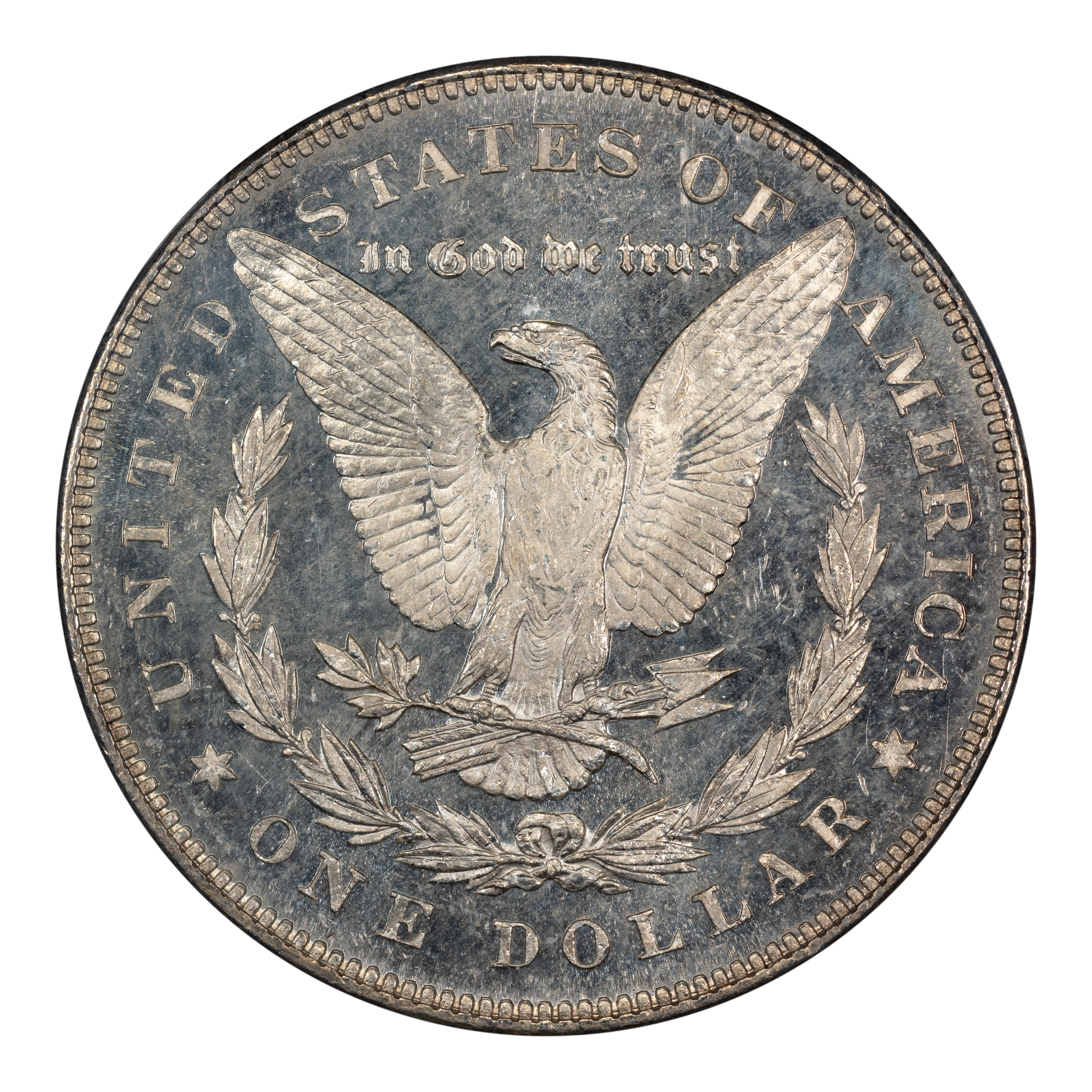 Reverse: The heraldic eagle is centered holding a bunch of arrows and branch surrounded by and olive leaves. The words UNITED STATES OF AMERICA * ONE DOLLAR frame the periphery. Mint mark, if any, appears above the letters DO of DOLLAR.