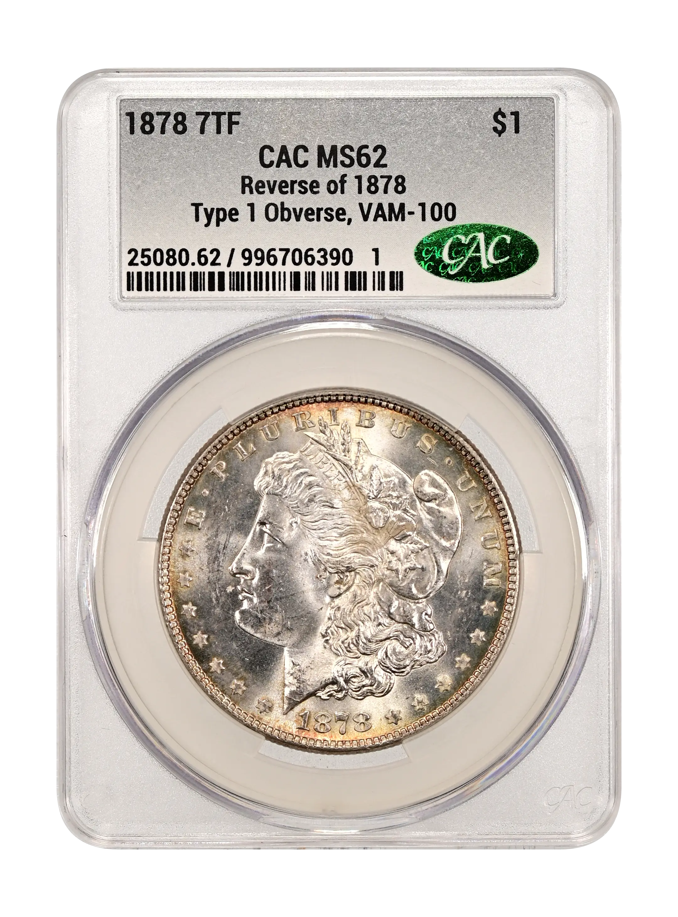 1878 7TF Reverse of 1878 $1 Type 1 Obverse, VAM-100 CAC MS62