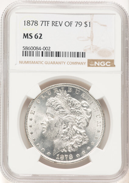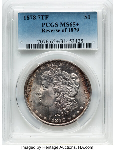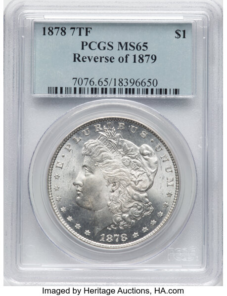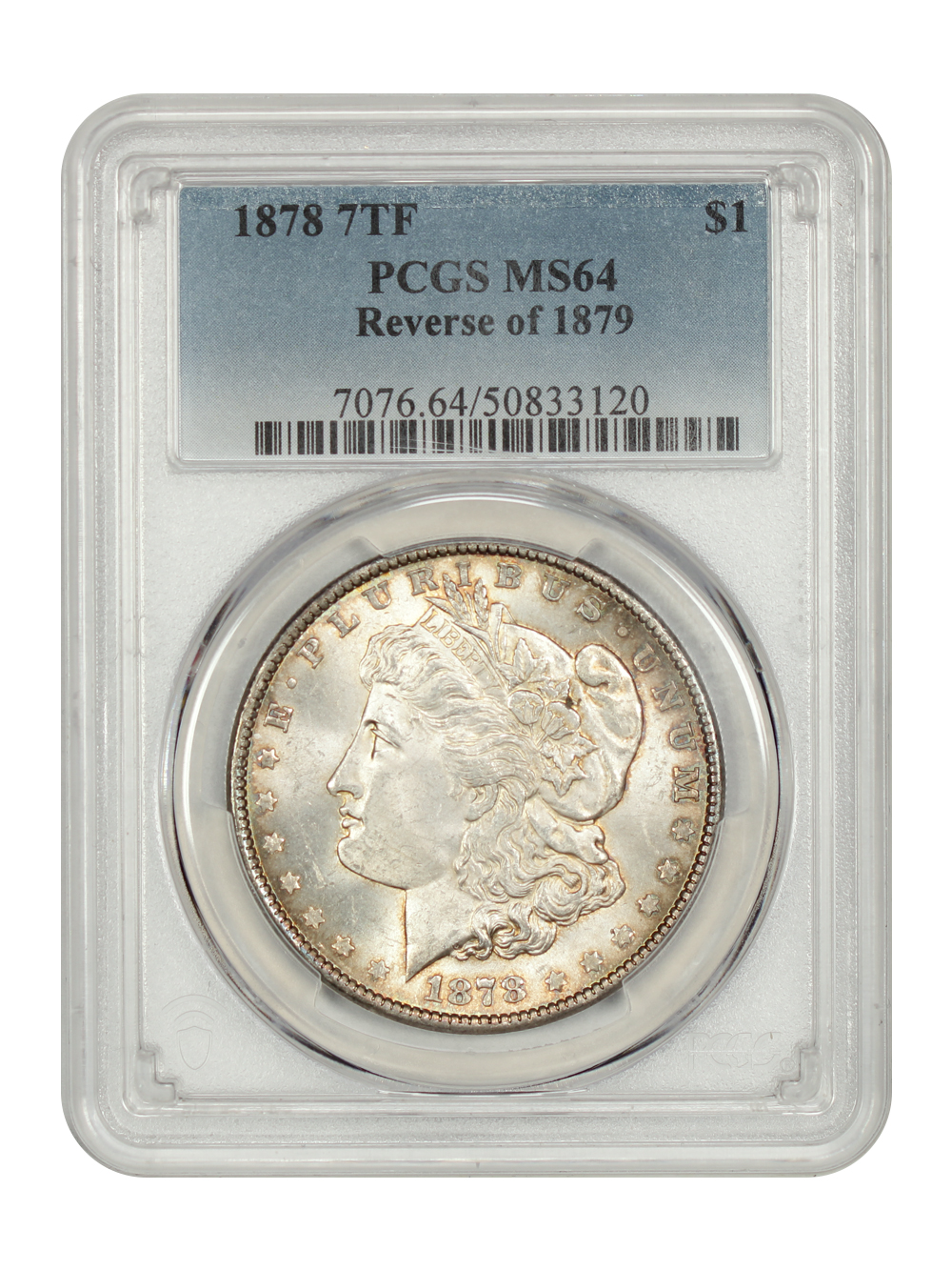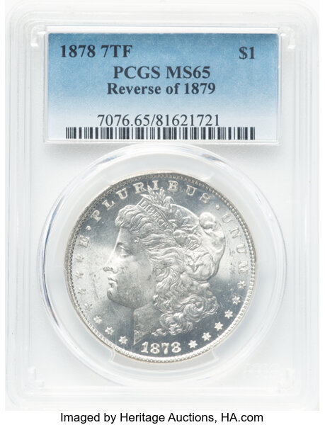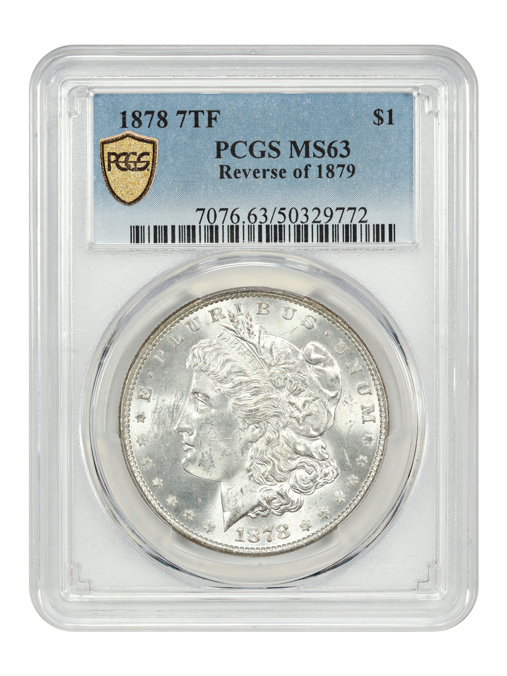 The 1878 7TF Reverse of 1879 Morgan dollar is distinguishable from the 1878 7TF Reverse of 1878 by counting the number of tail feathers and determining whether the eagle's breast is flat or rounded, with an eagle accompanied by seven tail feathers and a rounded breast indicative of the Reverse of 1879. While much scarcer than the 1878 7TF Reverse of 1878, the 1878 7TF Reverse of 1879 is readily available in the marketplace though is quite popular thus commands strong premiums especially in the Gem, PL, and DMPL grades.