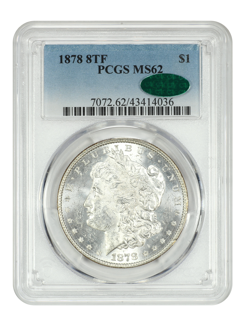 The 1878 8TF dollar is a relatively scarce first issue of the long-running Morgan series, considered by many as the most popular of all United States coins. Hard to find in all grades, the 1878 8TF is particularly challenging in the Gem MS range and up, with PLs and DMPLs even harder though obtainable for a cost. The reasons behind the relative short issuance of the eight tail feather variety has decidedly ornithological origins: American bald eagles have only seven tail feathers as correctly seen on all Morgan dollars minted after 1878.