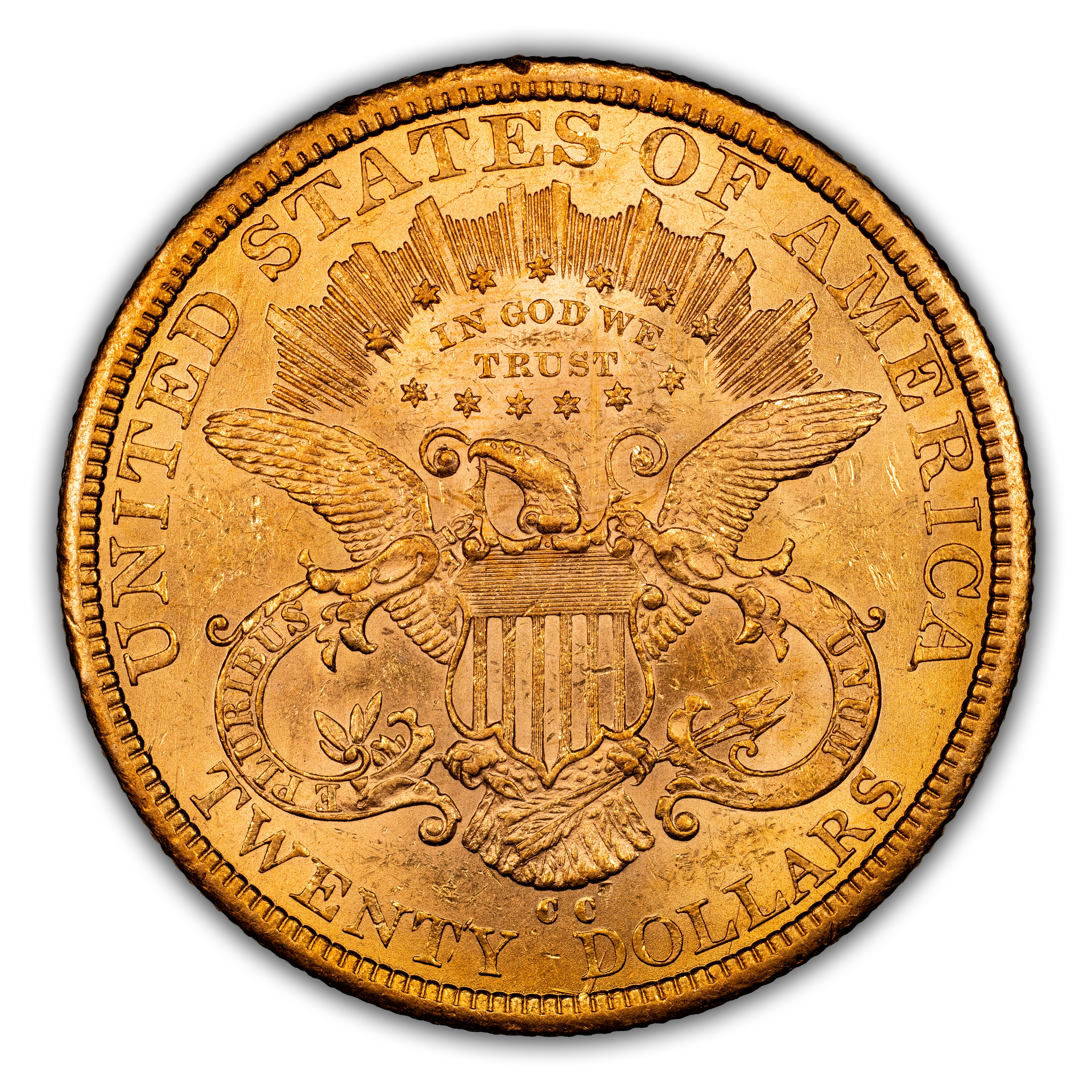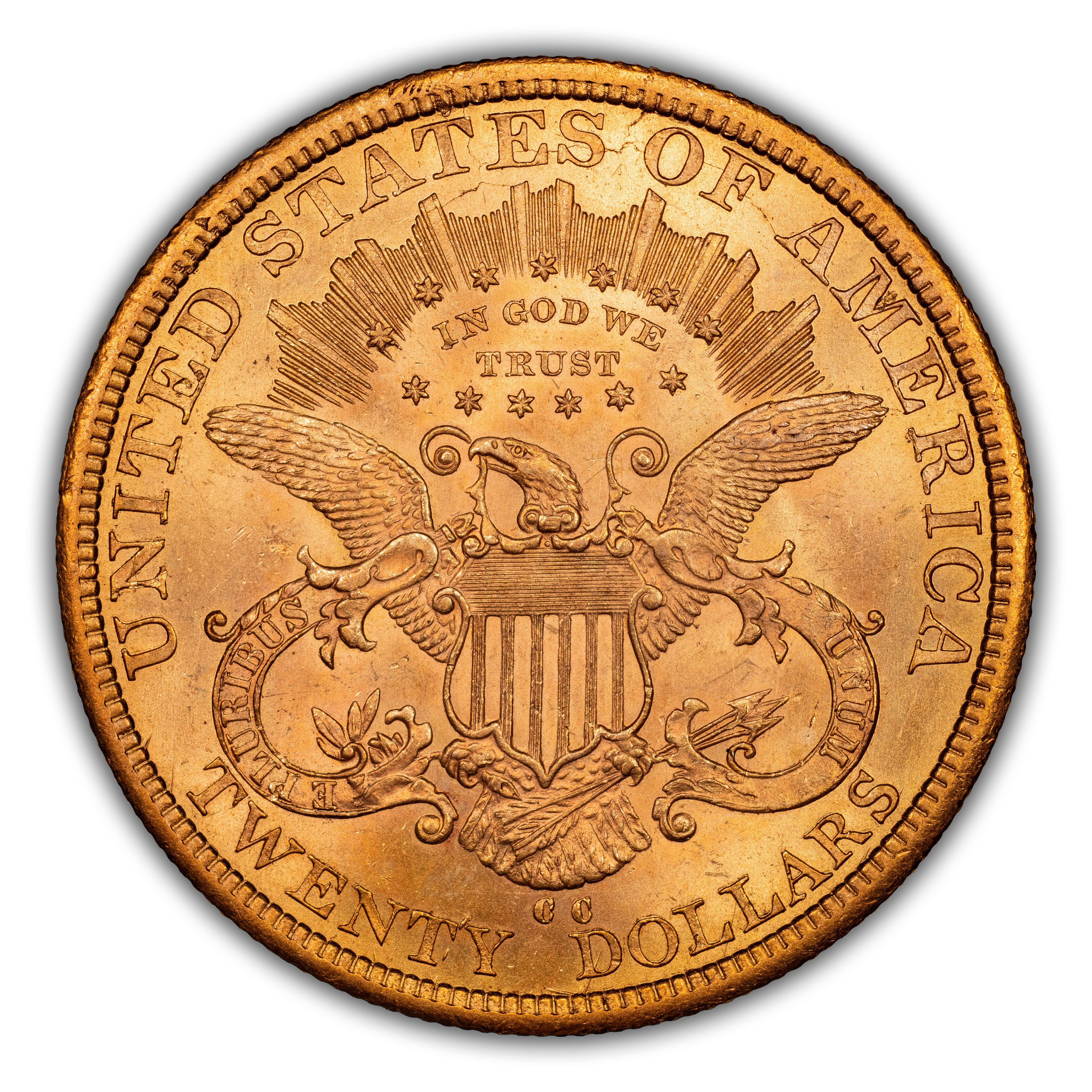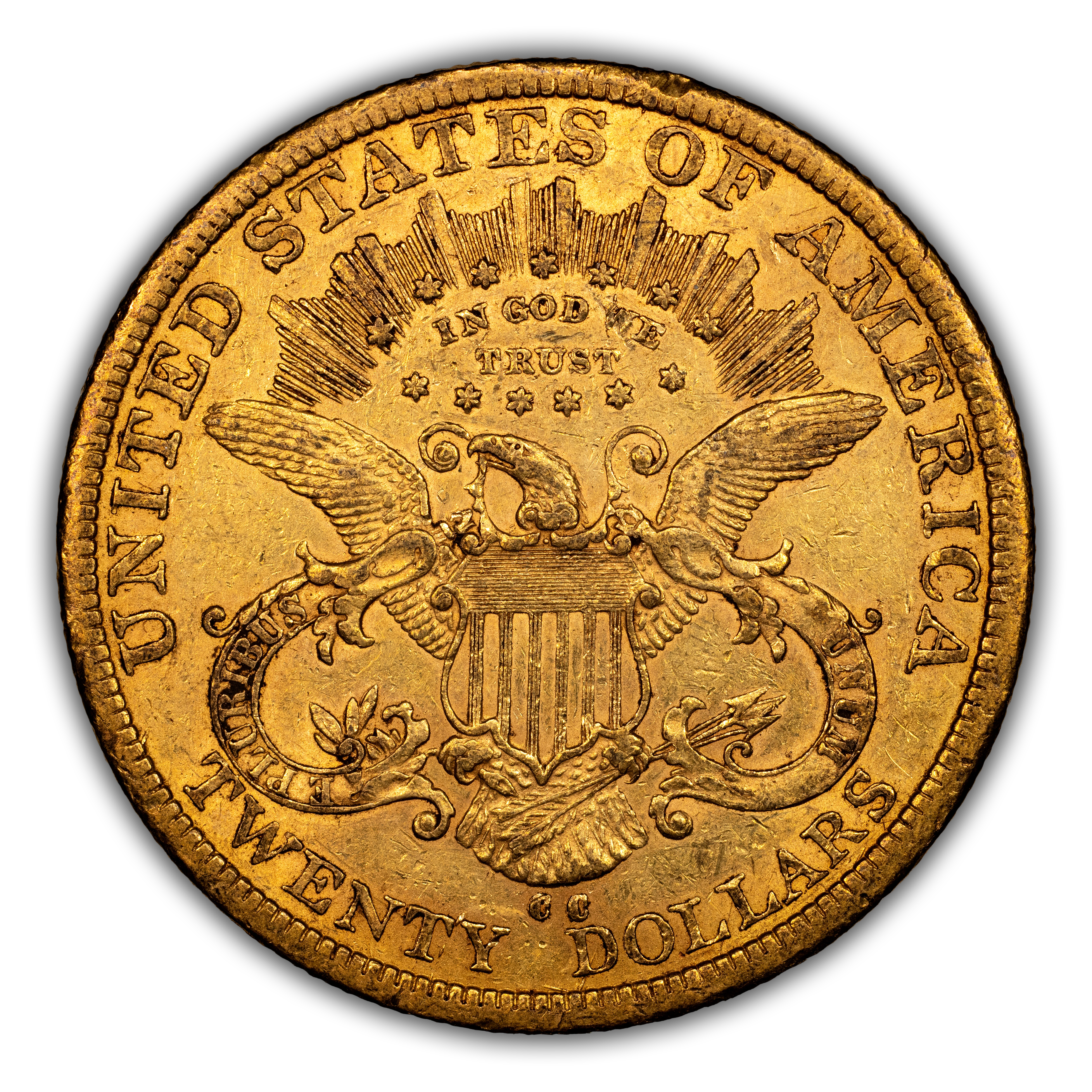 Reverse: Shielded eagle with wings outstretched holding arrows and olive branches. The words UNITED STATES OF AMERICA * TWENTY D. appear around the periphery. Mint mark, if any, appears below the eagle's tail, above the N in TWENTY.