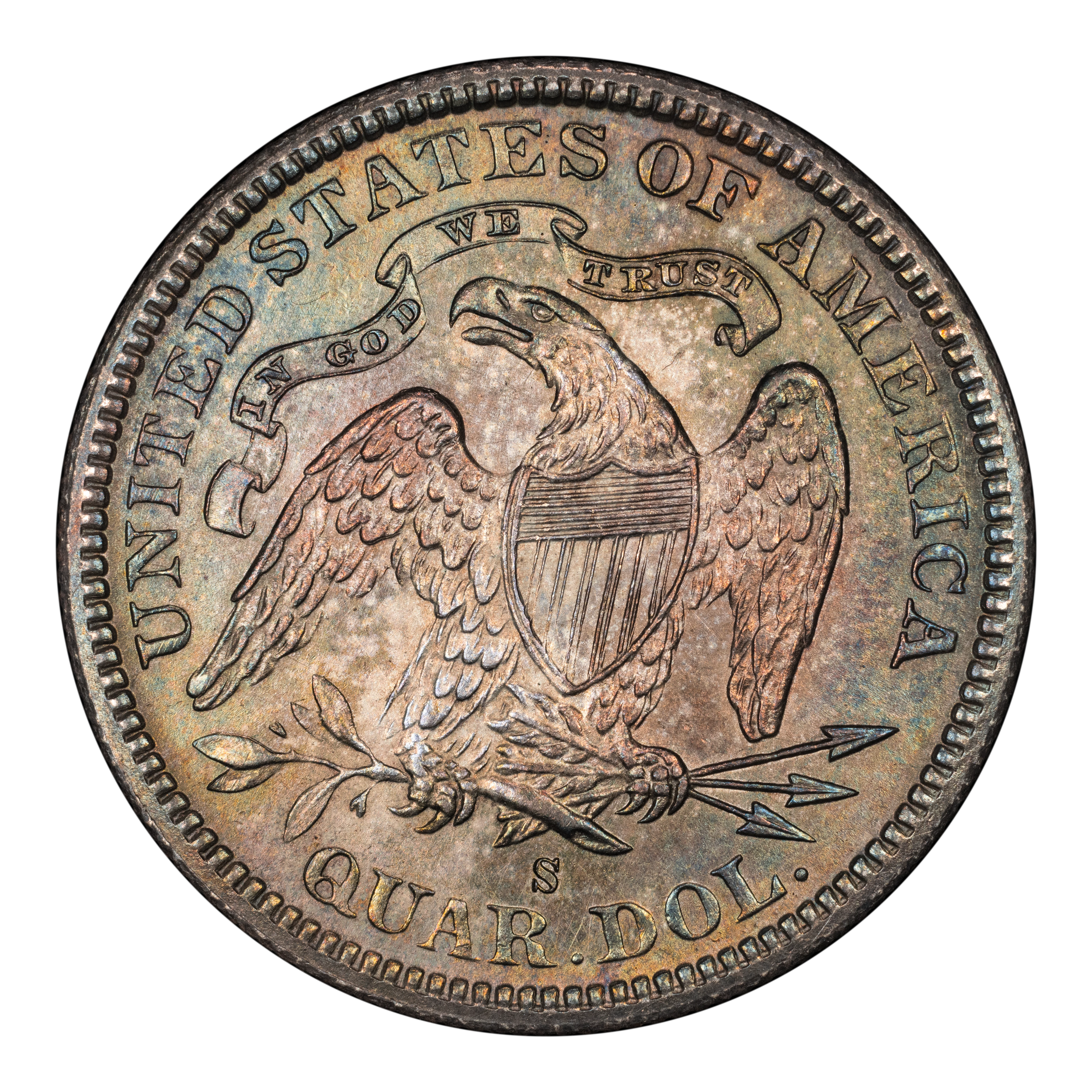 Reverse: The heraldic eagle is centered in the design with the words UNITED STATES OF AMERICA and QUAR. DOL. around the periphery. A ribbon above the eagle's head bears the motto IN GOD WE TRUST