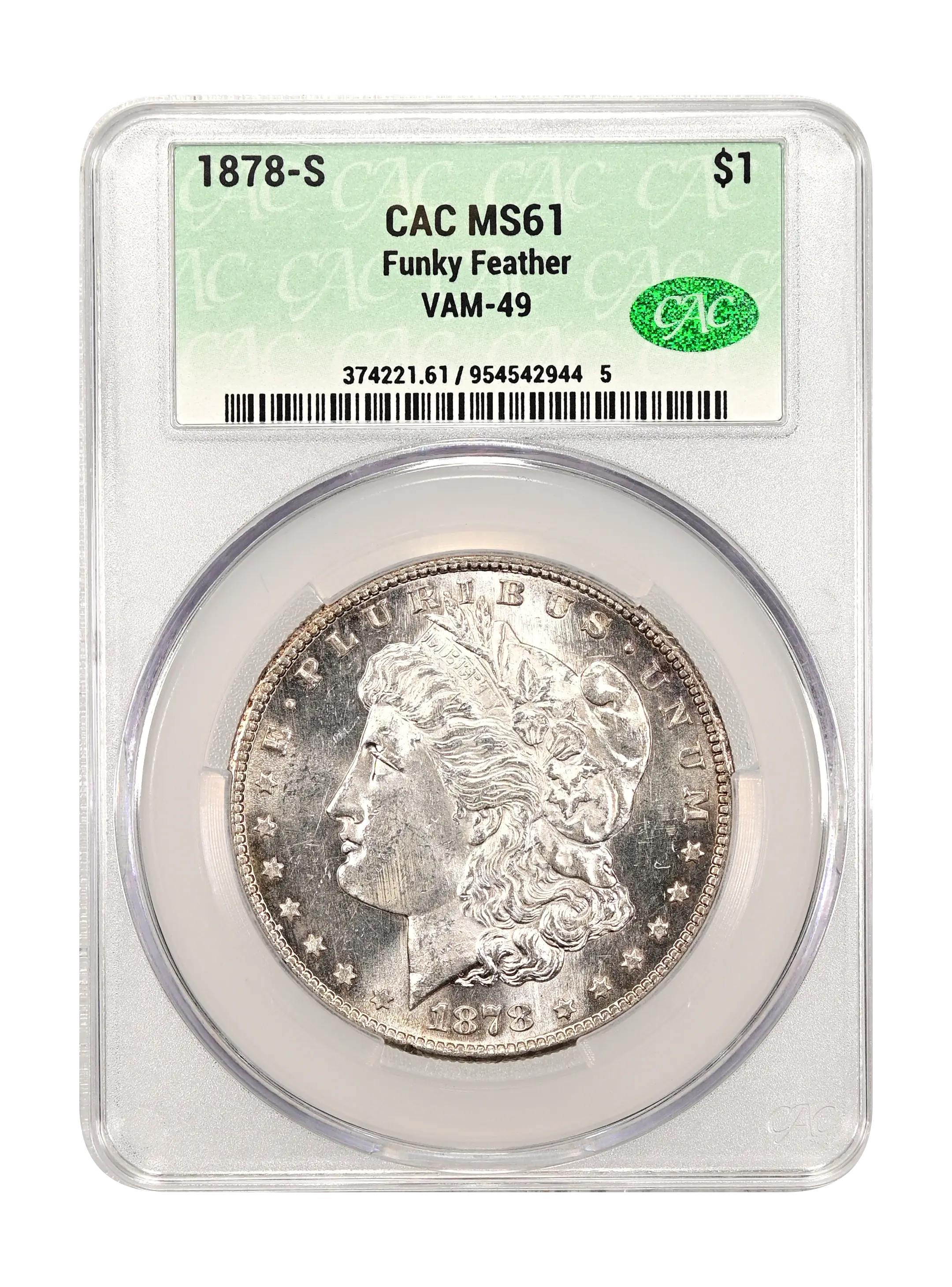 1878-S Funky Feather $1 VAM-49 CAC MS61