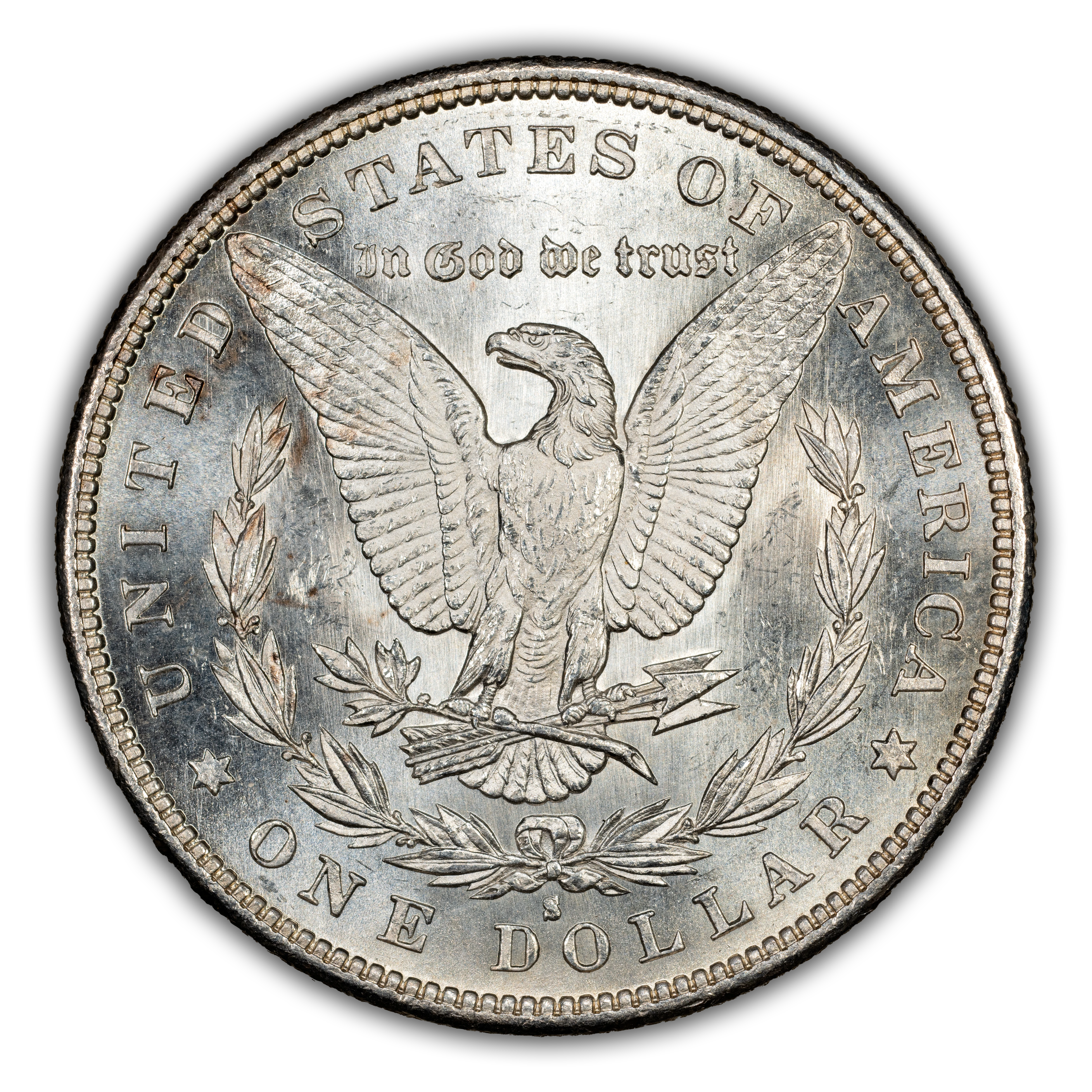 Reverse: The heraldic eagle is centered holding a bunch of arrows and branch surrounded by and olive leaves. The words UNITED STATES OF AMERICA * ONE DOLLAR frame the periphery. Mint mark, if any, appears above the letters DO of DOLLAR.